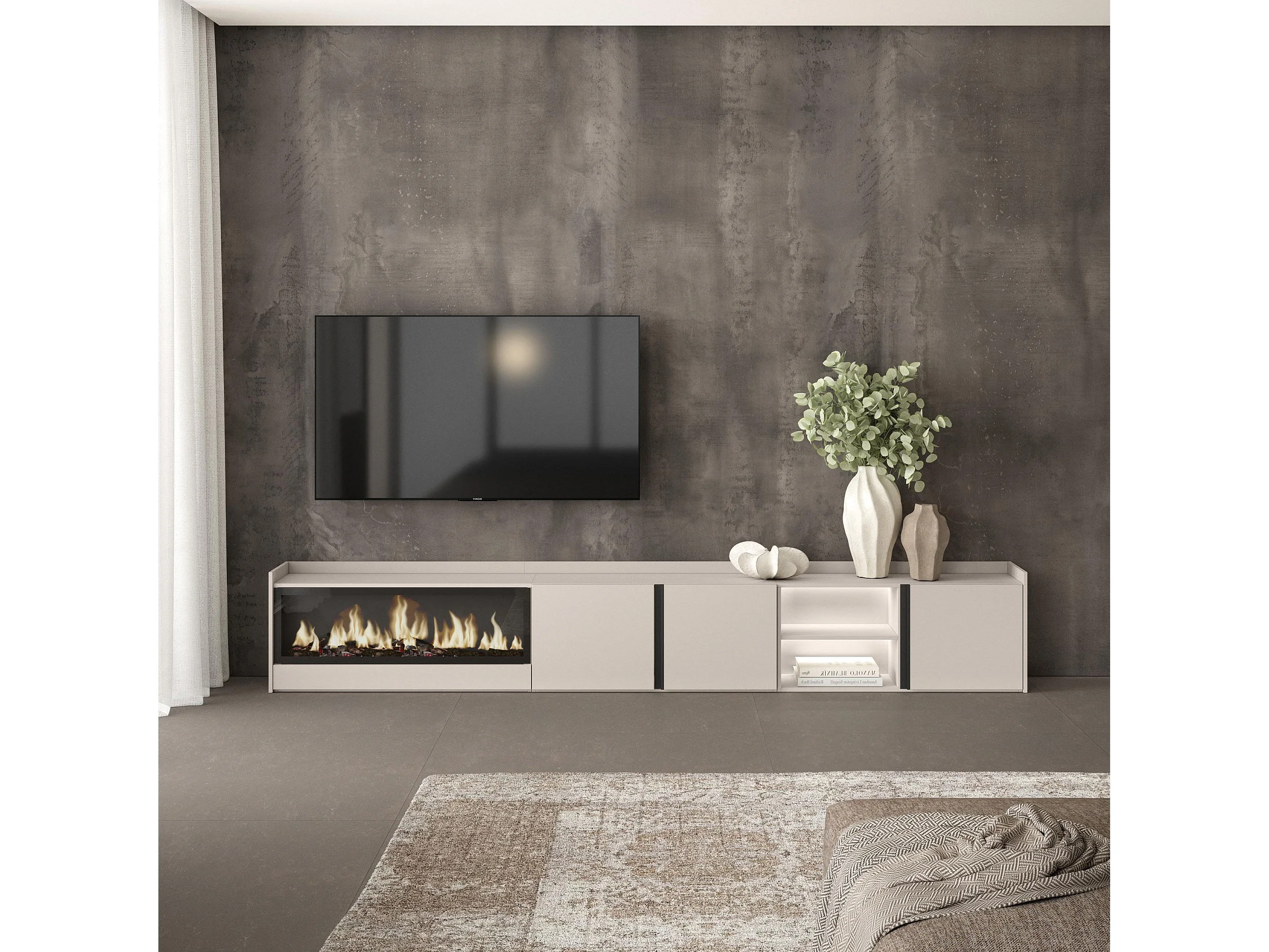 TV-Schrank, Lowboard, 315x50x35 cm, Für TV-Geräte bis zu 80", Elektrokamin XXL, LED, Beige