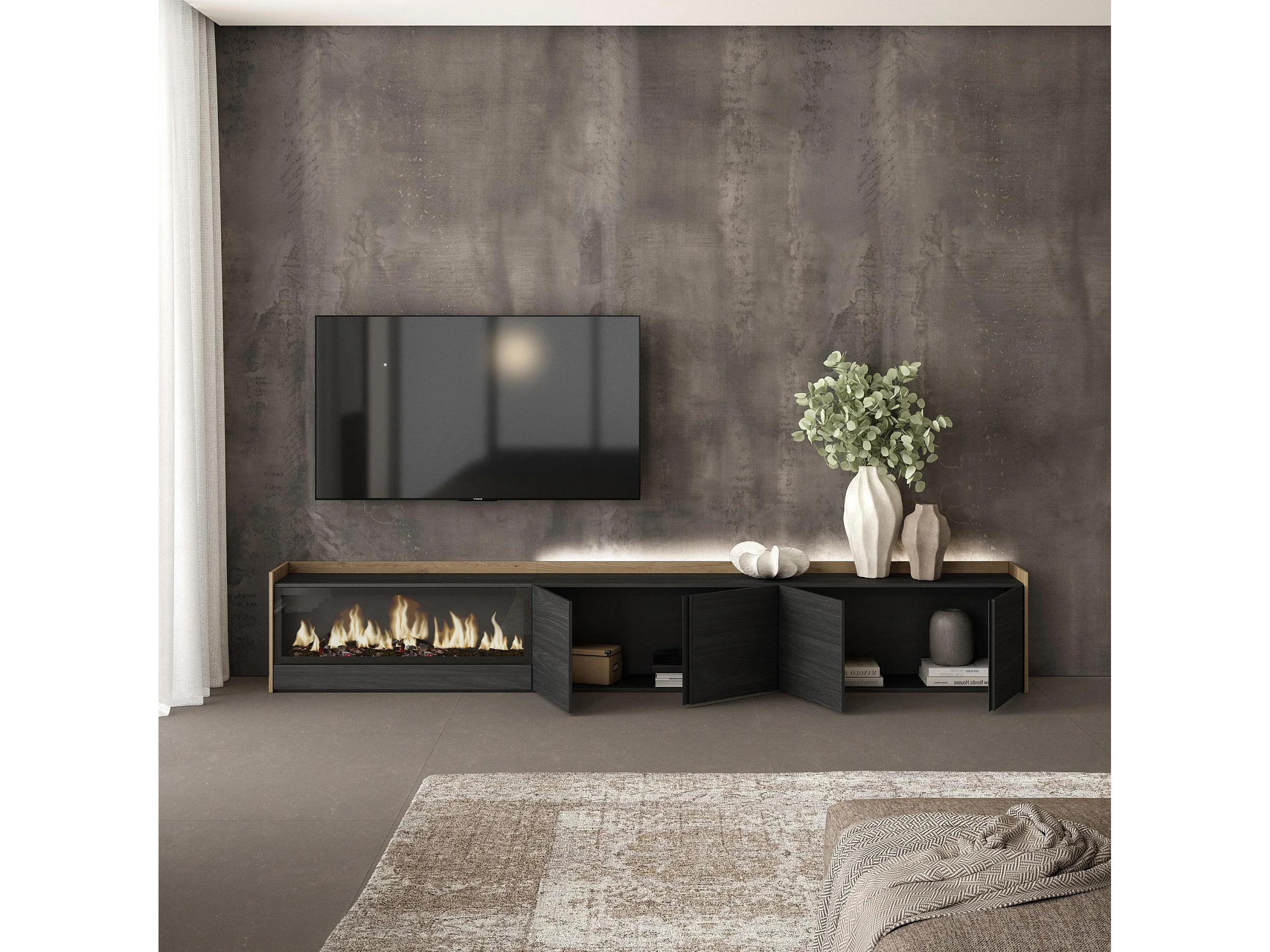 TV-Schrank, Lowboard, 315x50x35 cm, Für TV-Geräte bis zu 80", Elektrokamin XXL, LED, Schwarz Eiche