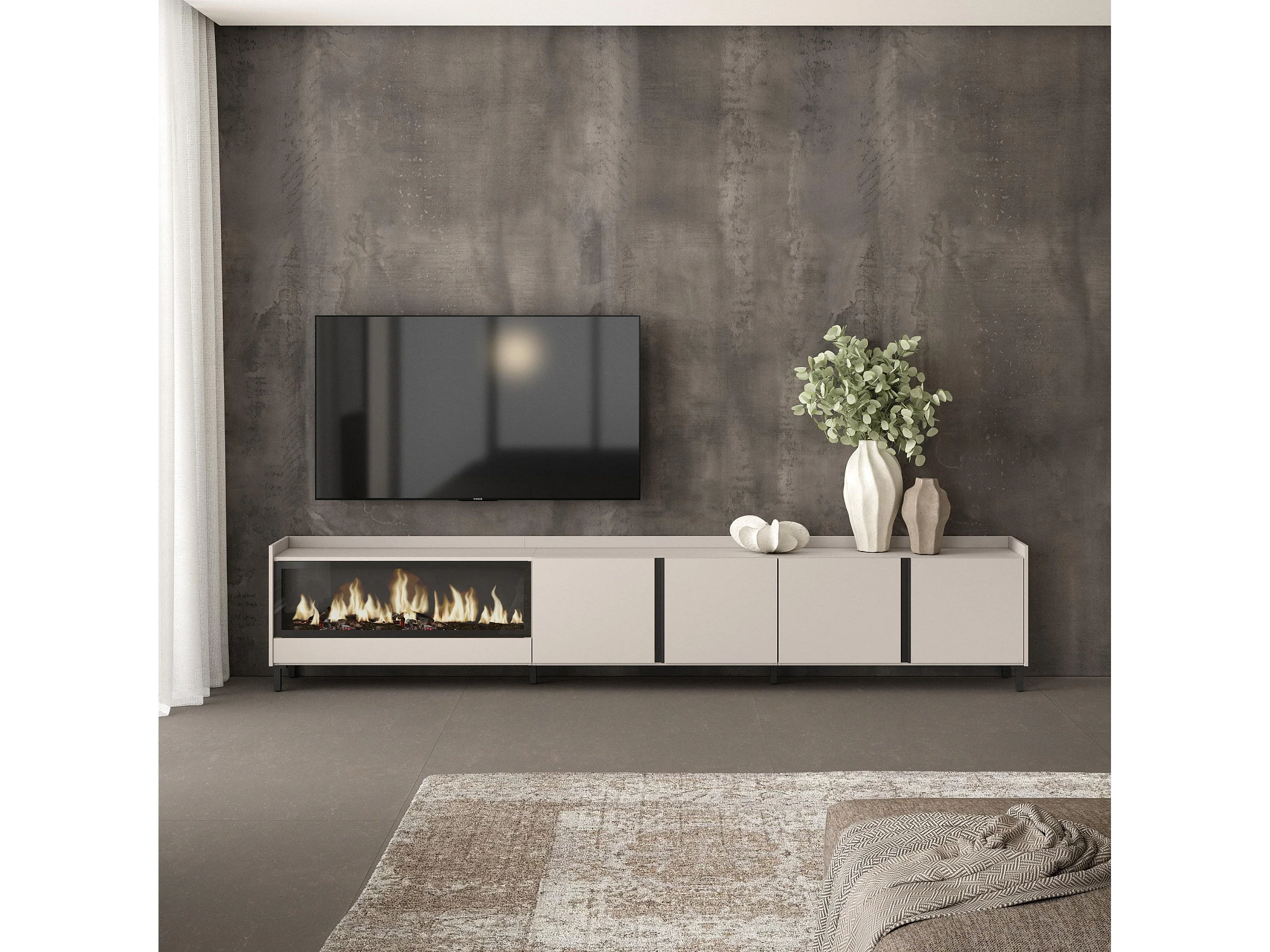 TV-Schrank, Lowboard, 315x61x35 cm, Für TV-Geräte bis zu 80", Elektrokamin XXL, Industriedesign, Beige