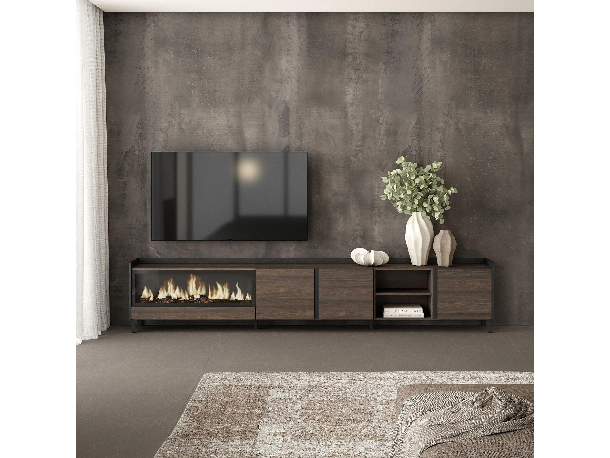 TV-Schrank, Lowboard, 315x61x35 cm, Für TV-Geräte bis zu 80", Elektrokamin XXL, Industriedesign, Dunkler Eiche und Schwarz