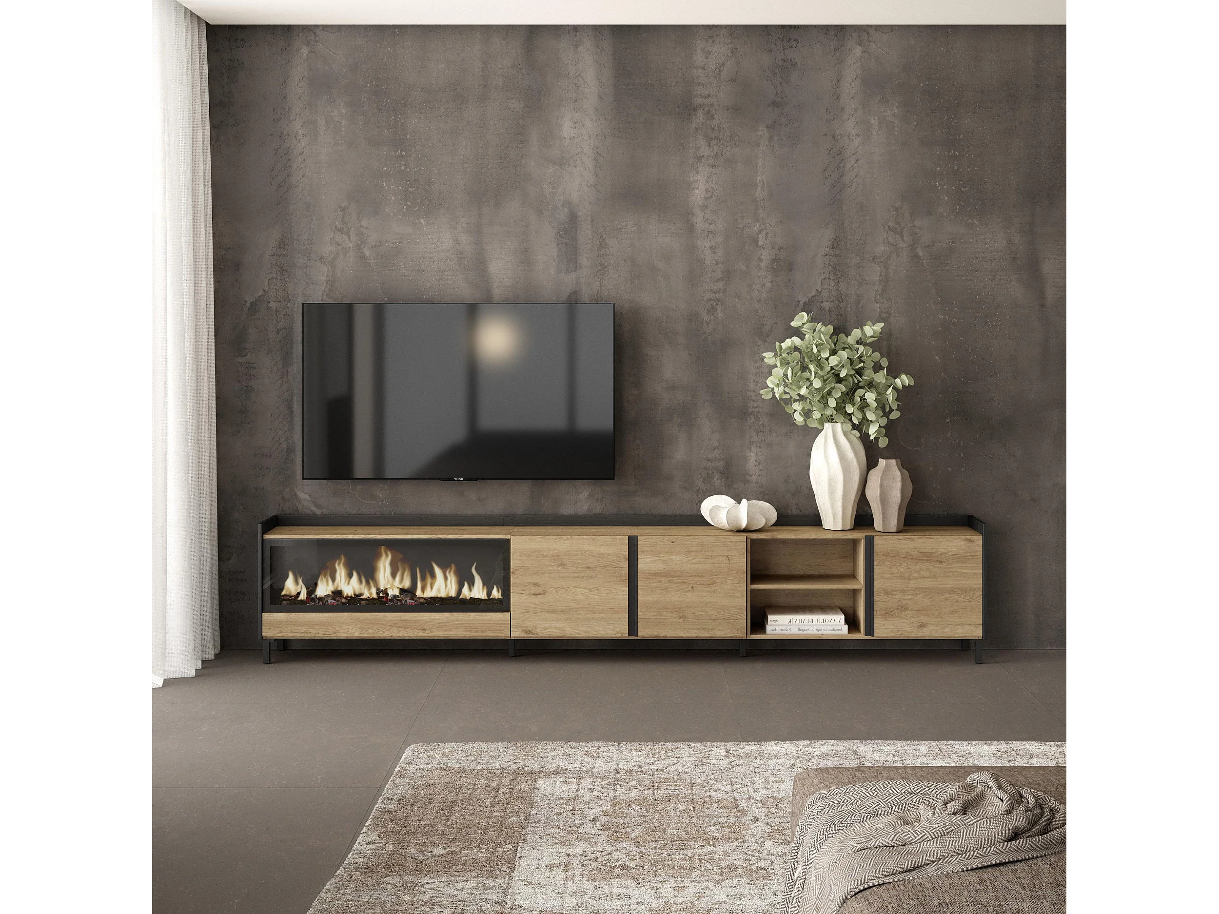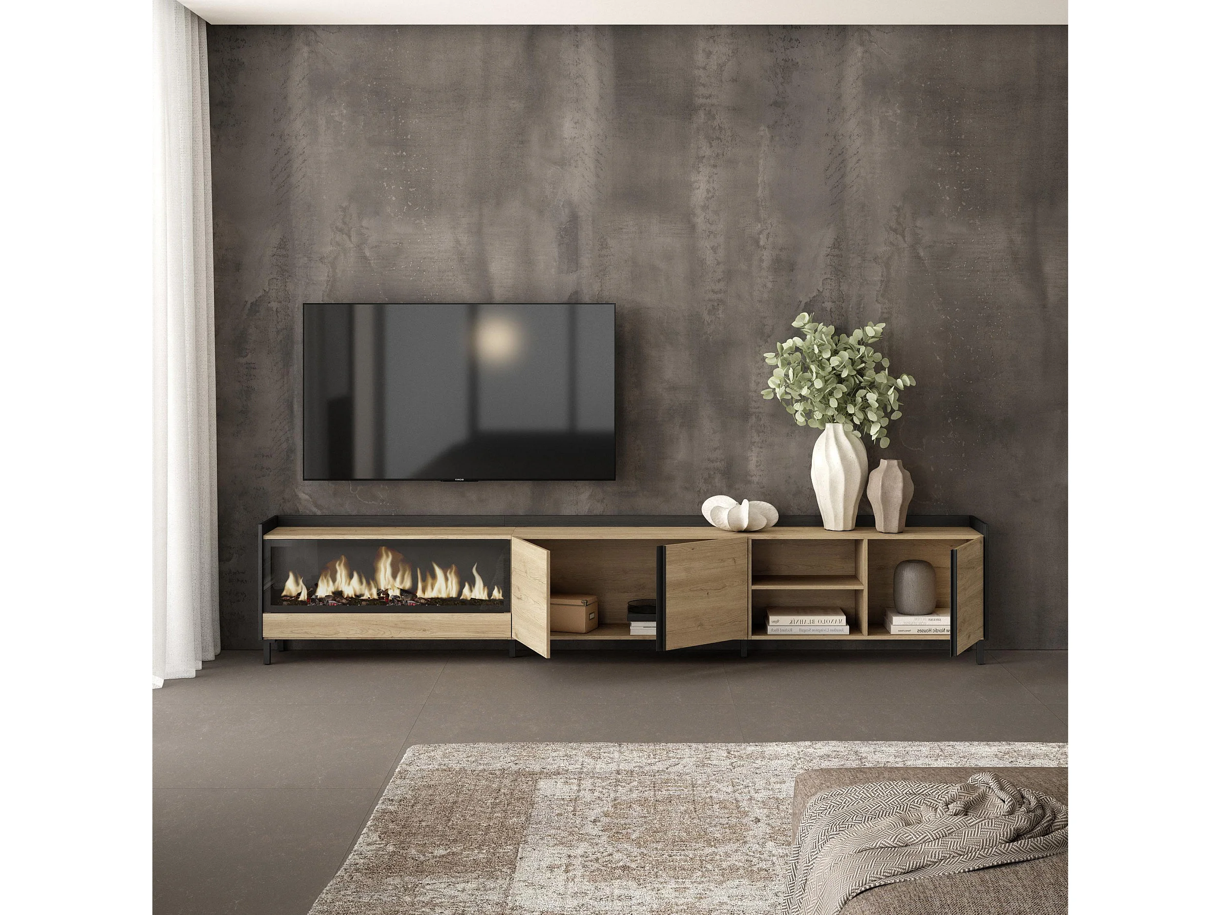 TV-Schrank, Lowboard, 315x61x35 cm, Für TV-Geräte bis zu 80", Elektrokamin XXL, Industriedesign, Eiche Schwarz