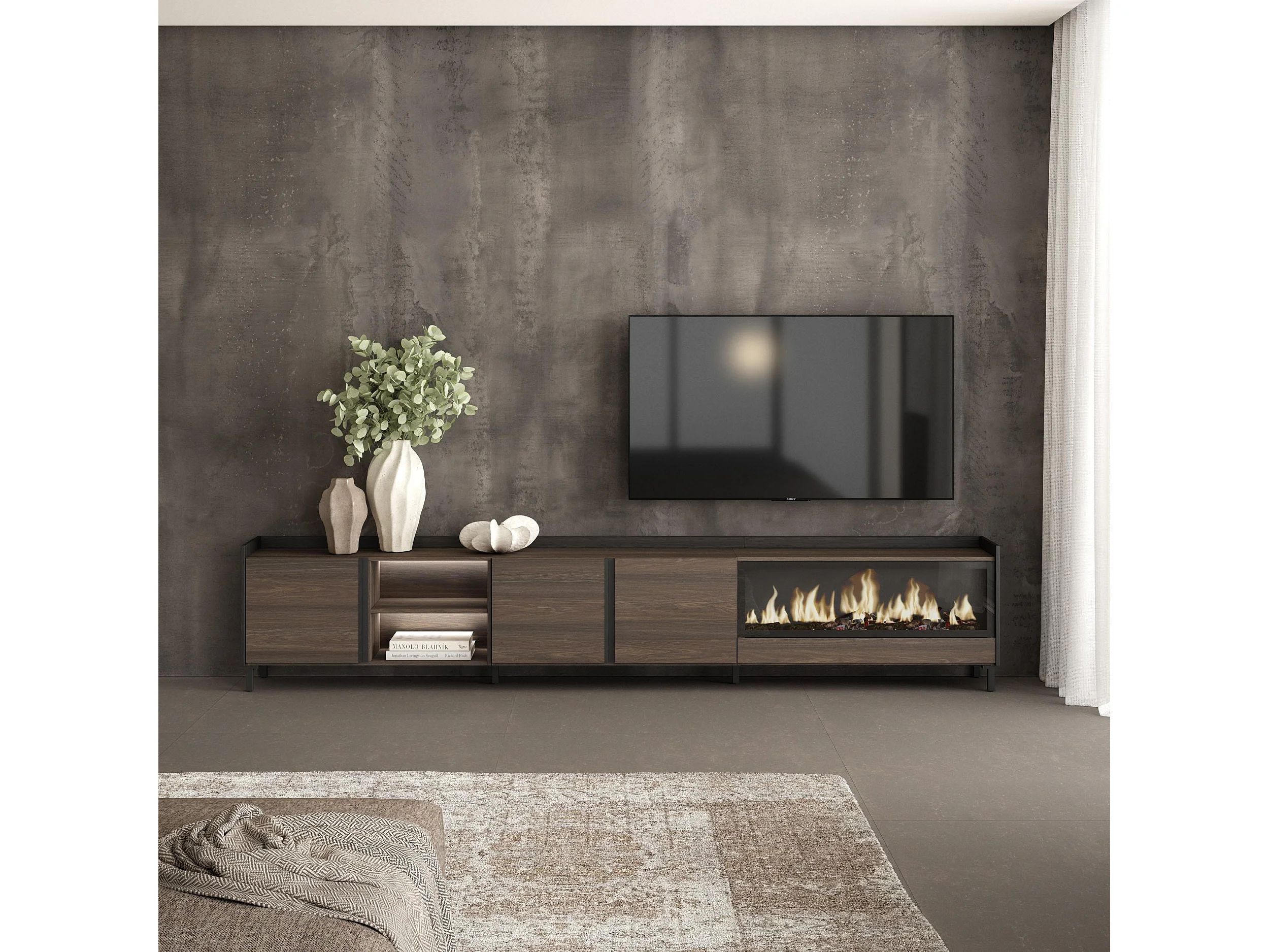 TV-Schrank, Lowboard, 315x61x35 cm, Für TV-Geräte bis zu 80", Elektrokamin XXL, Industriedesign, LED, Dunkler Eiche und Schwarz