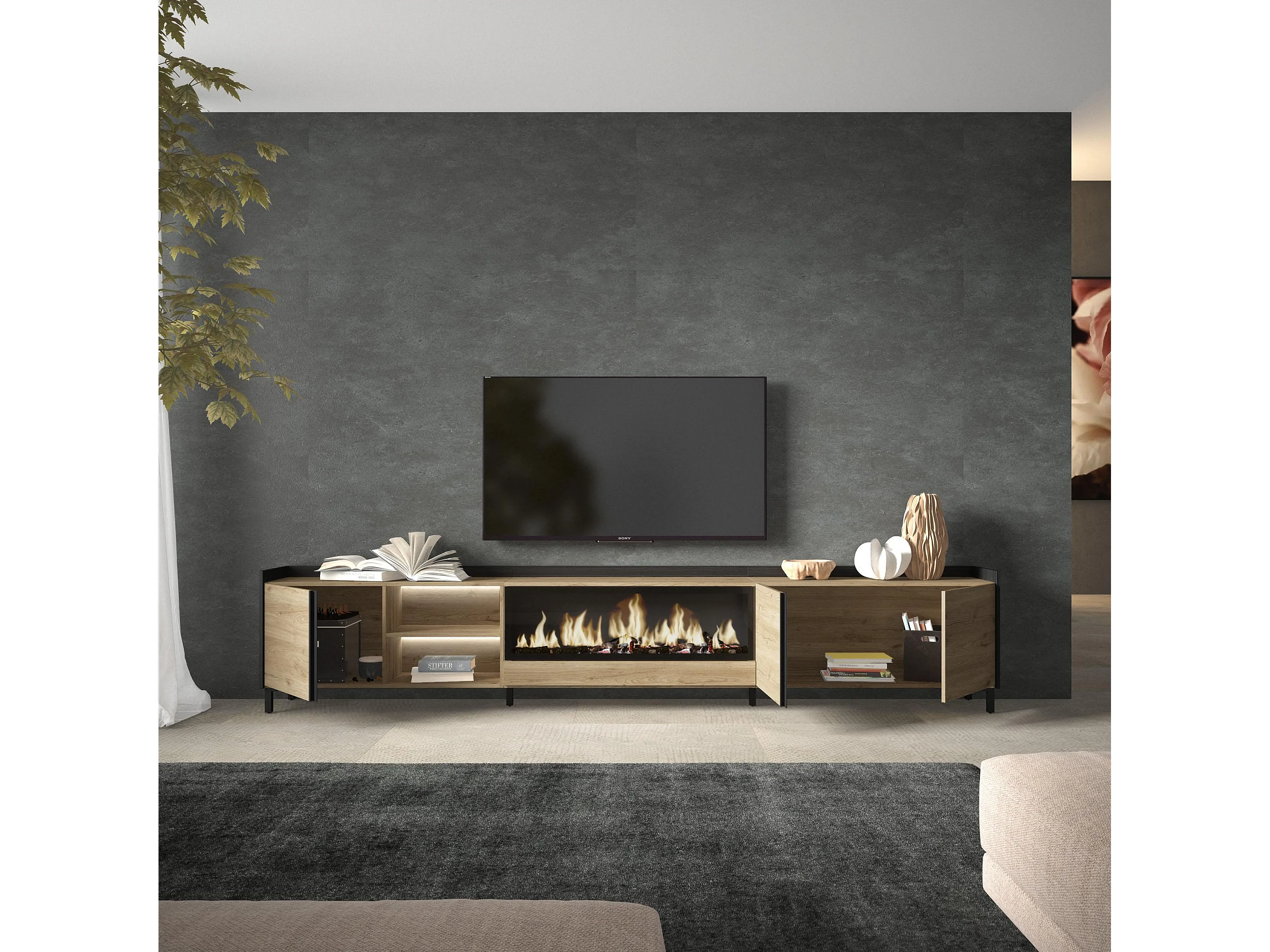 TV-Schrank, Lowboard, 315x61x35 cm, Für TV-Geräte bis zu 80", Elektrokamin XXL, Industriedesign, LED, Eiche Schwarz