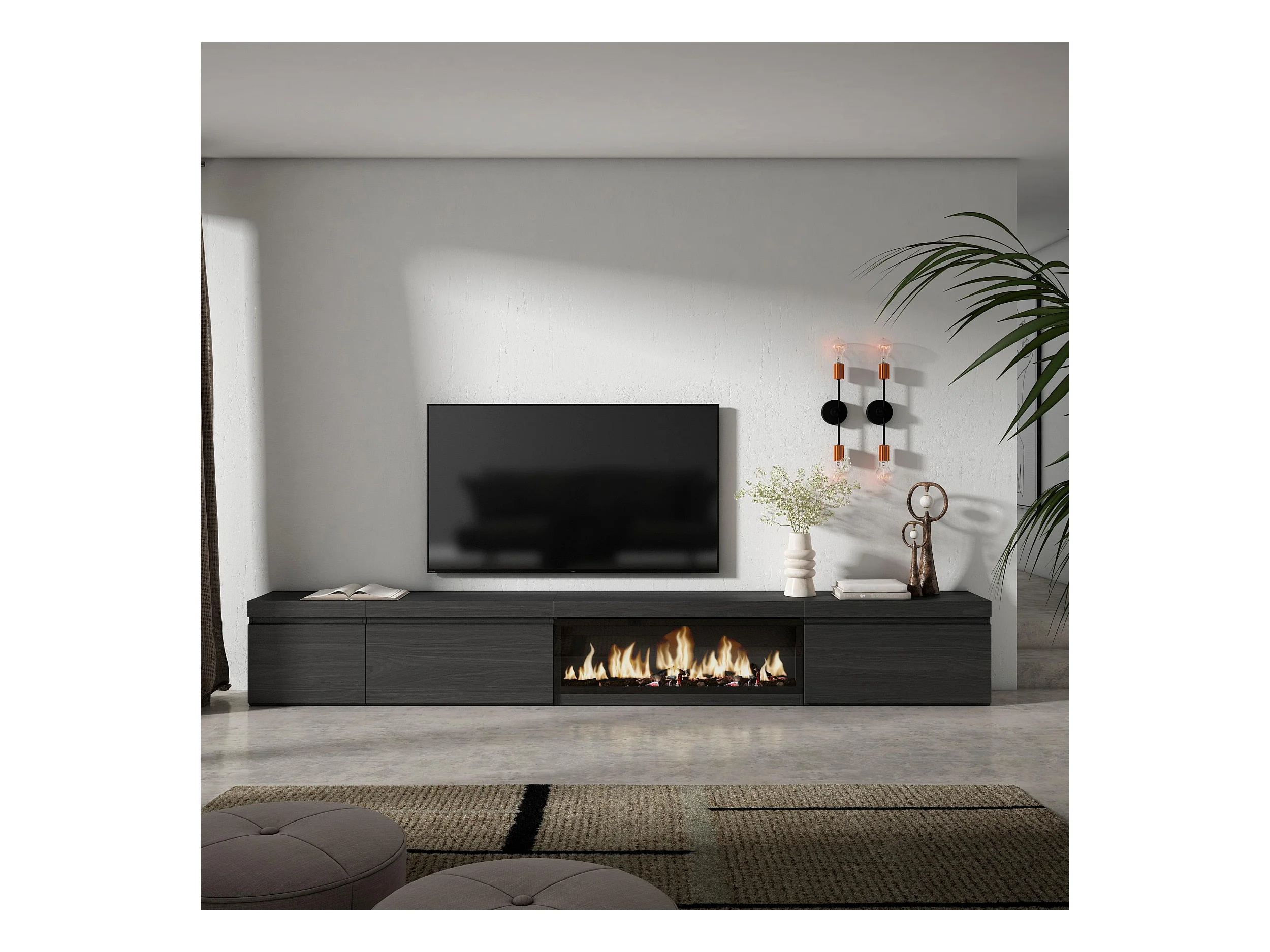 TV-Schrank, Lowboard, 317x35x45cm, Elektrokamin XXL, Schwarz