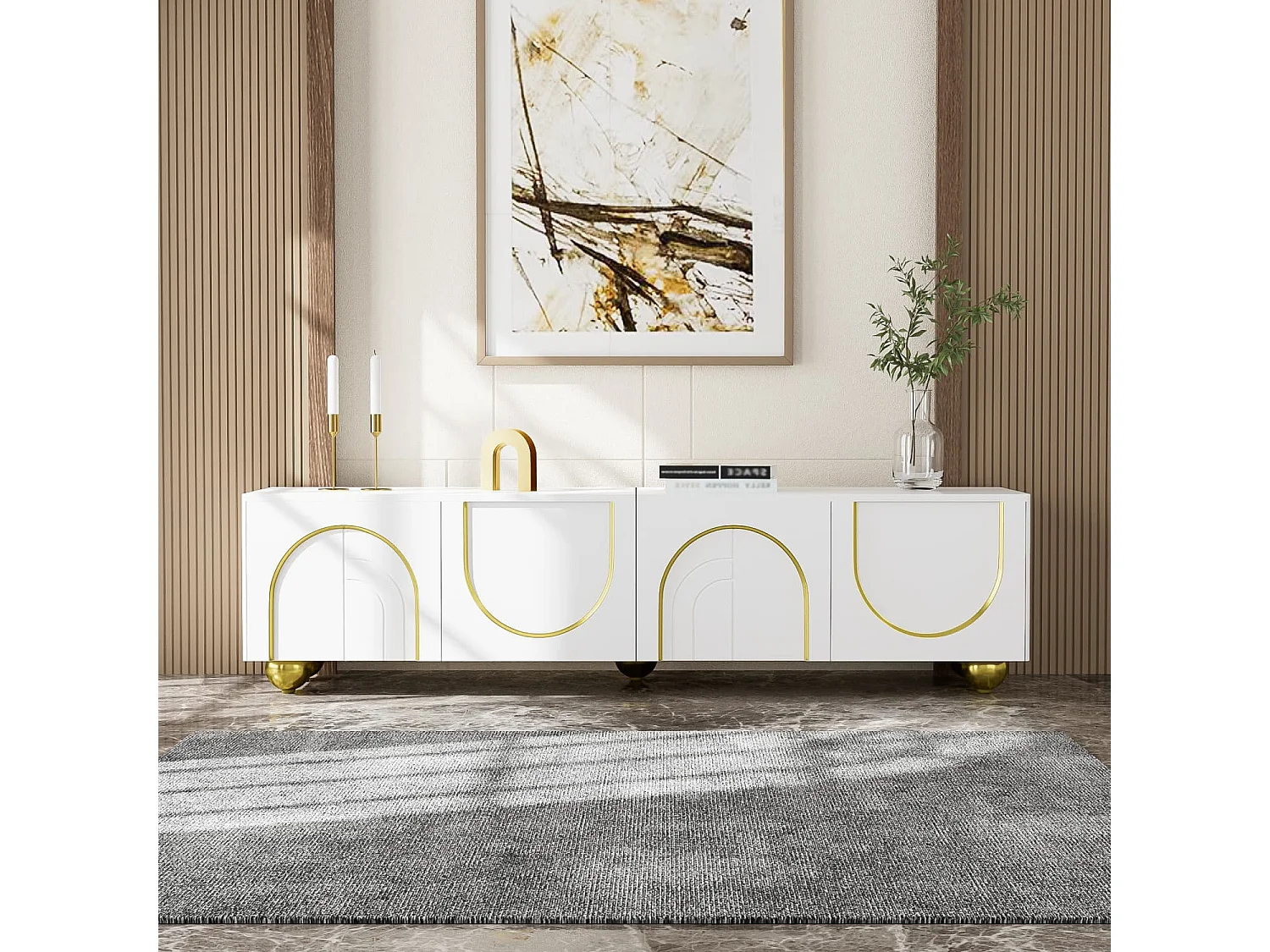 TV-Schrank, lowboard mit strukturierten Türen, TV-Möbel mit Schubladen, offenen Fächern, goldenen Griffen und goldenen Füßen
