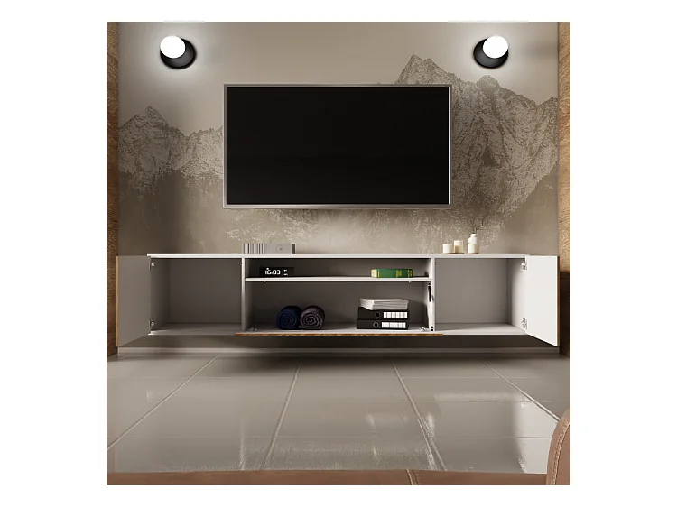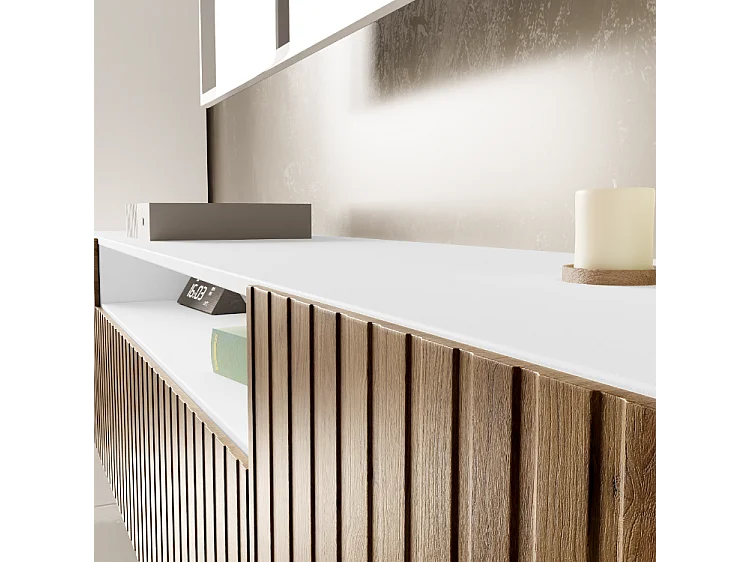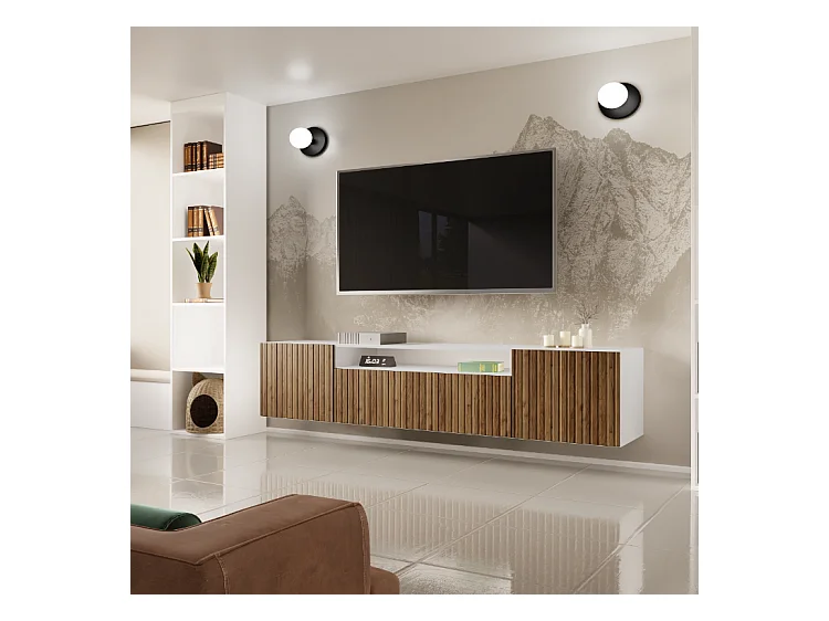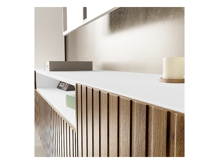 TV-Schrank Mio Fernsehschrank TV-Lowboard 200 cm vertikal gefräste Fronten modernes Design dreitürig Wohnzimmer Wandmontage (Farbe: weiß, catania )