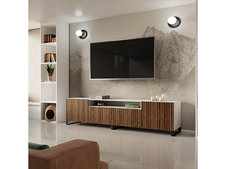 TV-Schrank Mio III Fernsehschrank TV-Lowboard 200 cm vertikal gefräste Fronten modernes Design dreitürig Wohnzimmer (Farbe: weiß, catania )