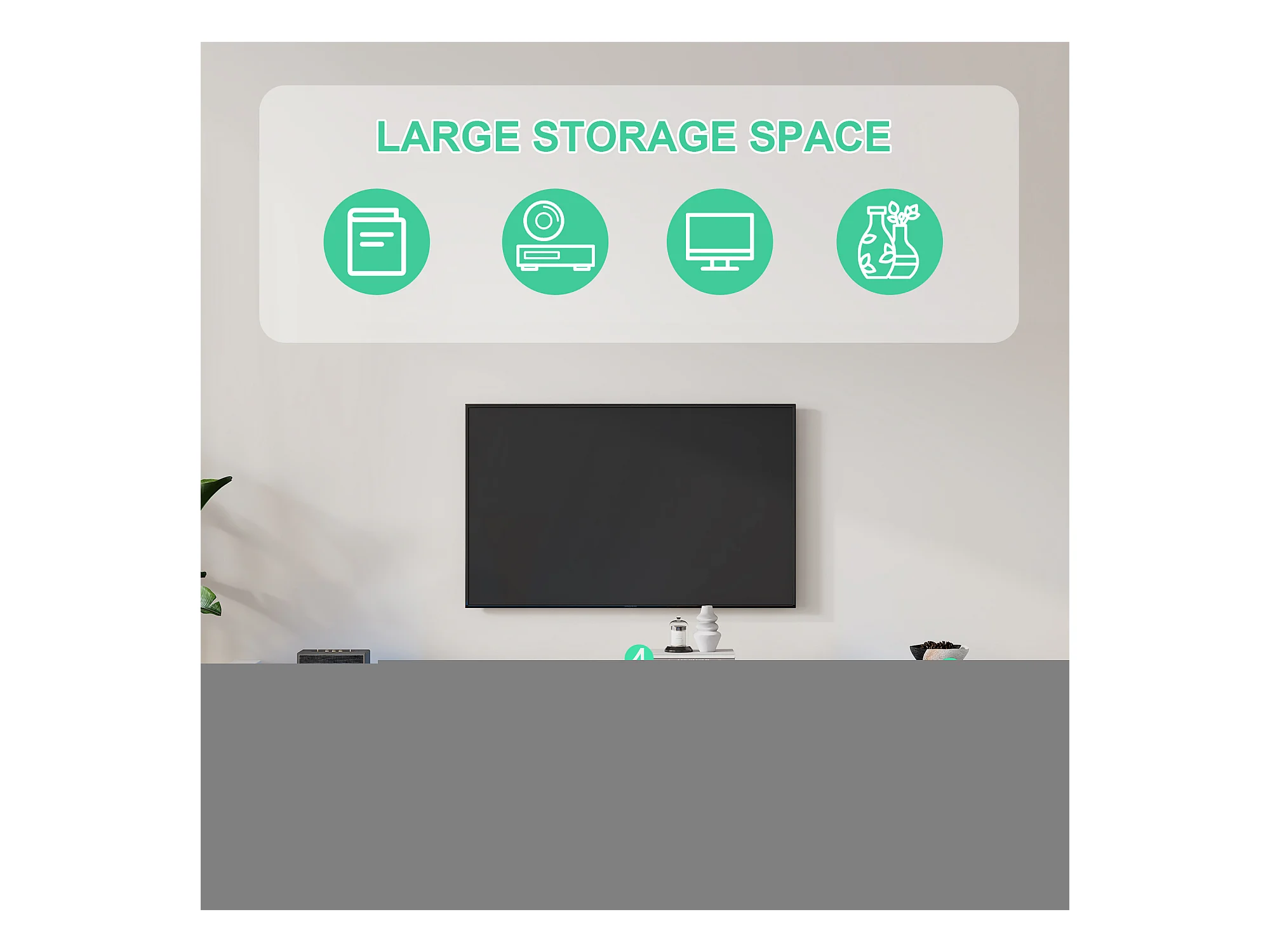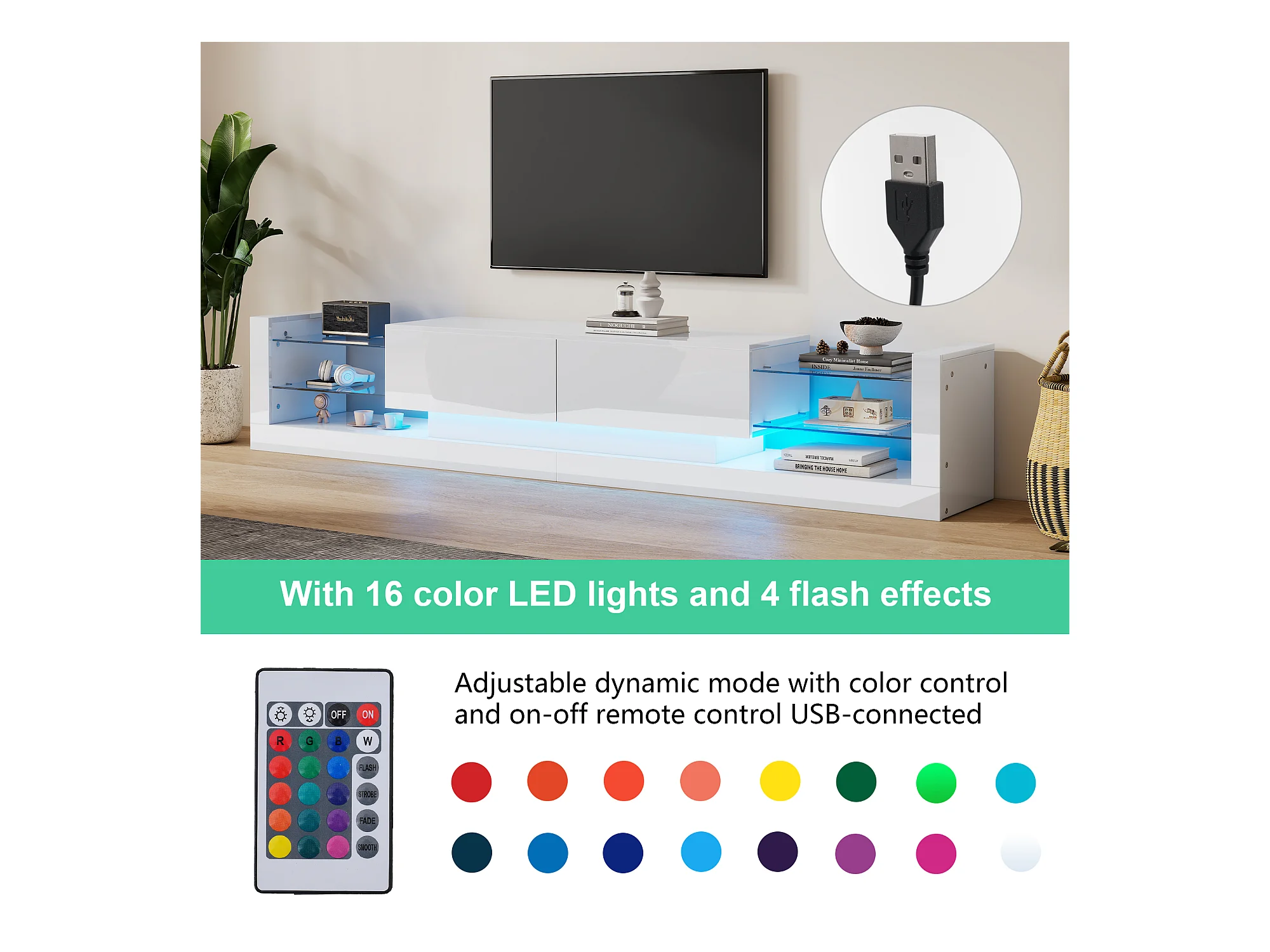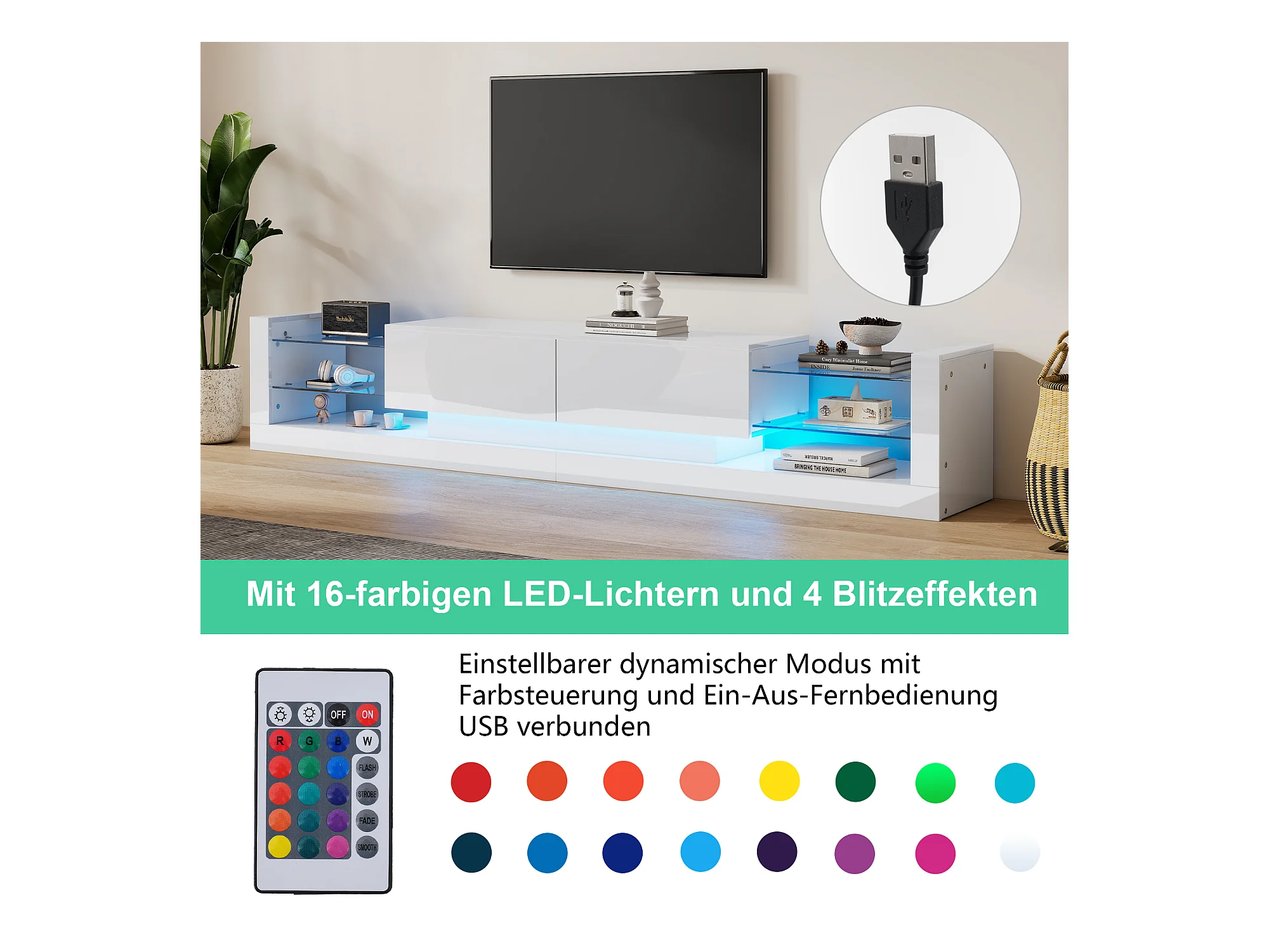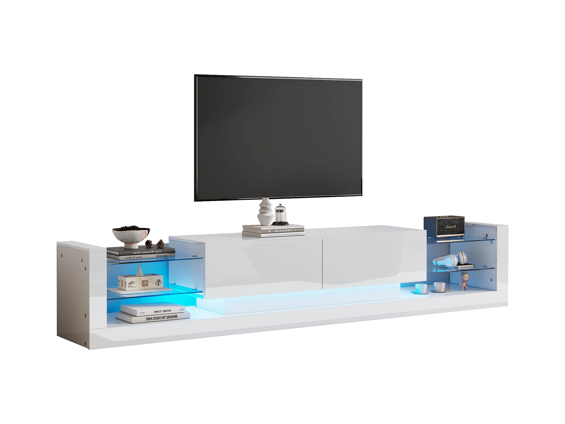TV-Schrank mit 2 Klappschubladen – 181 x 38 x 38 cm – LEDs – Spanplatte – glänzend weiß