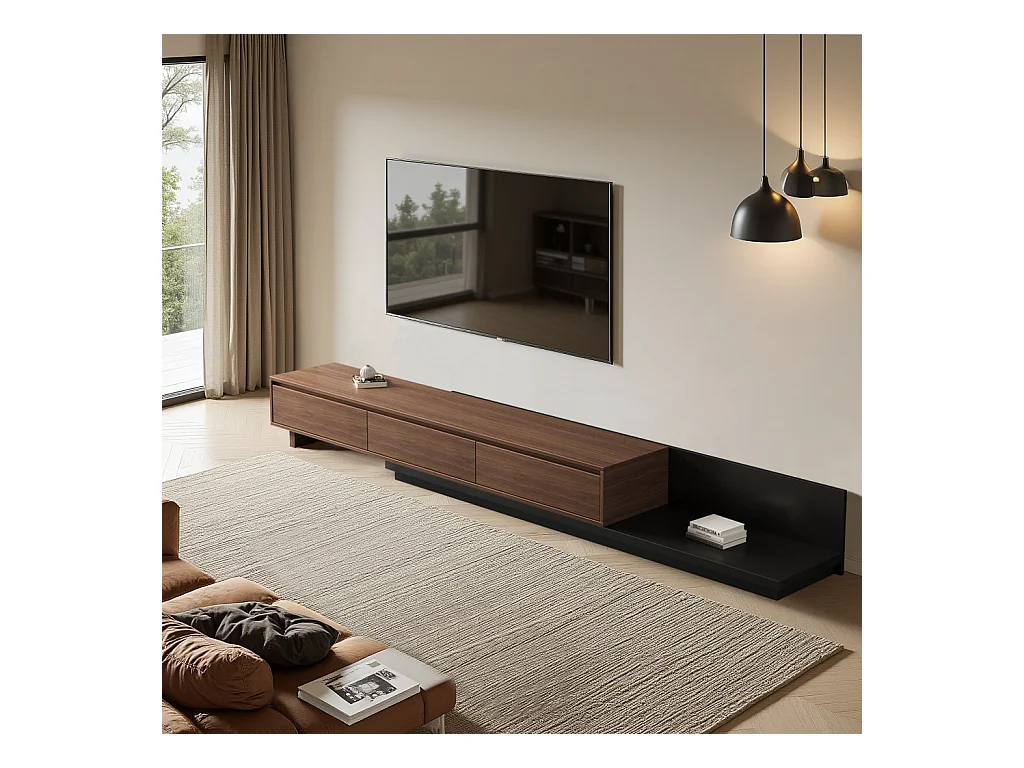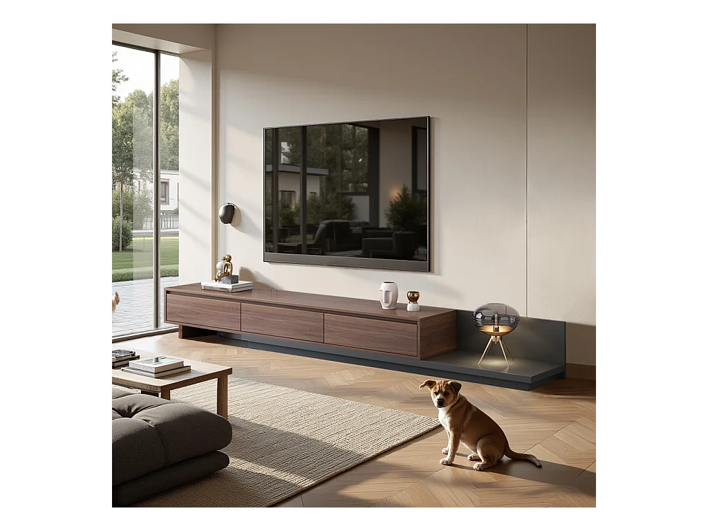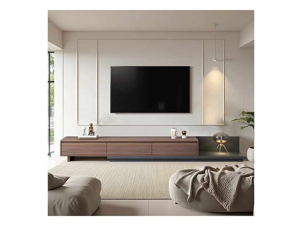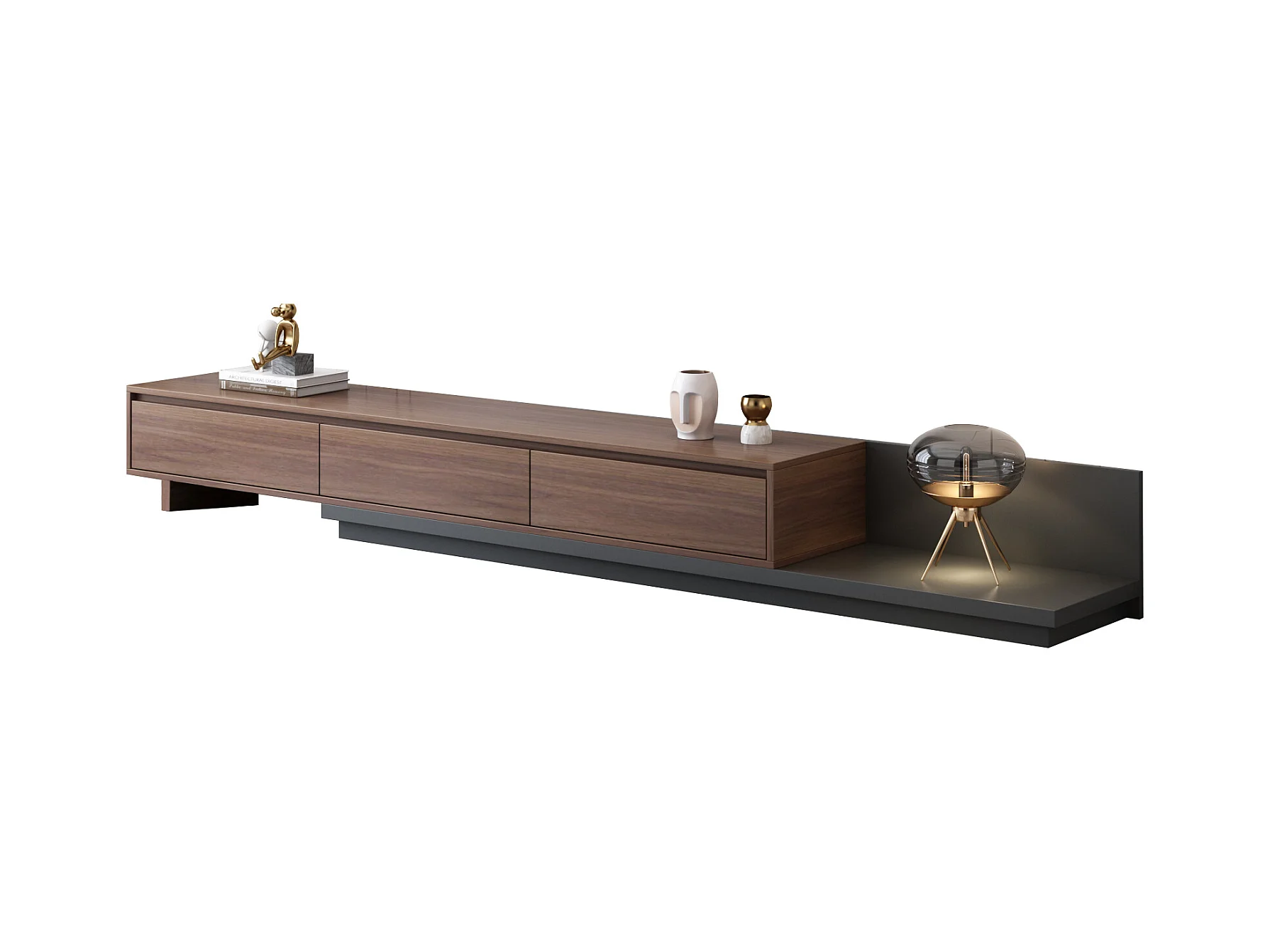 TV-Schrank mit 3 Schubladen, ausziehbarer und verstellbarer Fernsehtisch von 200 cm bis 330 cm, TV-Möbel für Wohnzimmer, Walnuss