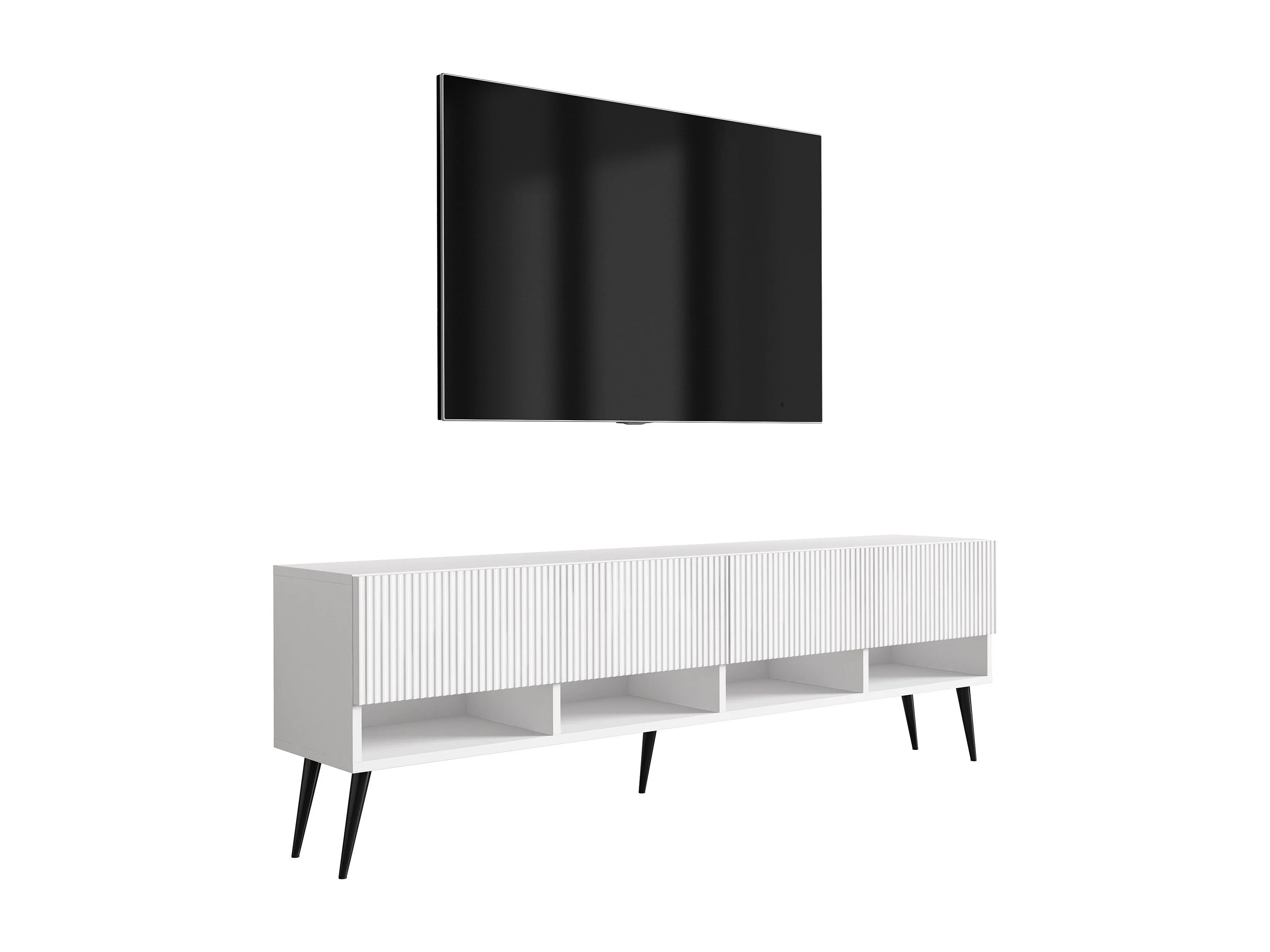 TV-Schrank mit geriffelte Fronten, Mattweiß, schwarze, schräge Beine, 170 × 32 × 52 cm
