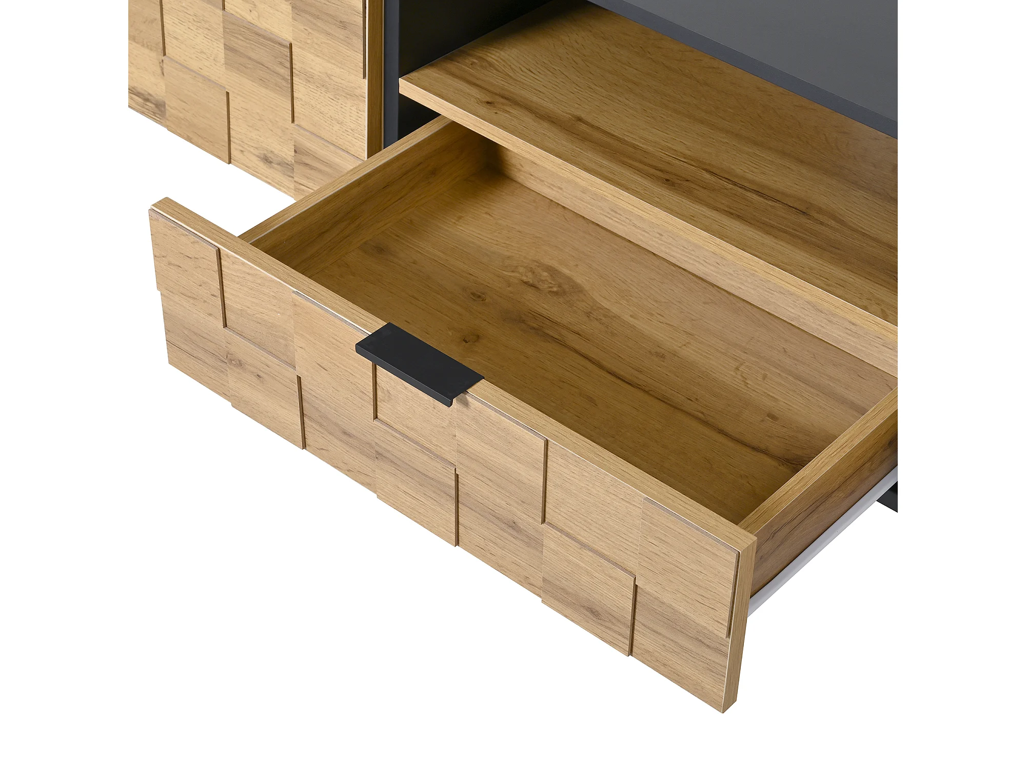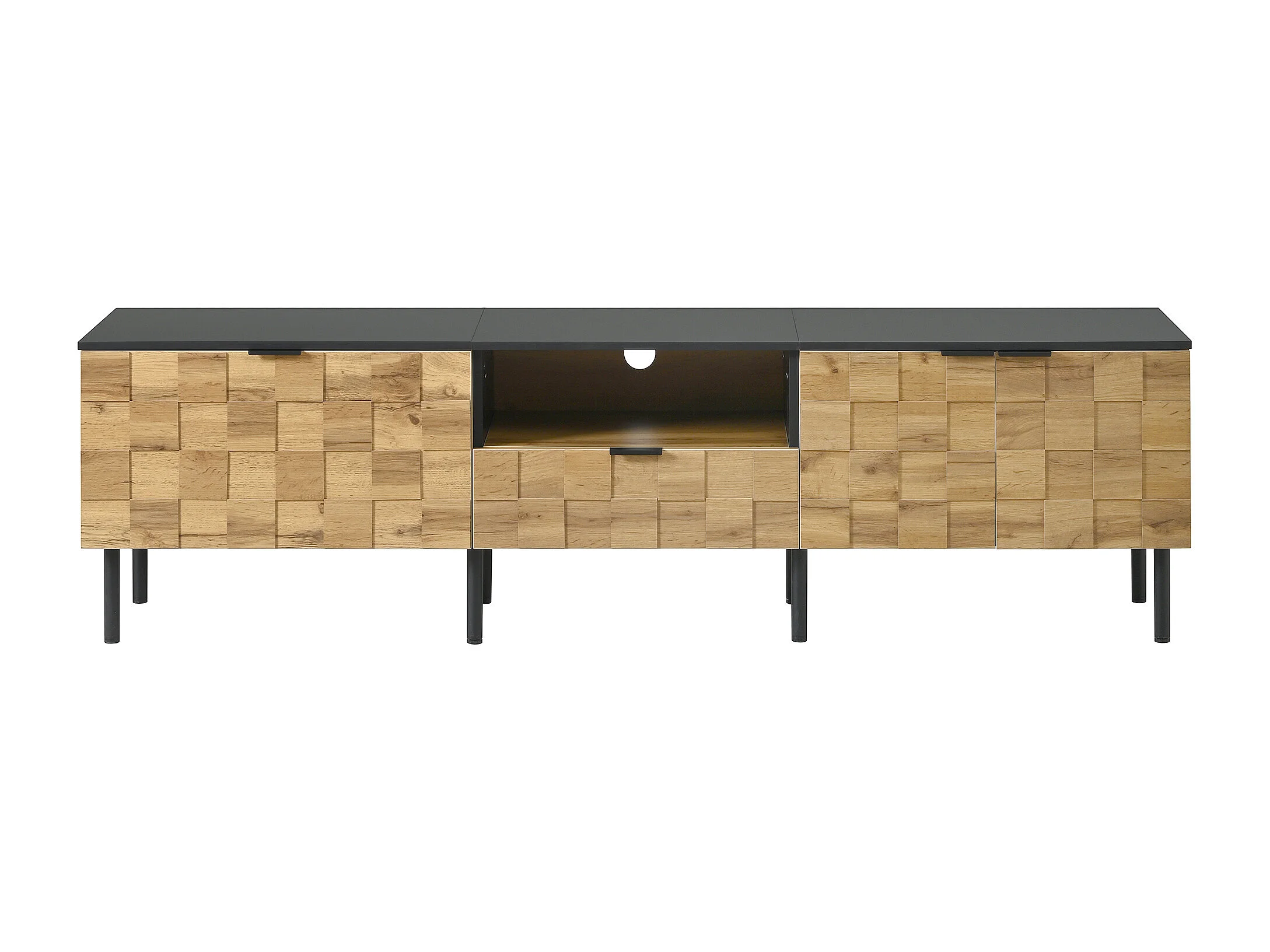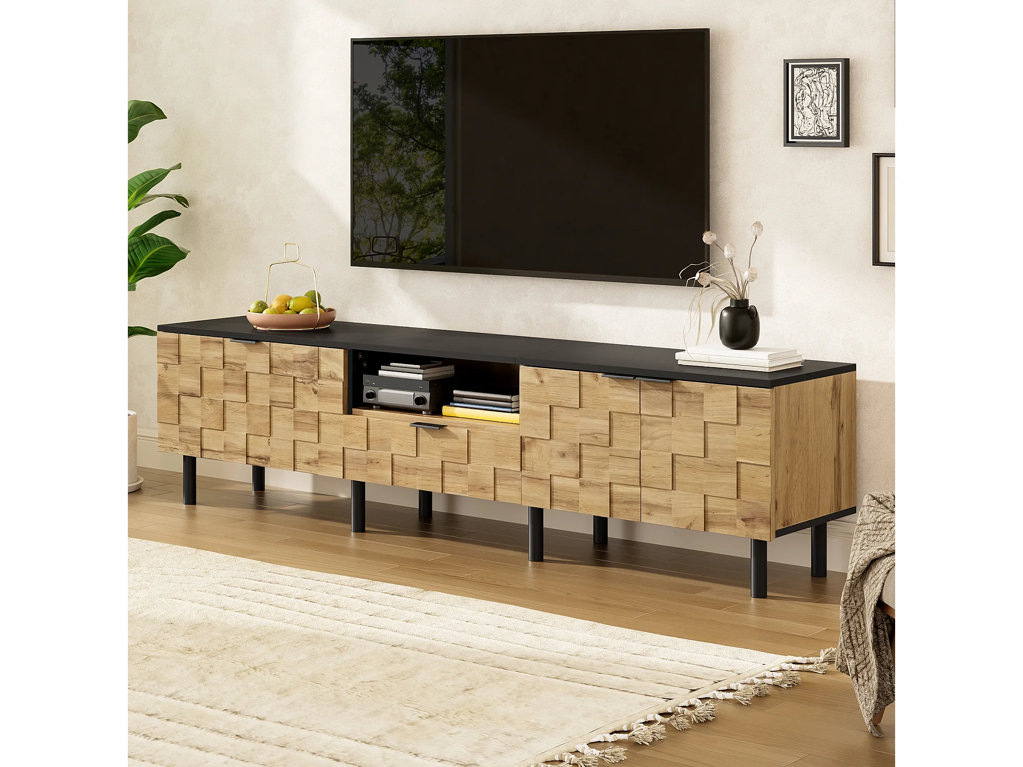 TV-Schrank Mosaik 170x35x44,5 cm - 2 Türen und 1 Schublade - Holzoptik - Metallfüße - Offene Regale - Naturfarbe