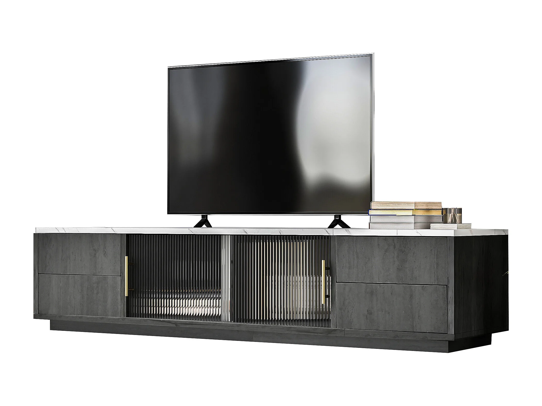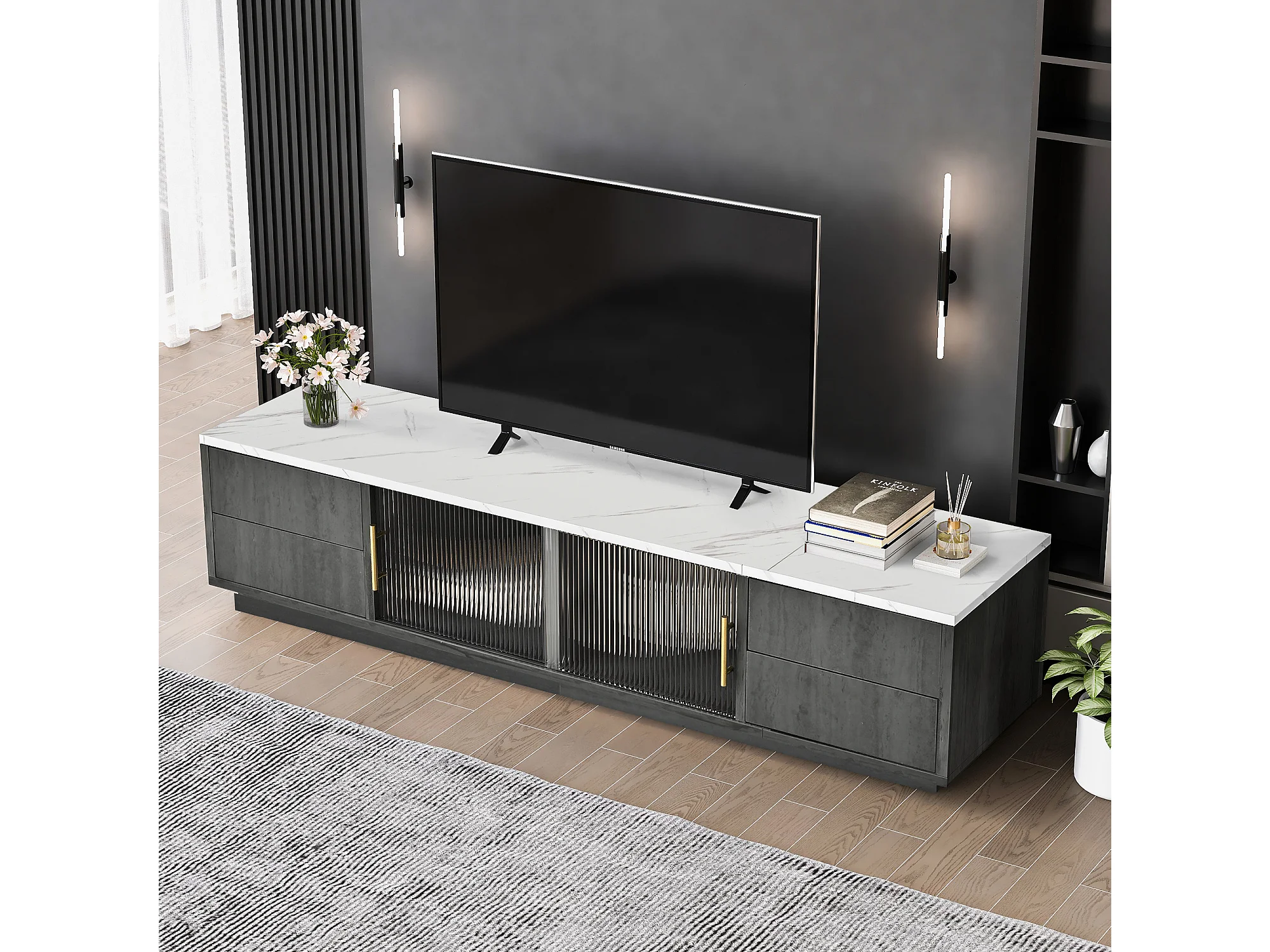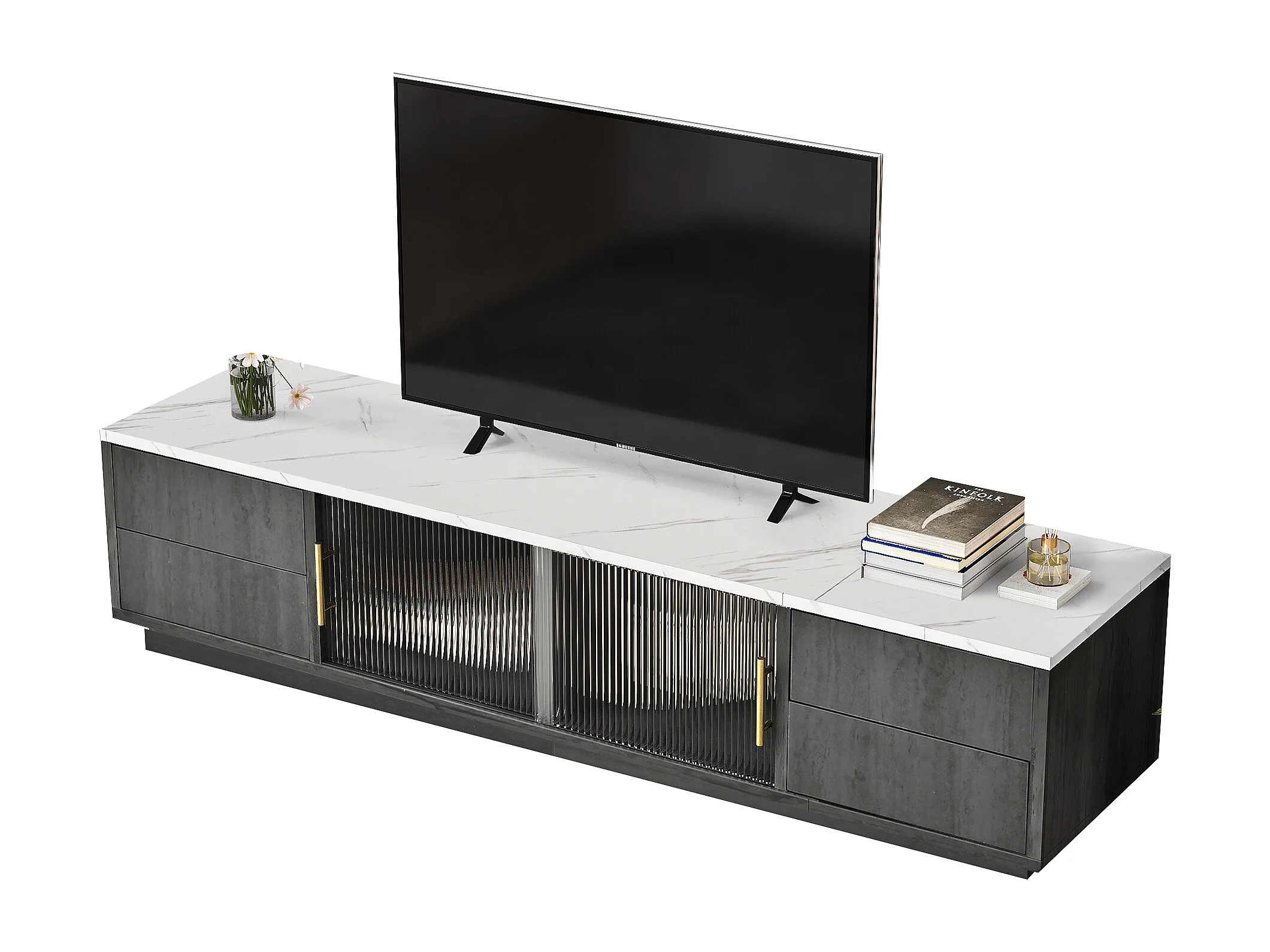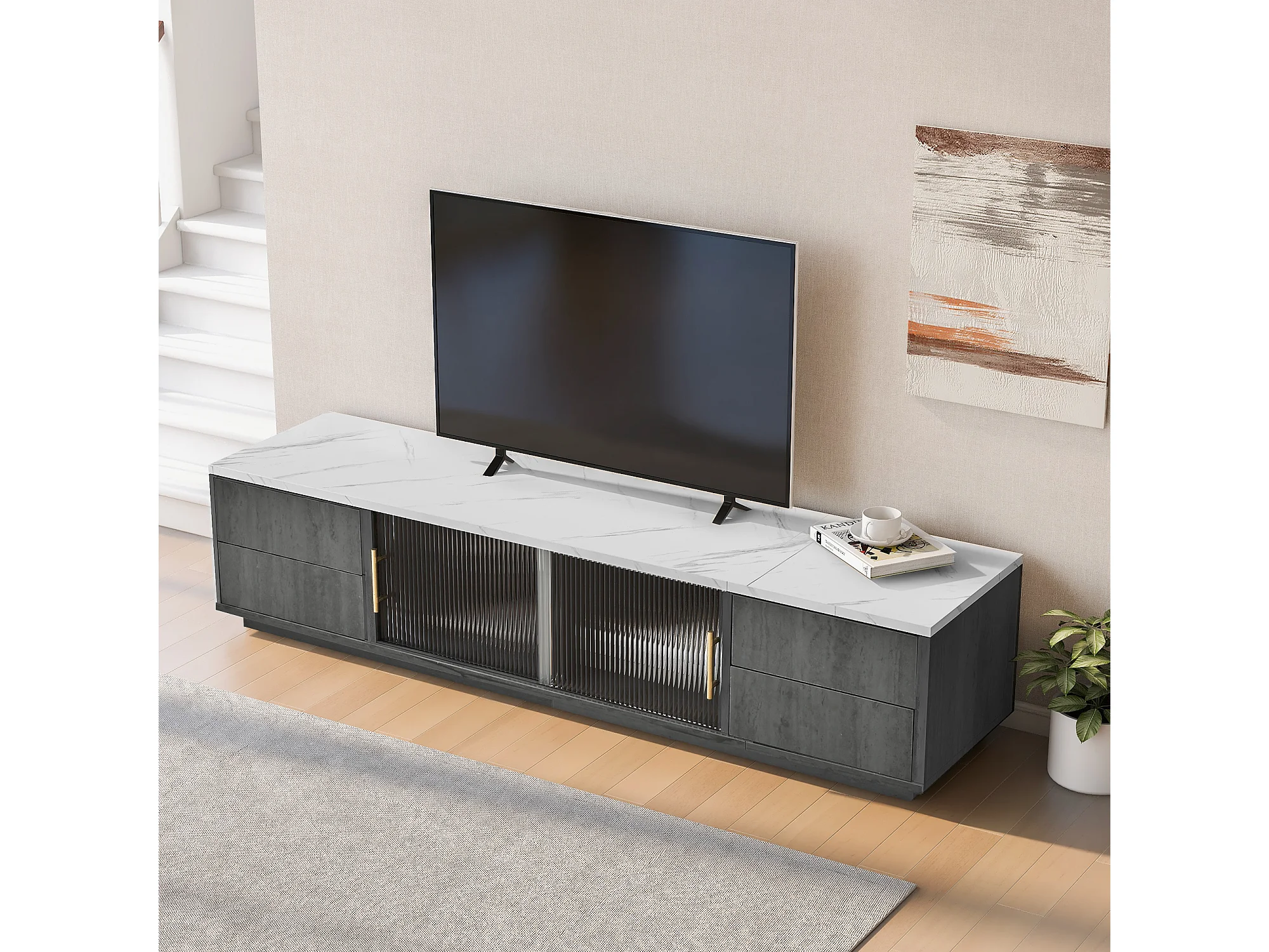 TV-Ständer 160 x 40 x 38,5 cm für 70-Zoll-Fernseher – graue Marmoroptik-Platte – 4 Schubladen und 2 Glasschiebetüren – grau