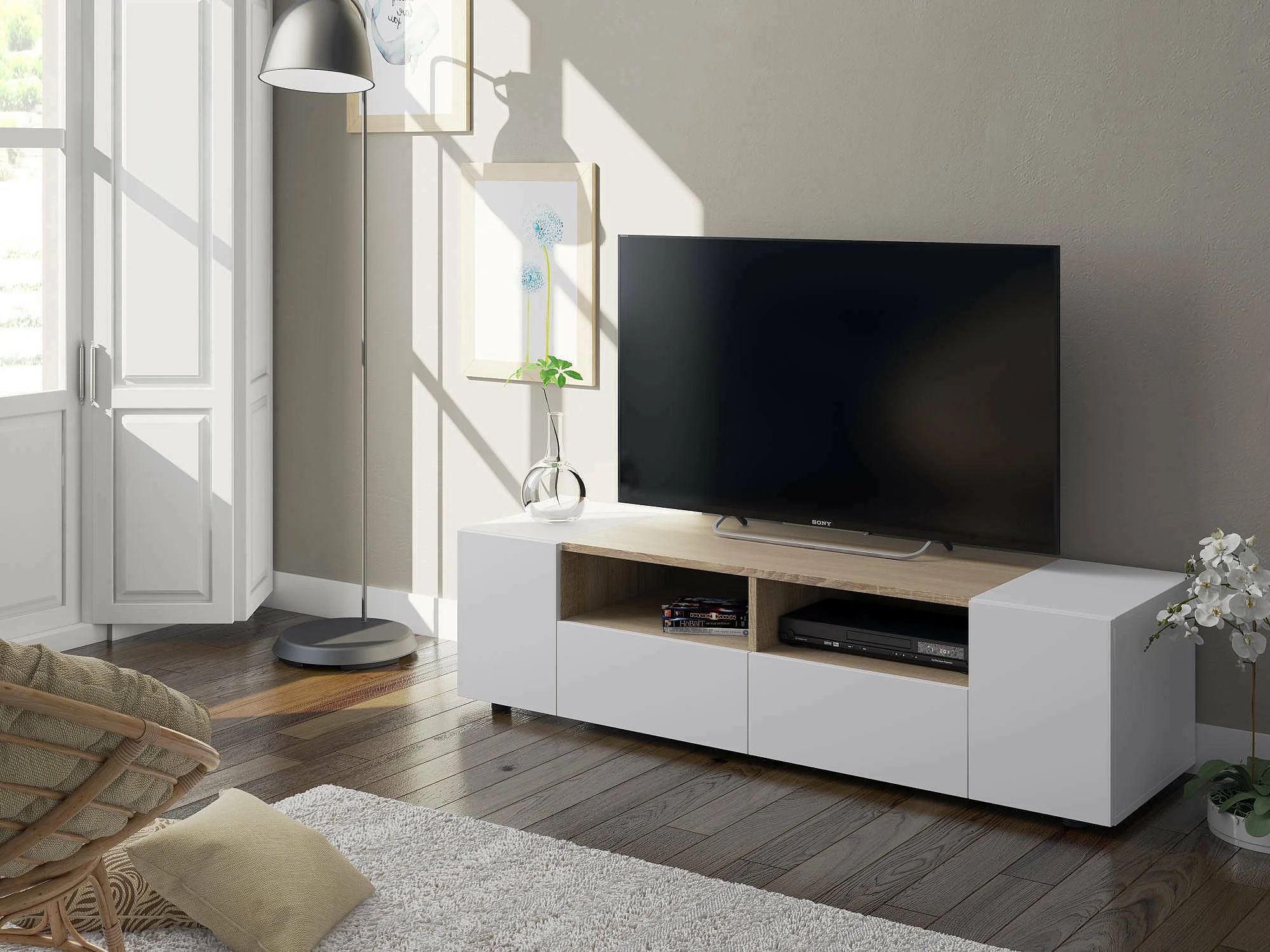 TV-Ständer Dmolino, Wohnzimmer TV-Sideboard, Moderner Fernsehständer, Niedriges Mehrzweck-Sideboard, 138x42h36 cm, Weiß und Eiche
