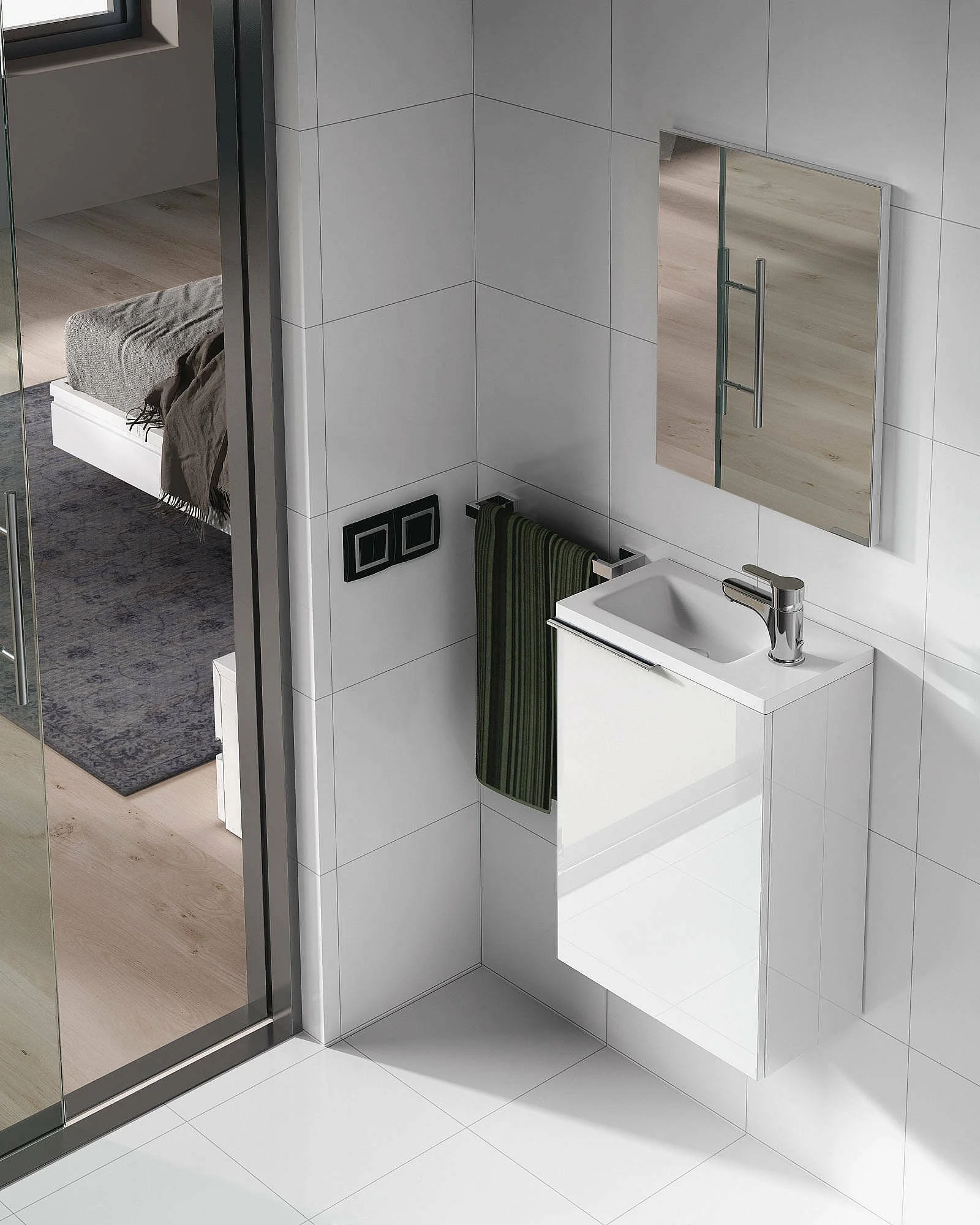 Unterschrank Dlott, Abgehängter Badezimmerschrank, Kleiderschrank mit 1 Tür mit Spiegel und Waschbecken, 40x22h58 cm, Glänzend Weiß