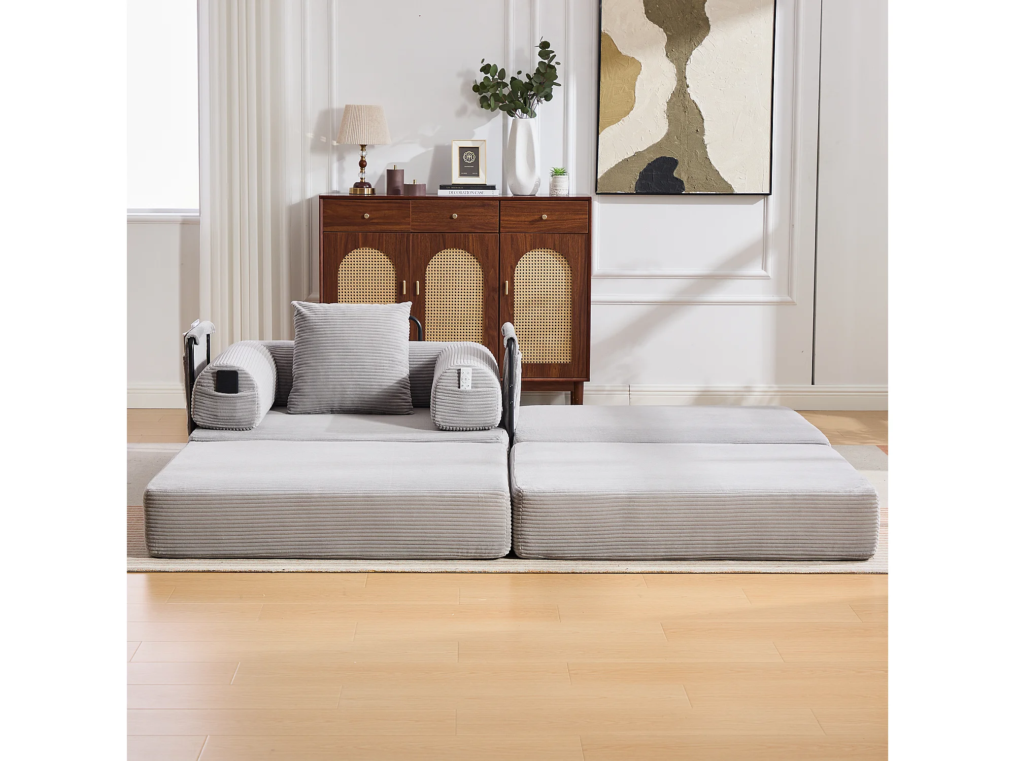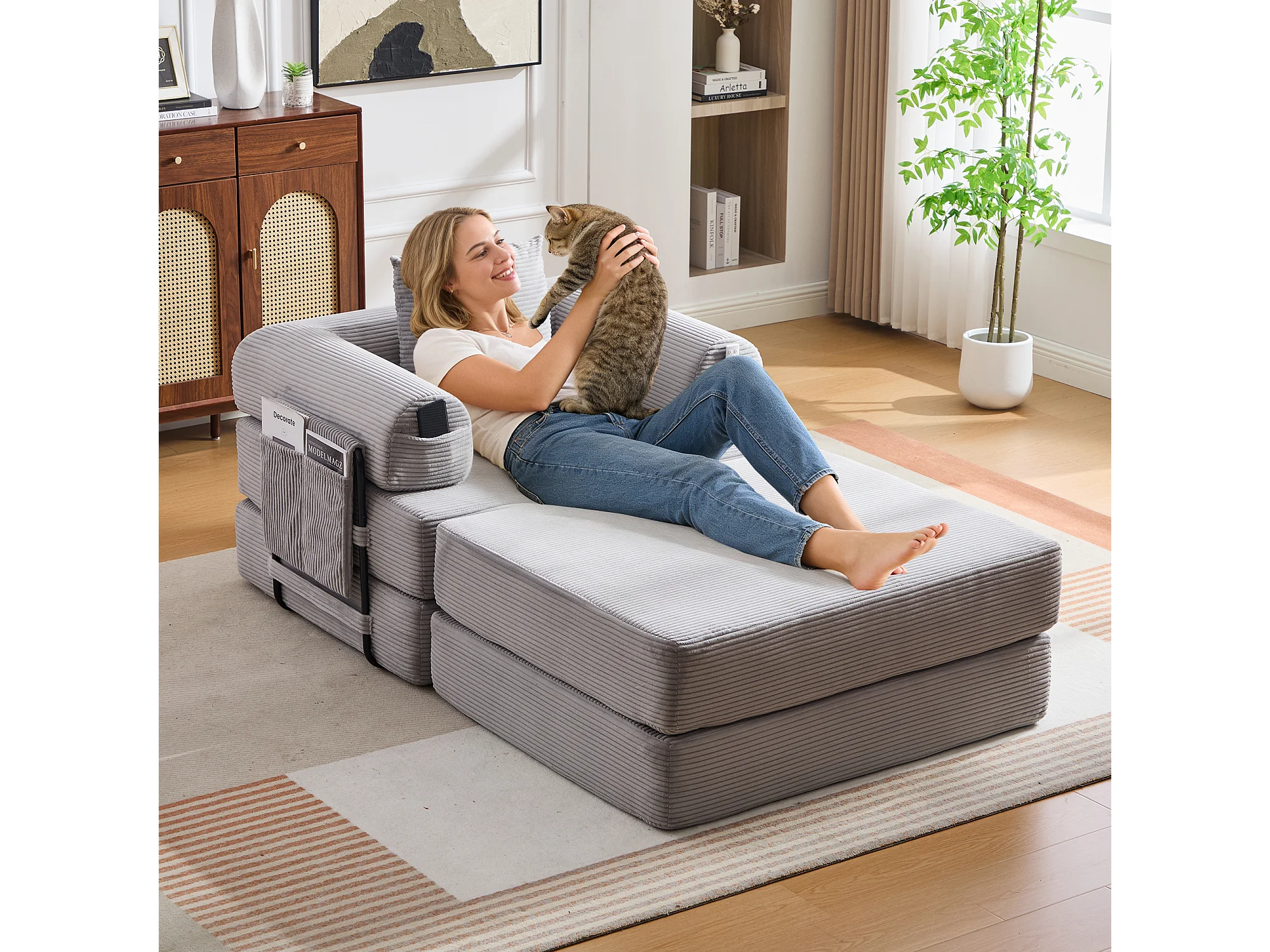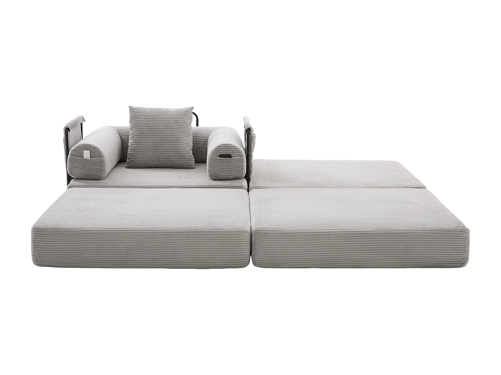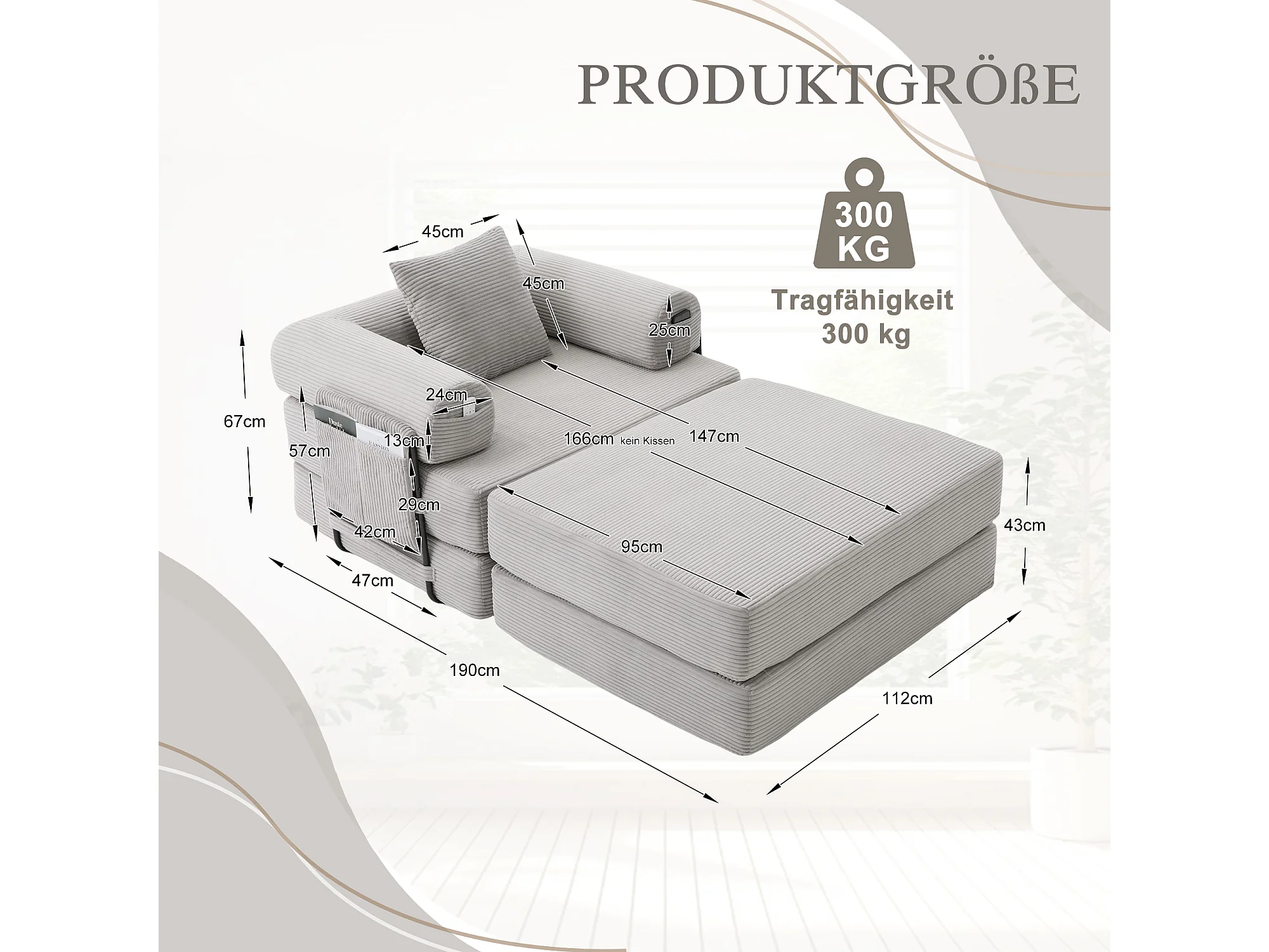Verwandlungssessel aus Cord-Samt – 190 x 112 x 67 cm – mit Kissen und Tasche – stufenlos modular – hellgrau