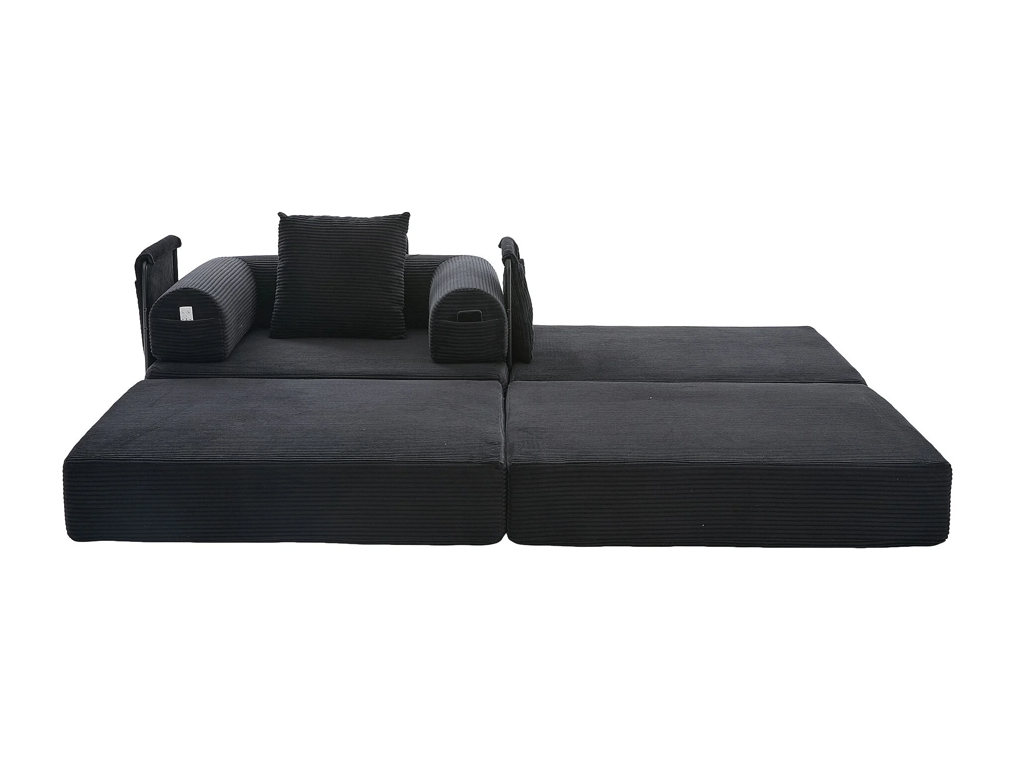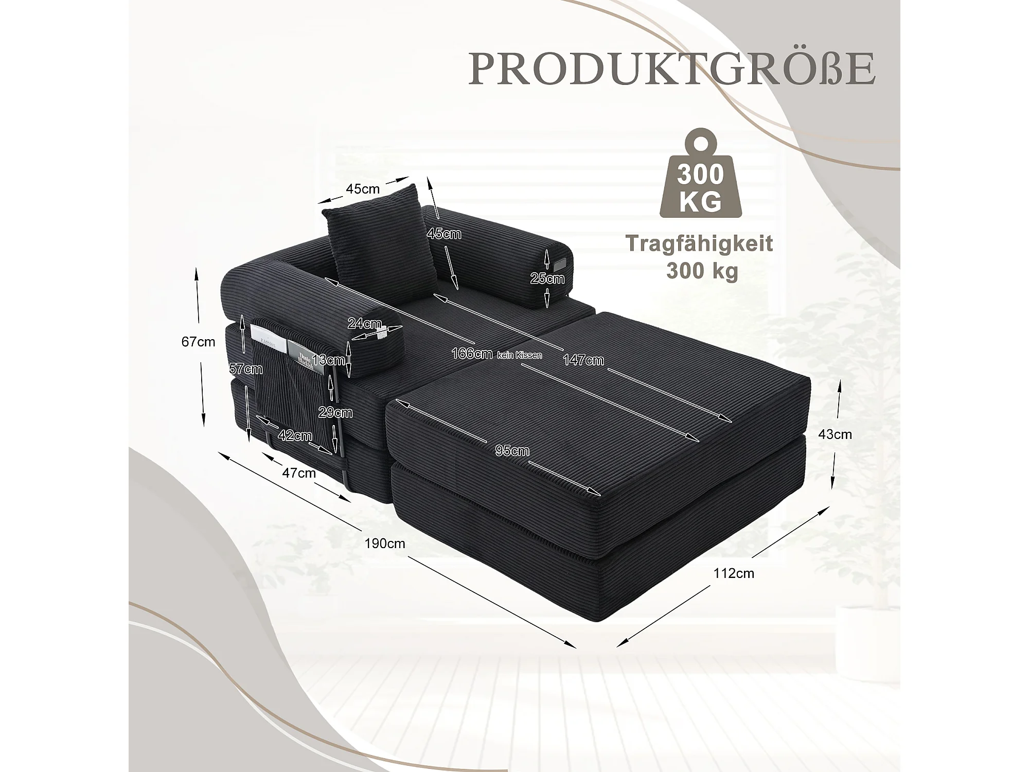 Verwandlungssessel aus Cord-Samt – 190 x 112 x 67 cm – mit Kissen und Tasche – stufenlos modular – schwarz