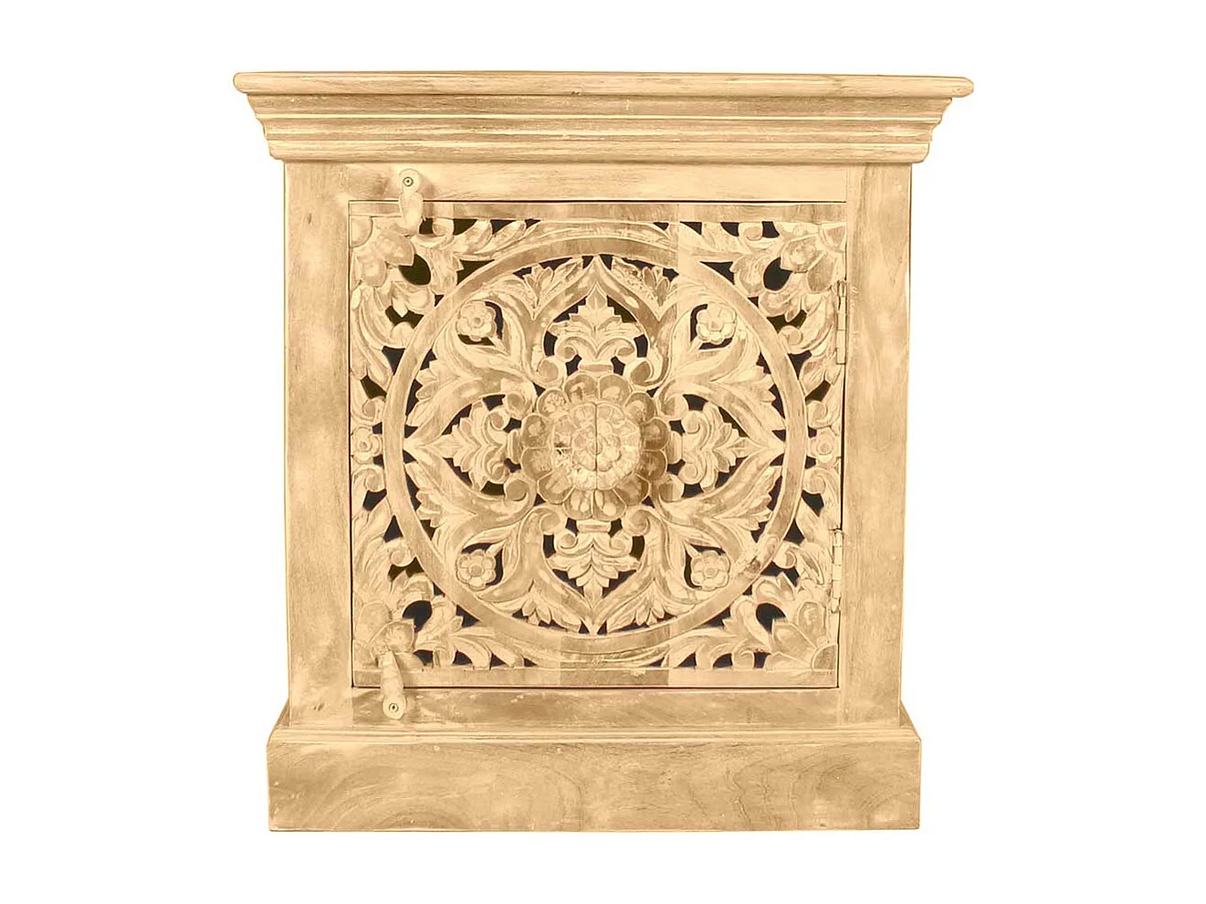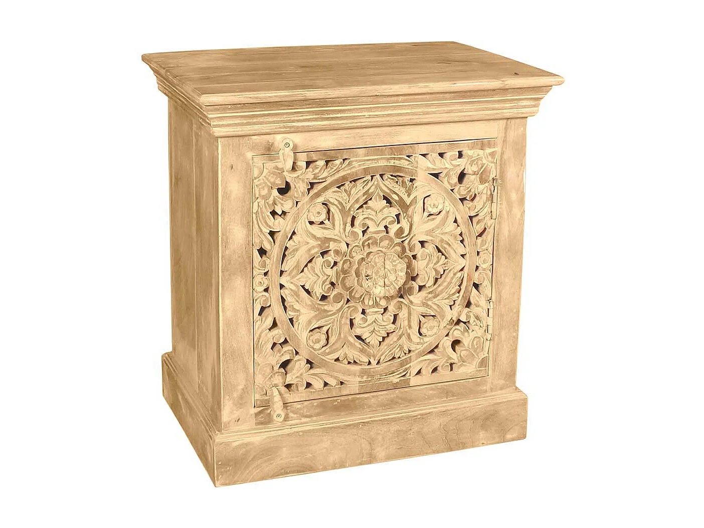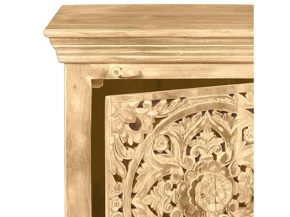 Vintage Design Bettkommode aus Mangobaum Sandfarben massiv floralen Schnitzereien