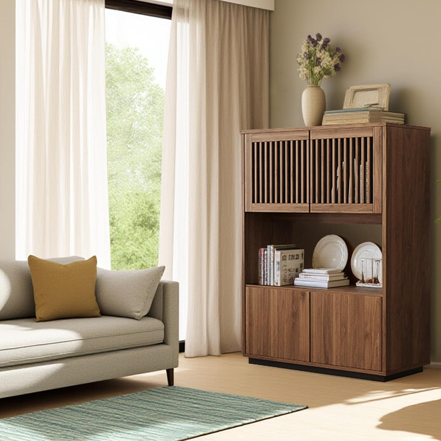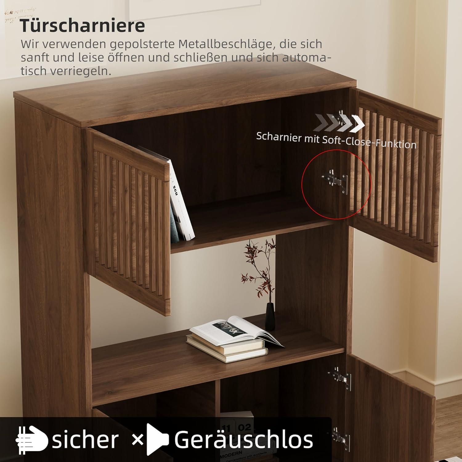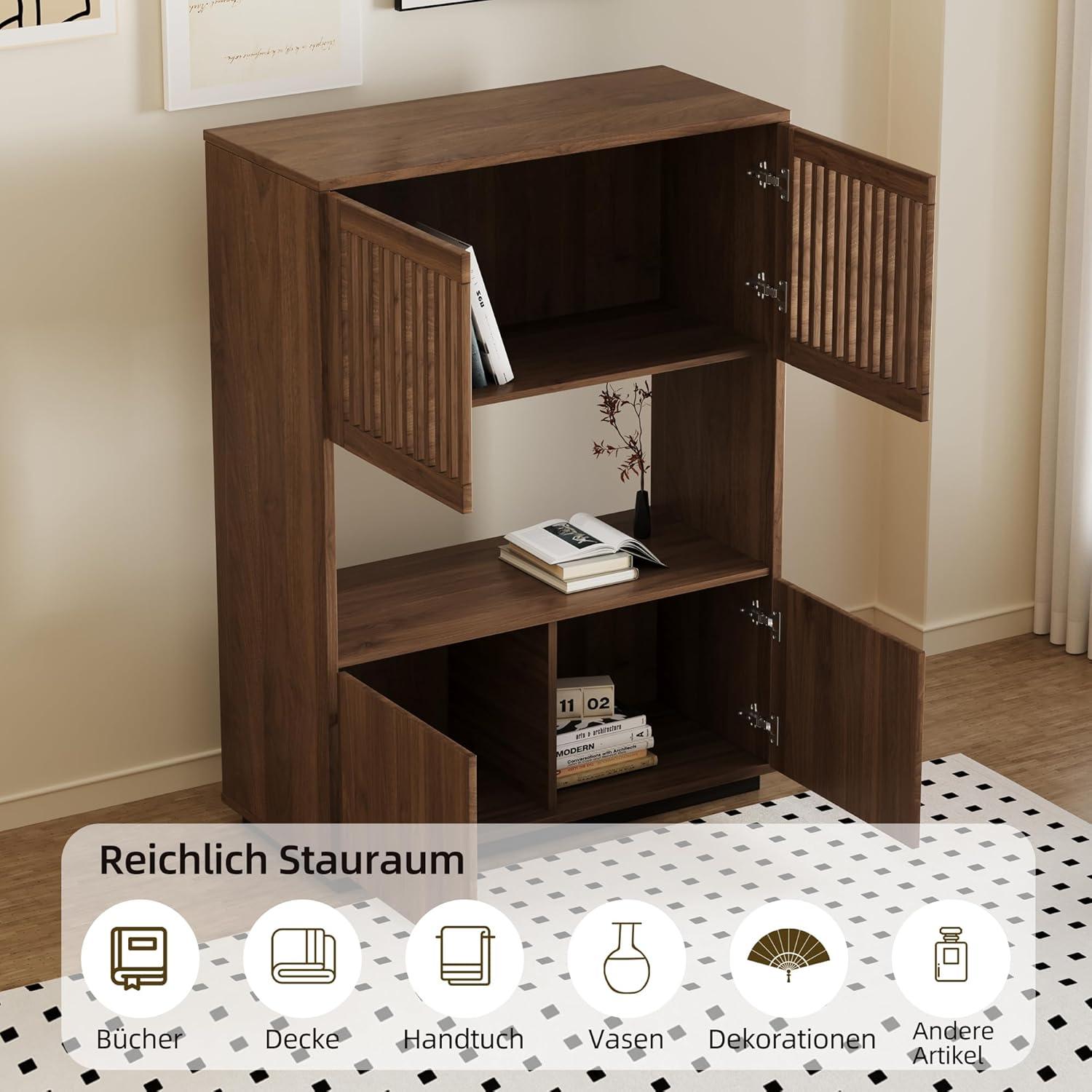 【Stilvolles Design und Vintage-Charme】 Diese Kommode vereint minimalistisches Design und Landhausstil. Ihre klaren Linien und die Nussbaumfarbe verleihen Ihrem Zuhause Wärme und Eleganz. 【Hochwertige Holzstruktur】 Hergestellt aus Holz, das gegen Feuchtigkeit und Schimmel behandelt ist, bietet es eine außergewöhnliche Stabilität und eine Tragfähigkeit von bis zu 80 kg, was eine langjährige Nutzung garantiert. 【Großer Stauraum mit offenem Fach】 Mit seinen geschlossenen Türen oben und unten sowie einem offenen Mittelteil ist dieses Möbelstück perfekt, um Bücher, Geschirr, Akten aufzubewahren oder Dekorationsgegenstände auszustellen. 【Vielseitig und für Mehrfachnutzung geeignet】 Einsetzbar als Bücherregal im Arbeitszimmer, Sideboard im Wohnzimmer, Kommode im Schlafzimmer oder Flurmöbel. Es passt sogar in kleine Räume. 【Einfacher Aufbau und zuverlässiger Service】 Dank klarer Anweisungen ist die Montage schnell. Sichere Lieferung in verstärkter Verpackung und aufmerksamer Kundenservice für ein sorgenfreies Erlebnis.