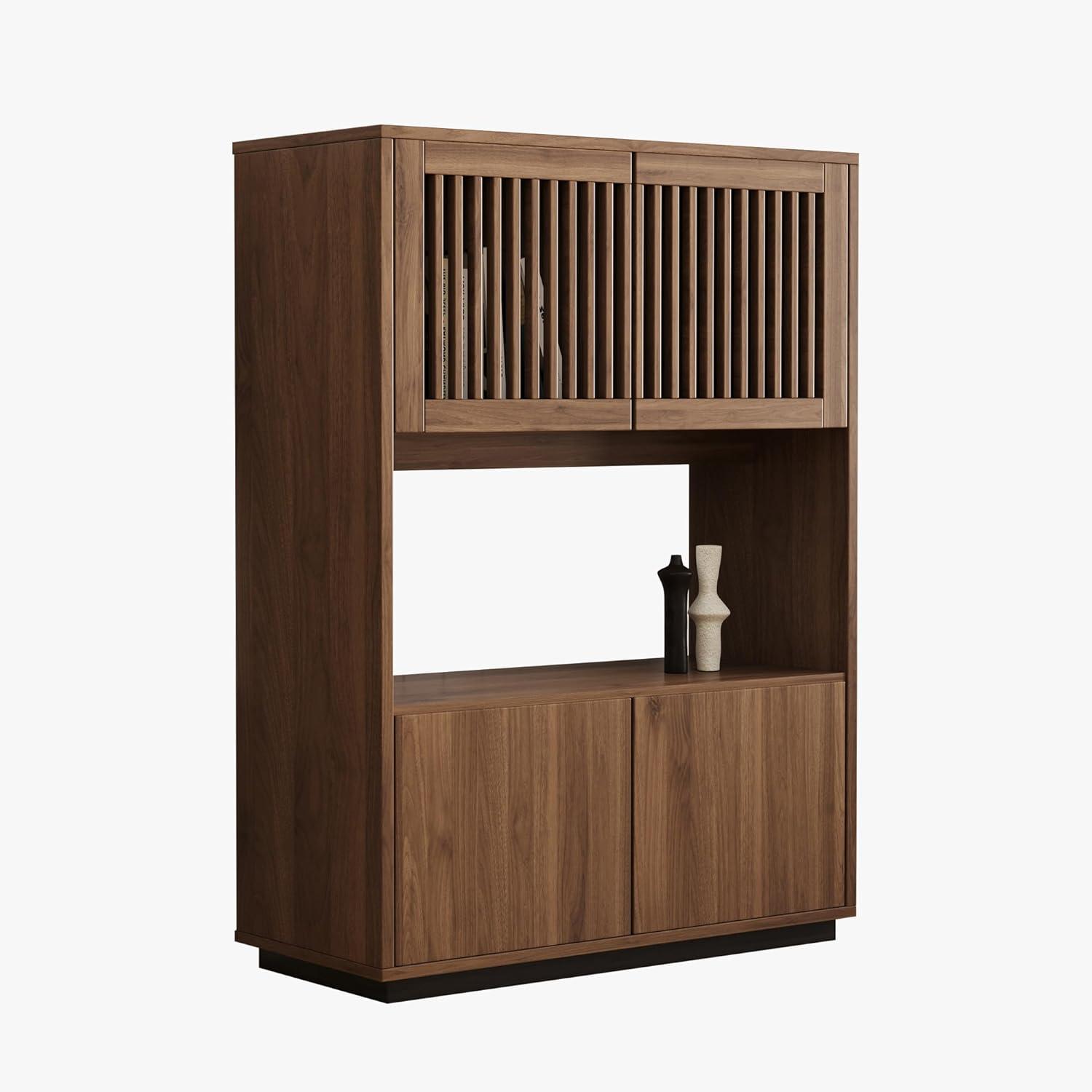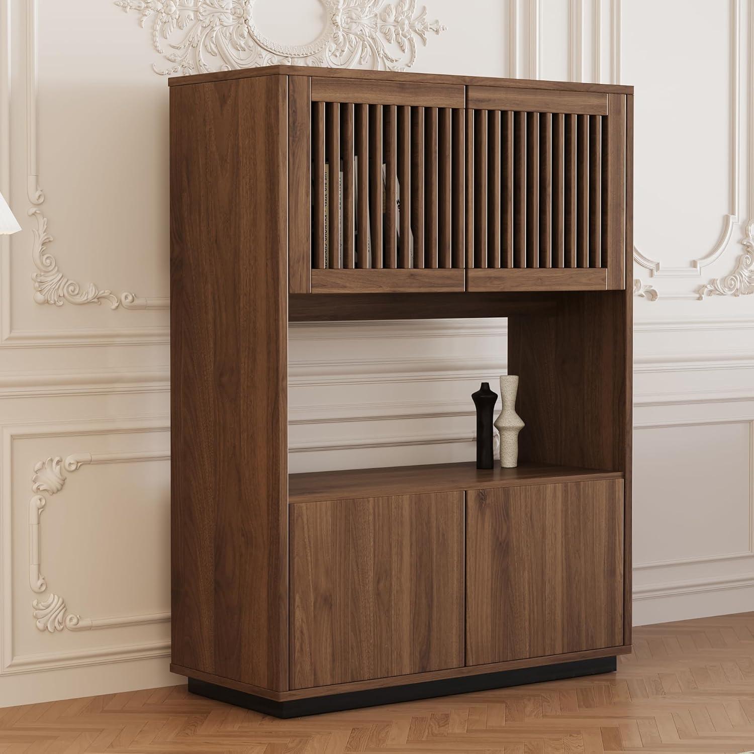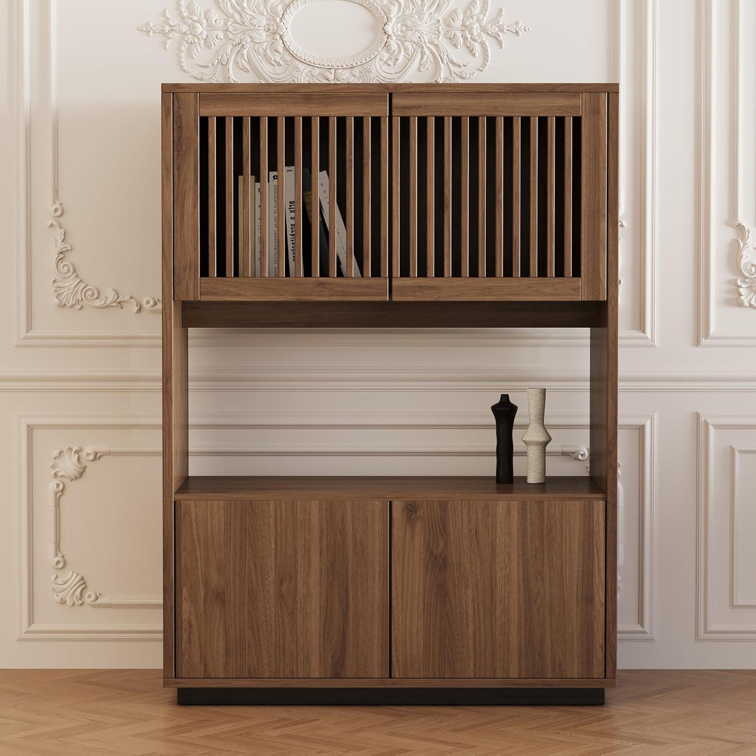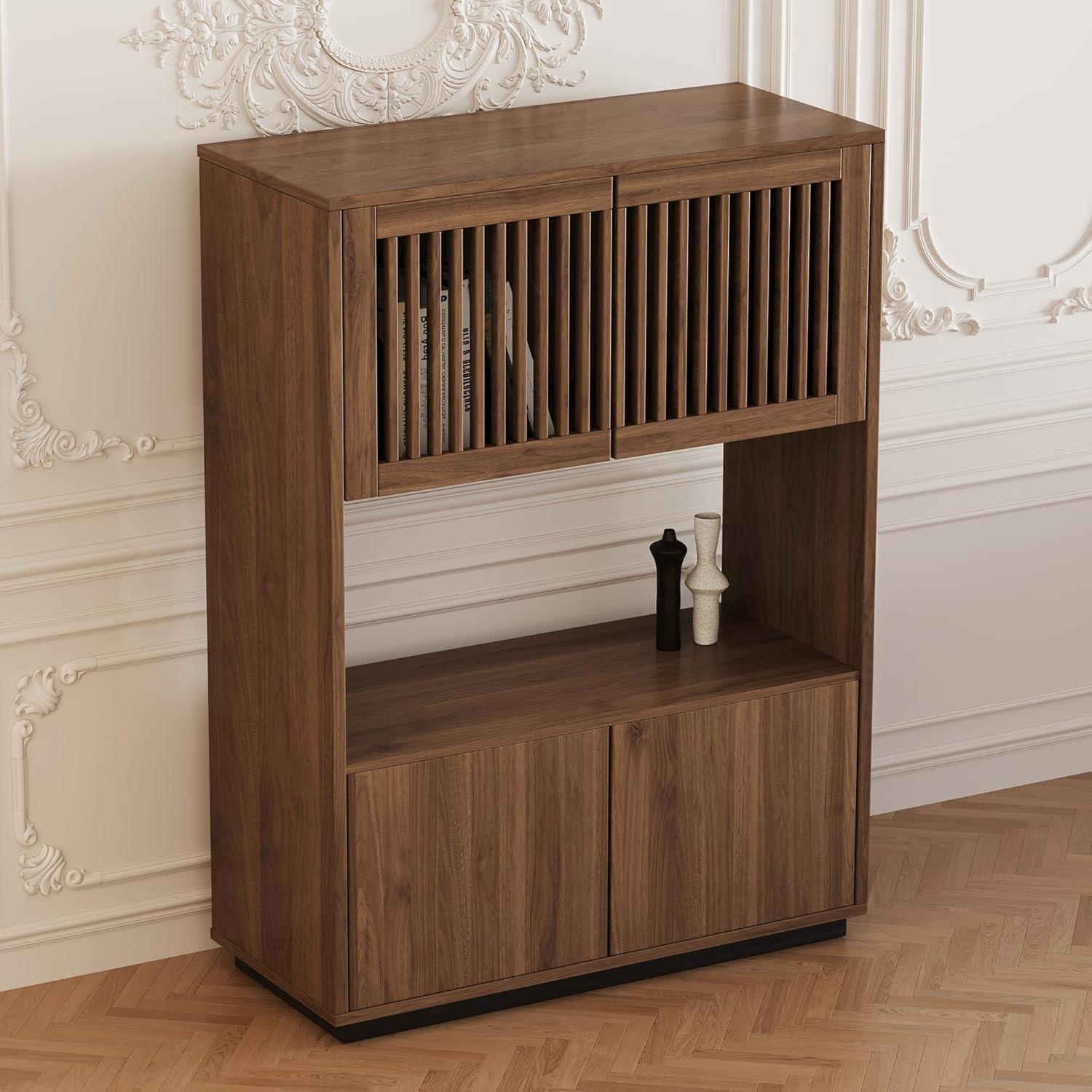 【Stilvolles Design und Vintage-Charme】 Diese Kommode vereint minimalistisches Design und Landhausstil. Ihre klaren Linien und die Nussbaumfarbe verleihen Ihrem Zuhause Wärme und Eleganz. 【Hochwertige Holzstruktur】 Hergestellt aus Holz, das gegen Feuchtigkeit und Schimmel behandelt ist, bietet es eine außergewöhnliche Stabilität und eine Tragfähigkeit von bis zu 80 kg, was eine langjährige Nutzung garantiert. 【Großer Stauraum mit offenem Fach】 Mit seinen geschlossenen Türen oben und unten sowie einem offenen Mittelteil ist dieses Möbelstück perfekt, um Bücher, Geschirr, Akten aufzubewahren oder Dekorationsgegenstände auszustellen. 【Vielseitig und für Mehrfachnutzung geeignet】 Einsetzbar als Bücherregal im Arbeitszimmer, Sideboard im Wohnzimmer, Kommode im Schlafzimmer oder Flurmöbel. Es passt sogar in kleine Räume. 【Einfacher Aufbau und zuverlässiger Service】 Dank klarer Anweisungen ist die Montage schnell. Sichere Lieferung in verstärkter Verpackung und aufmerksamer Kundenservice für ein sorgenfreies Erlebnis.
