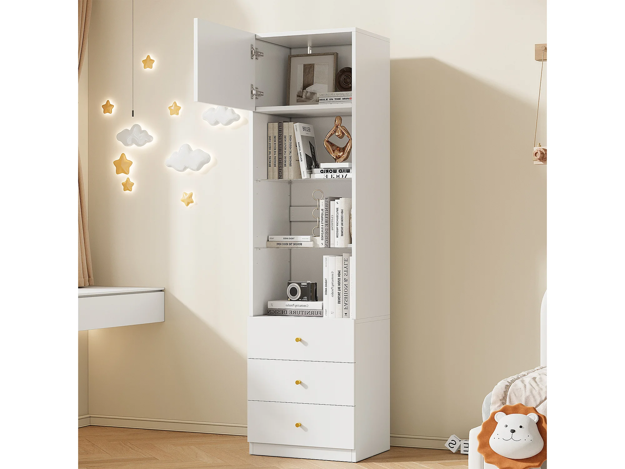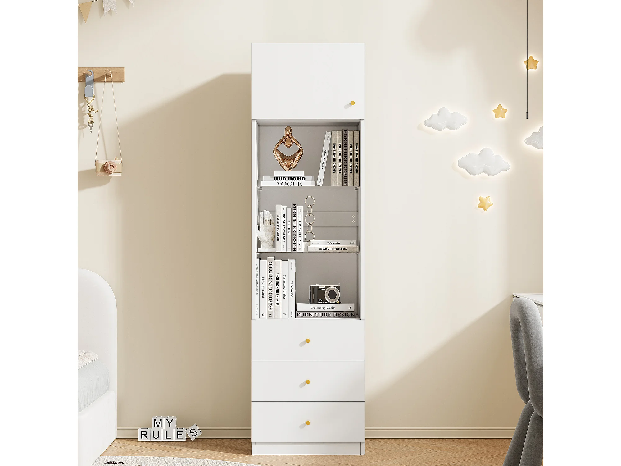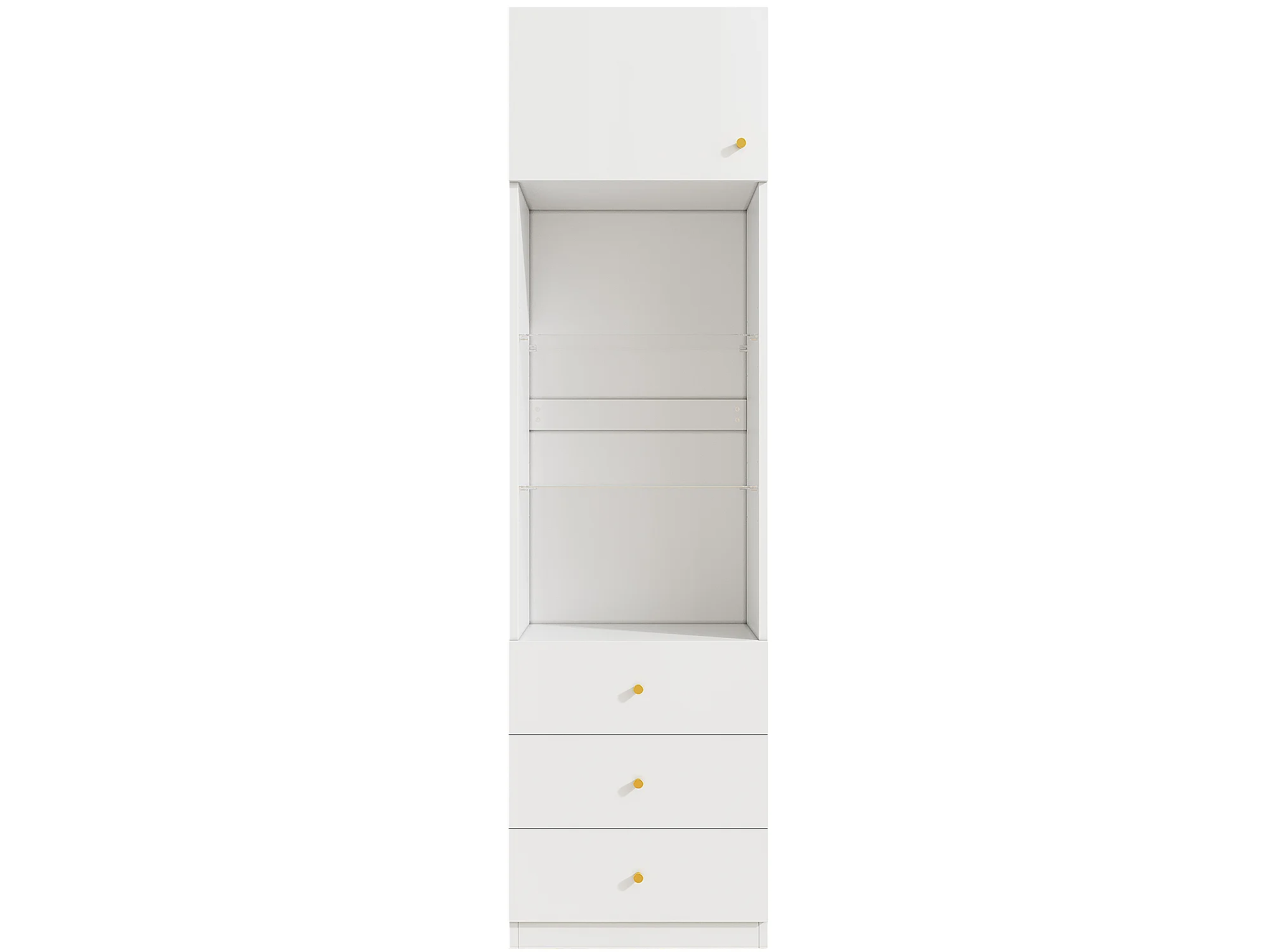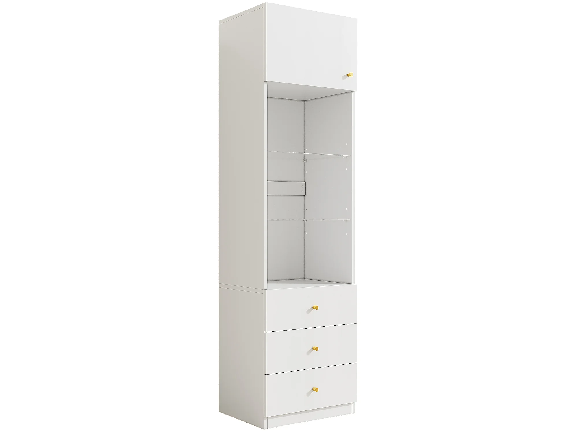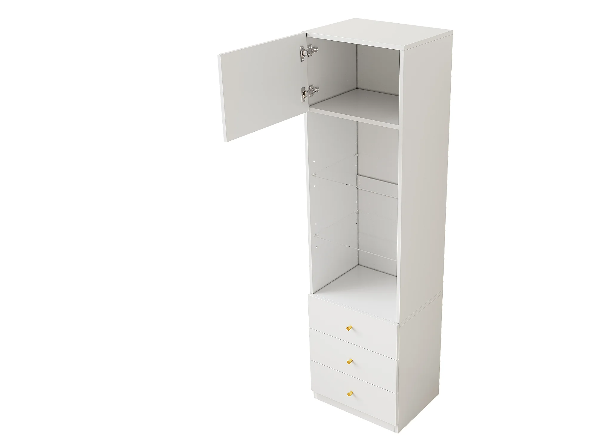 Vitrine, Aufbewahrungsmöbel, Bücherregal - 3 Schubladen und Türen - Verstellbare Glasregale - Weiß - 50×40×180 cm