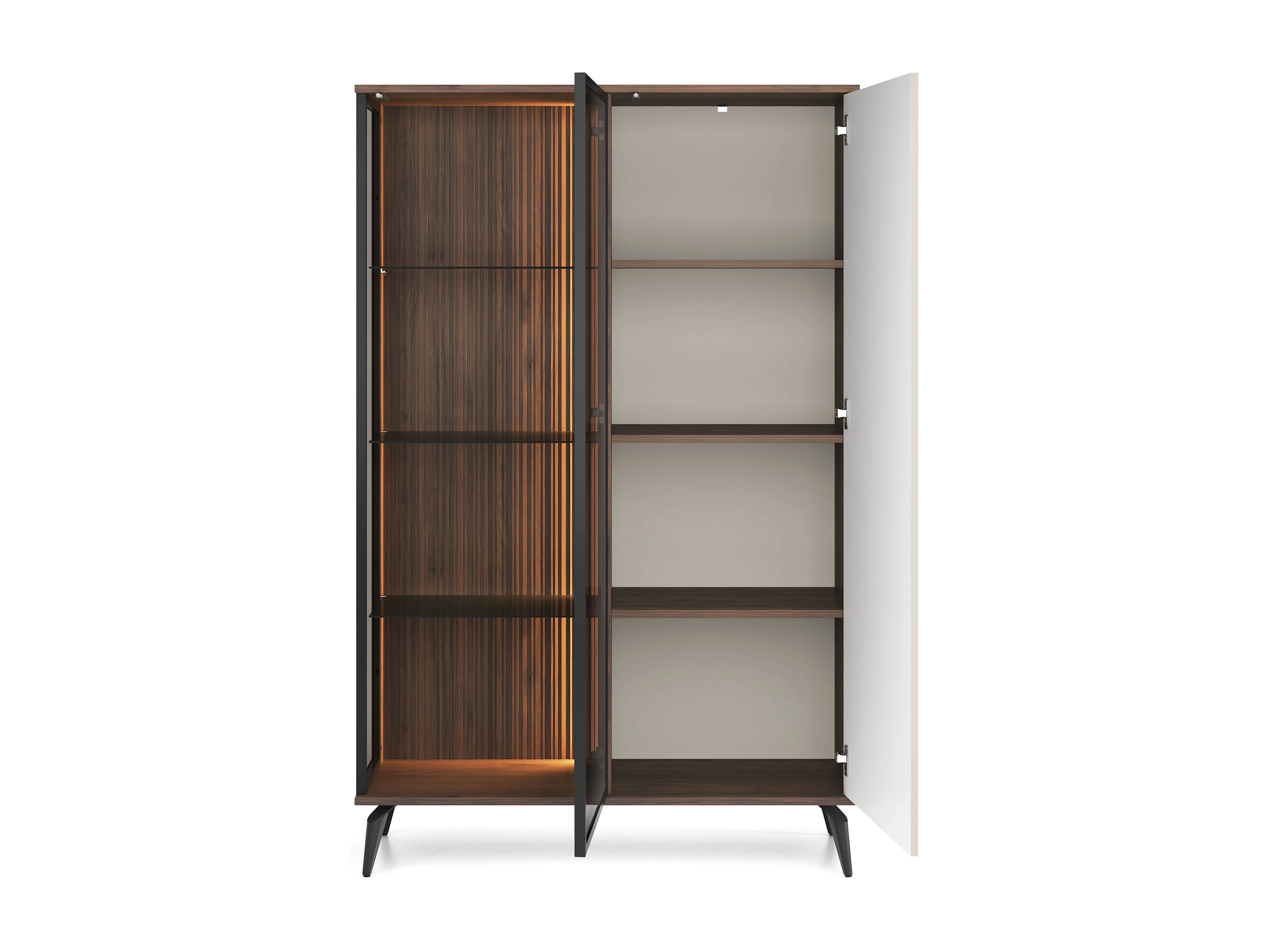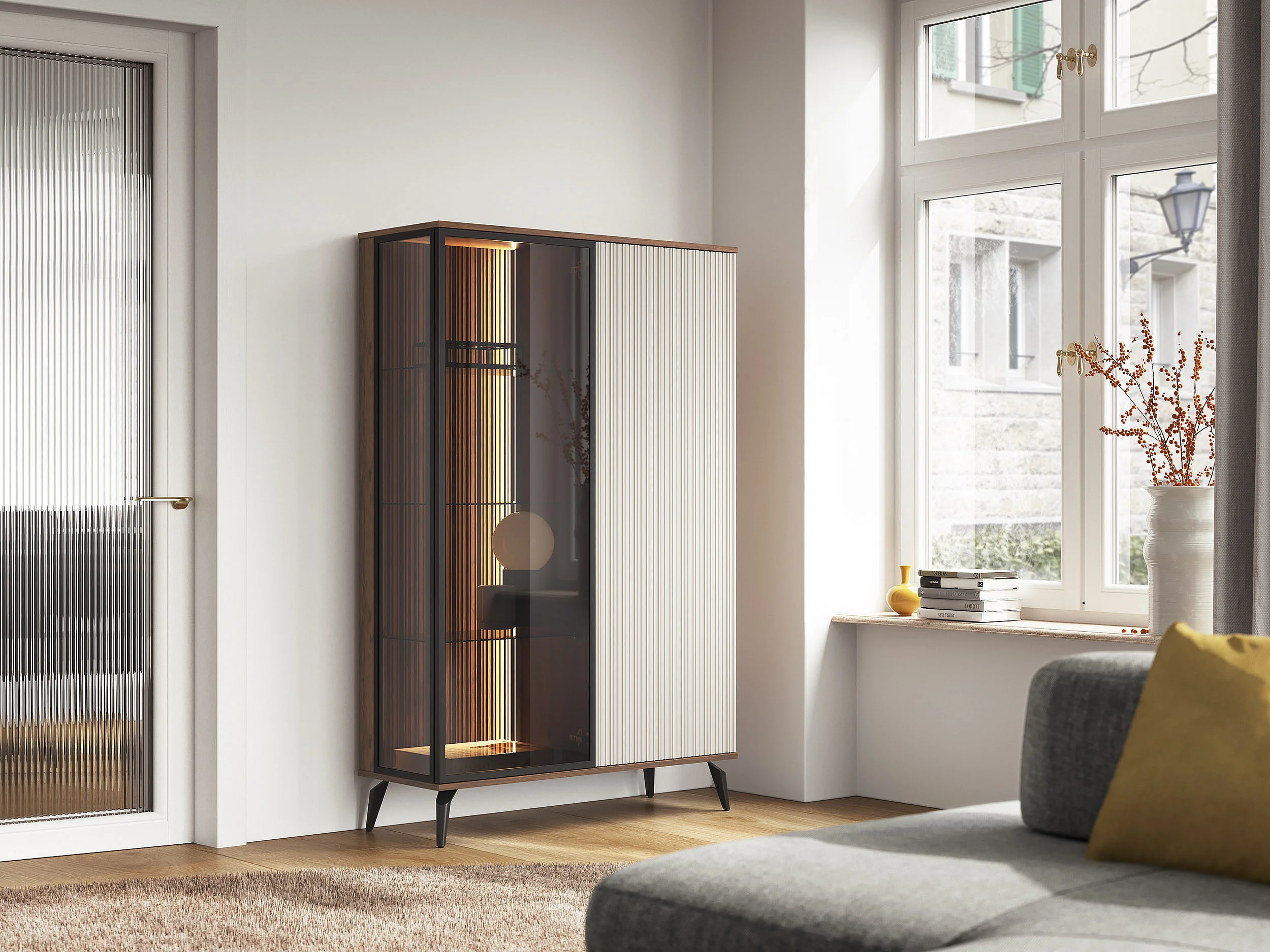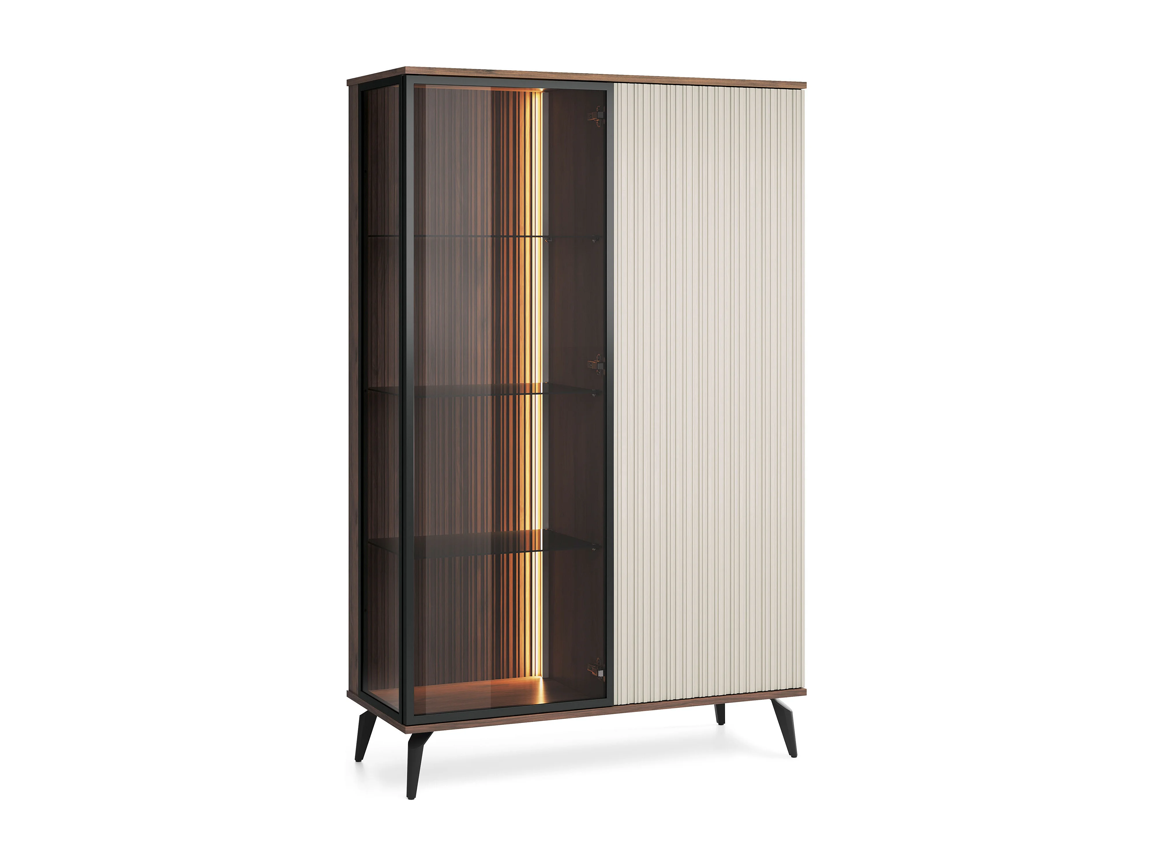 Vitrine, Kaschmir/Warmianischer Nussbaum, 103 x 162 x 39 cm