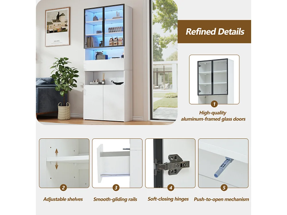 Vitrine,Vitrinenschränke Mit Schubladen und Schränken,Glasvitrine mit LED,Hochschrank mit Offene Speicherplattform ,Bücherschrank 70*30*200cm