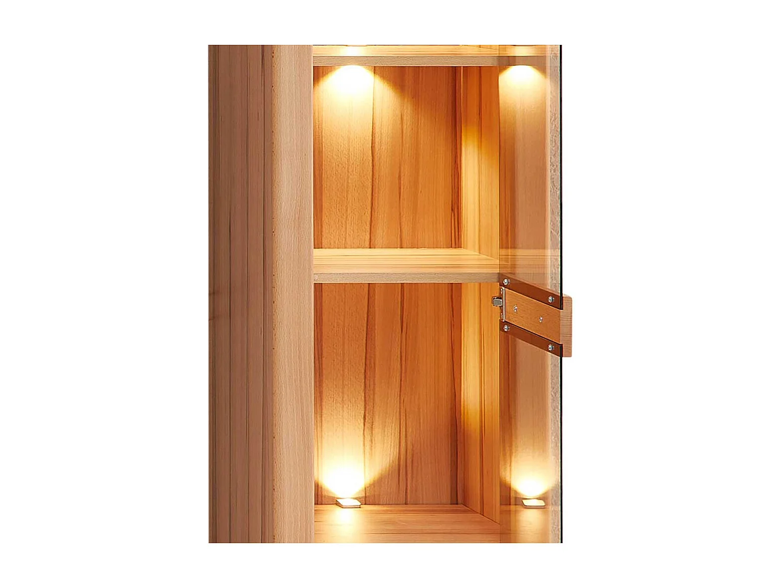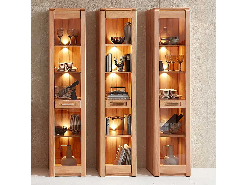 Vitrinenschrank in Kernbuchefarben teilmassiv LED Beleuchtung