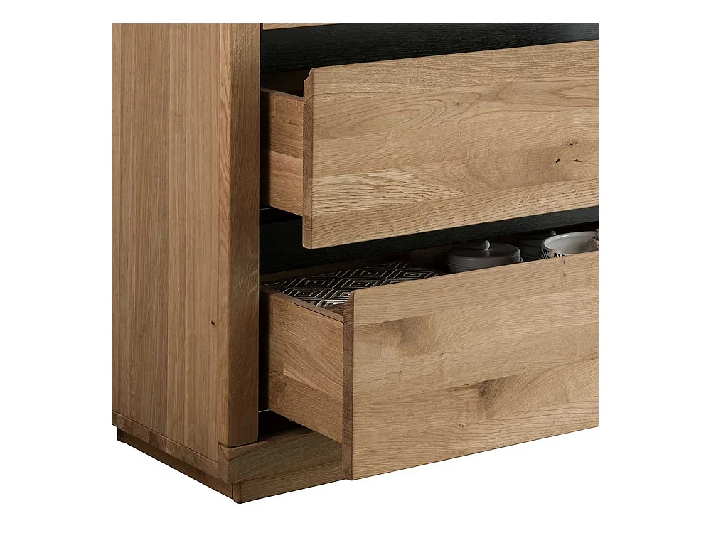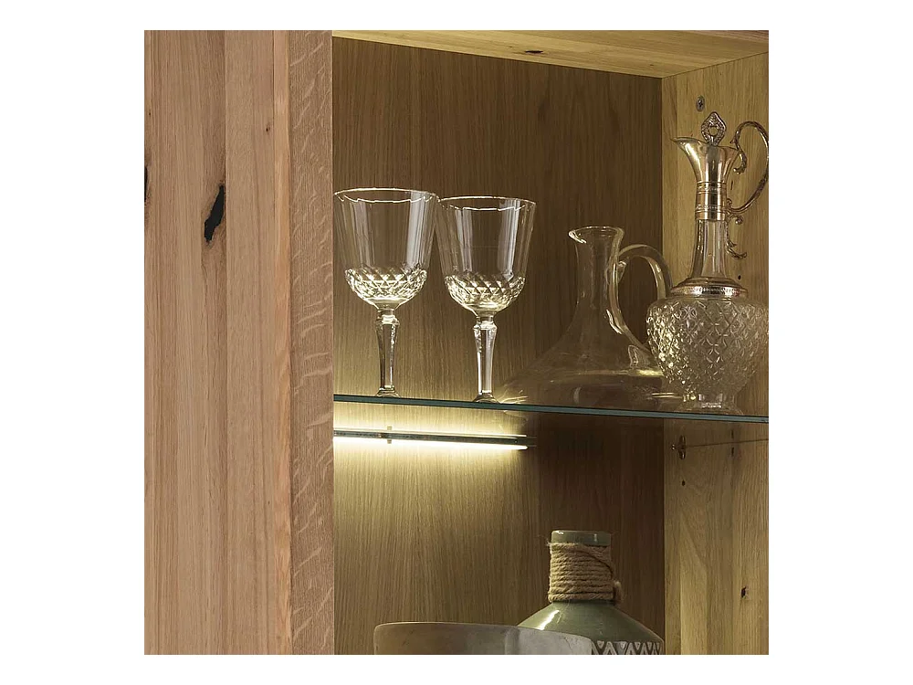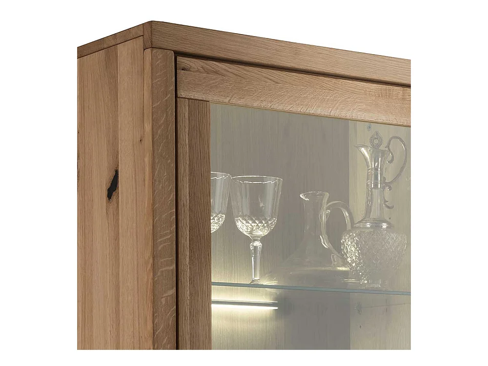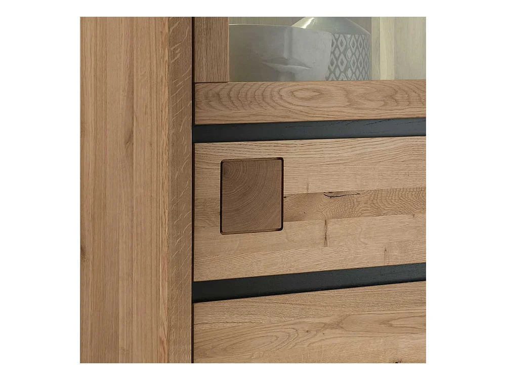 Vitrinenschrank Wildeiche aus Massivholz drei Schubladen