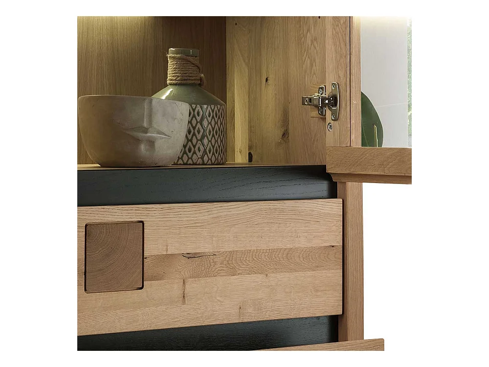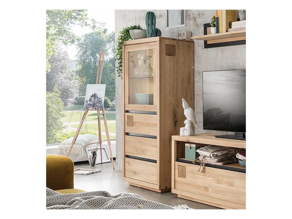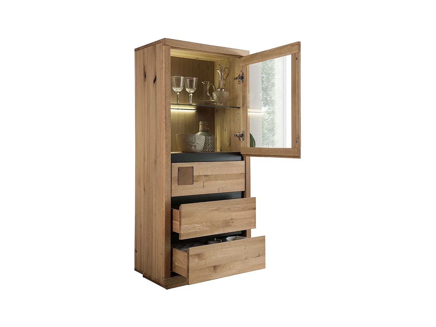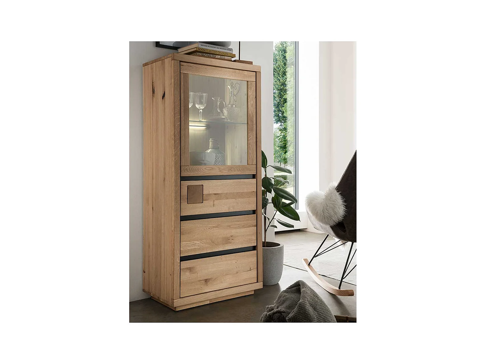 Vitrinenschrank Wildeiche aus Massivholz drei Schubladen