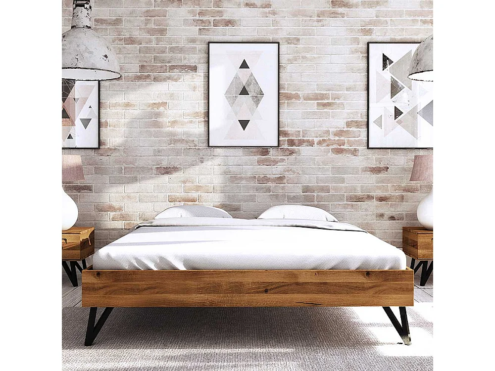 Vollholzbett aus Wildeiche Massivholz und Stahl Kopfteil