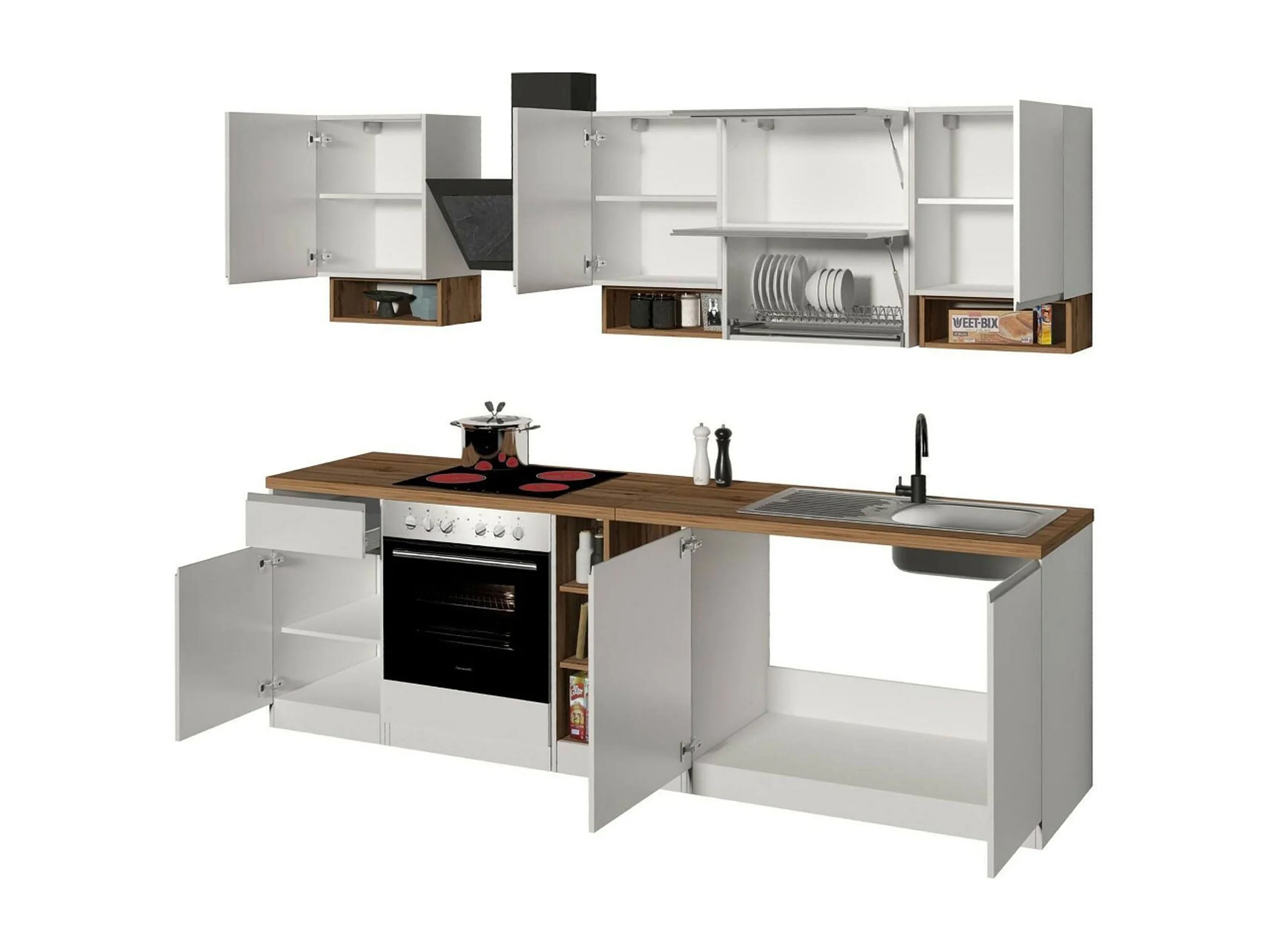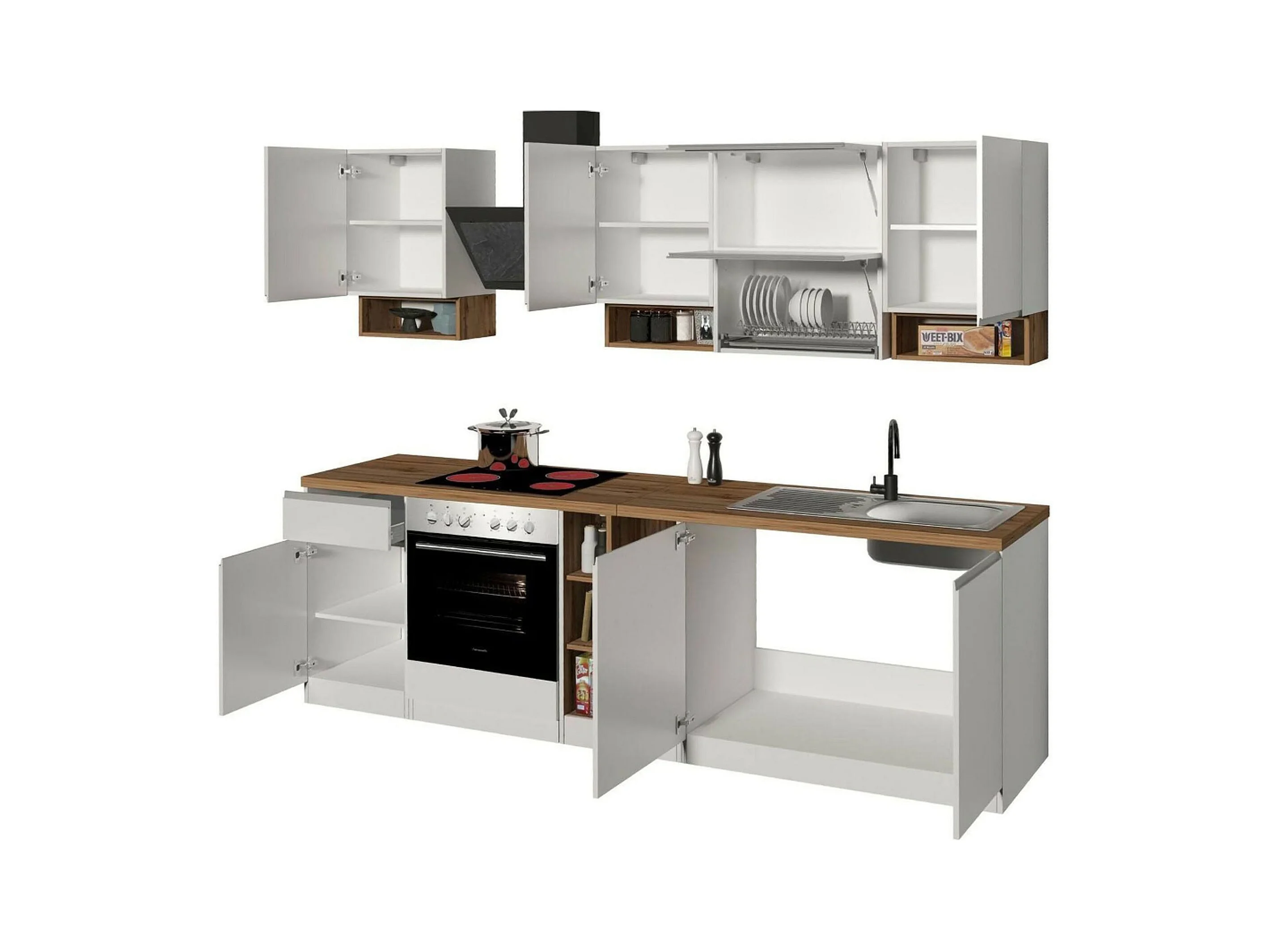 Cocina completa Armend, Set con despensa, Mueble cocina, Kit de bloques con isla y soporte para frigorífico, 100% Made in Italy, Blanco brillo y roble