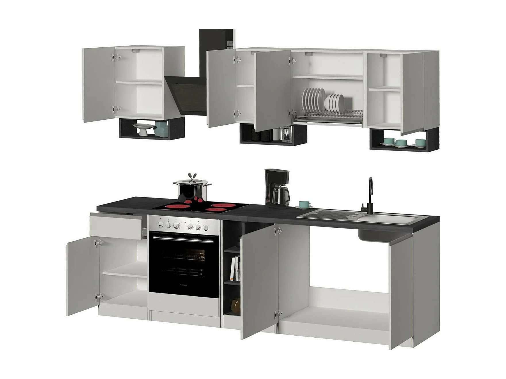 Vollständige Küche Dcelient, Set mit Speisekammer, Küchenzeile Schrank, Linearer Blocksatz, 100 % Made in Italy, 255x60h85 cm, Glänzendes Weiß und Schiefer