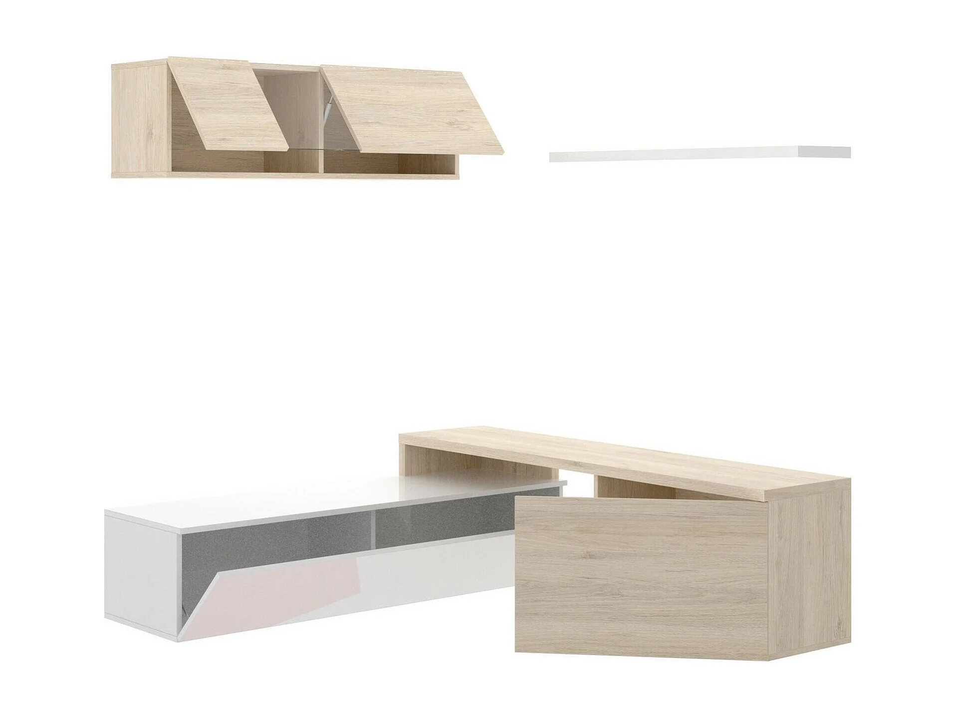 Wandeinheit Dagnell, modulares Eck-Wohnzimmerset, Wohnzimmermöbel Multiposition TV-Ständer, 201 x 41 x 180 cm, Weiß und Eiche