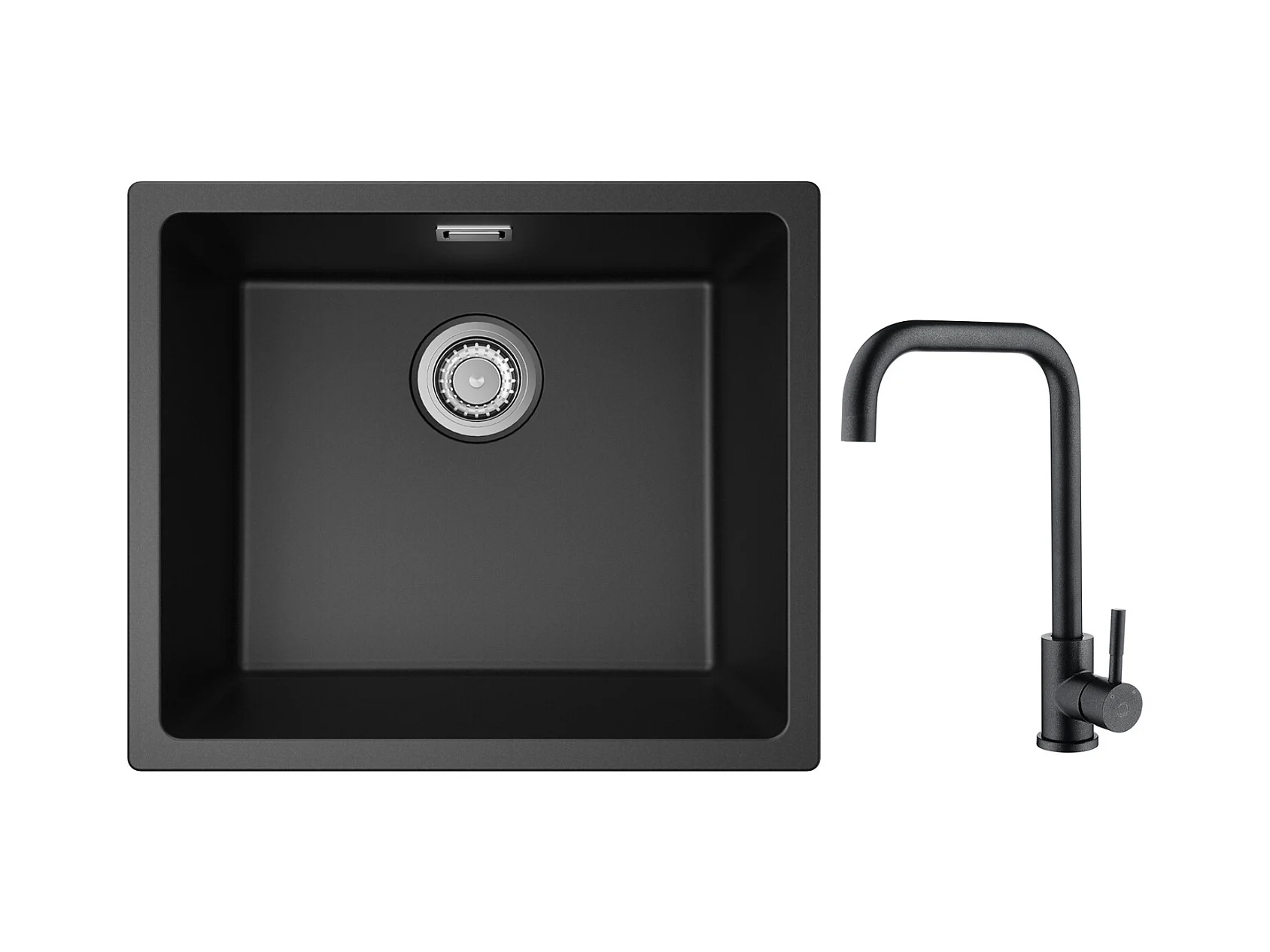 Einzelspüle aus Quarz und Kunstharz, 3 Montageoptionen, 50 x 44 x 20 cm + Küchenmischbatterie aus Edelstahl in Sternschwarz mit hohem, gebogenem Auslauf