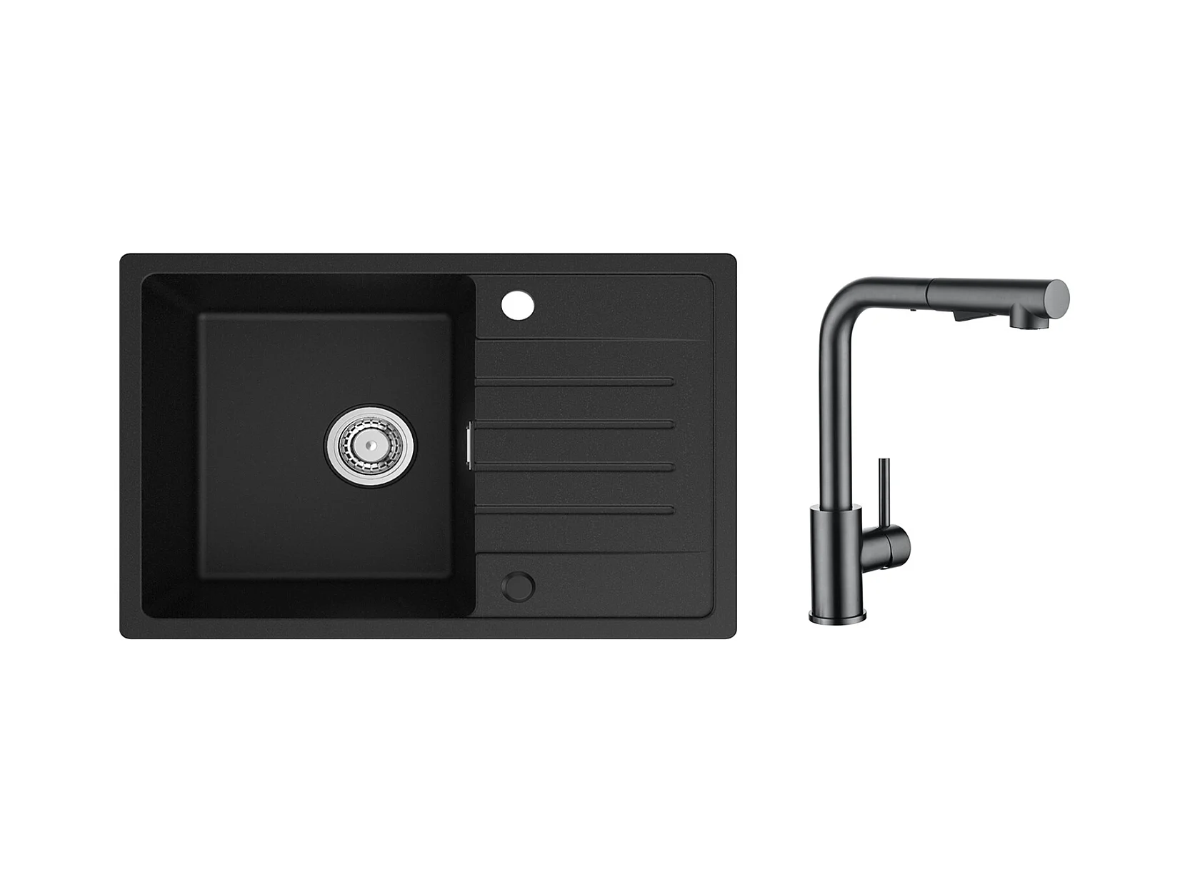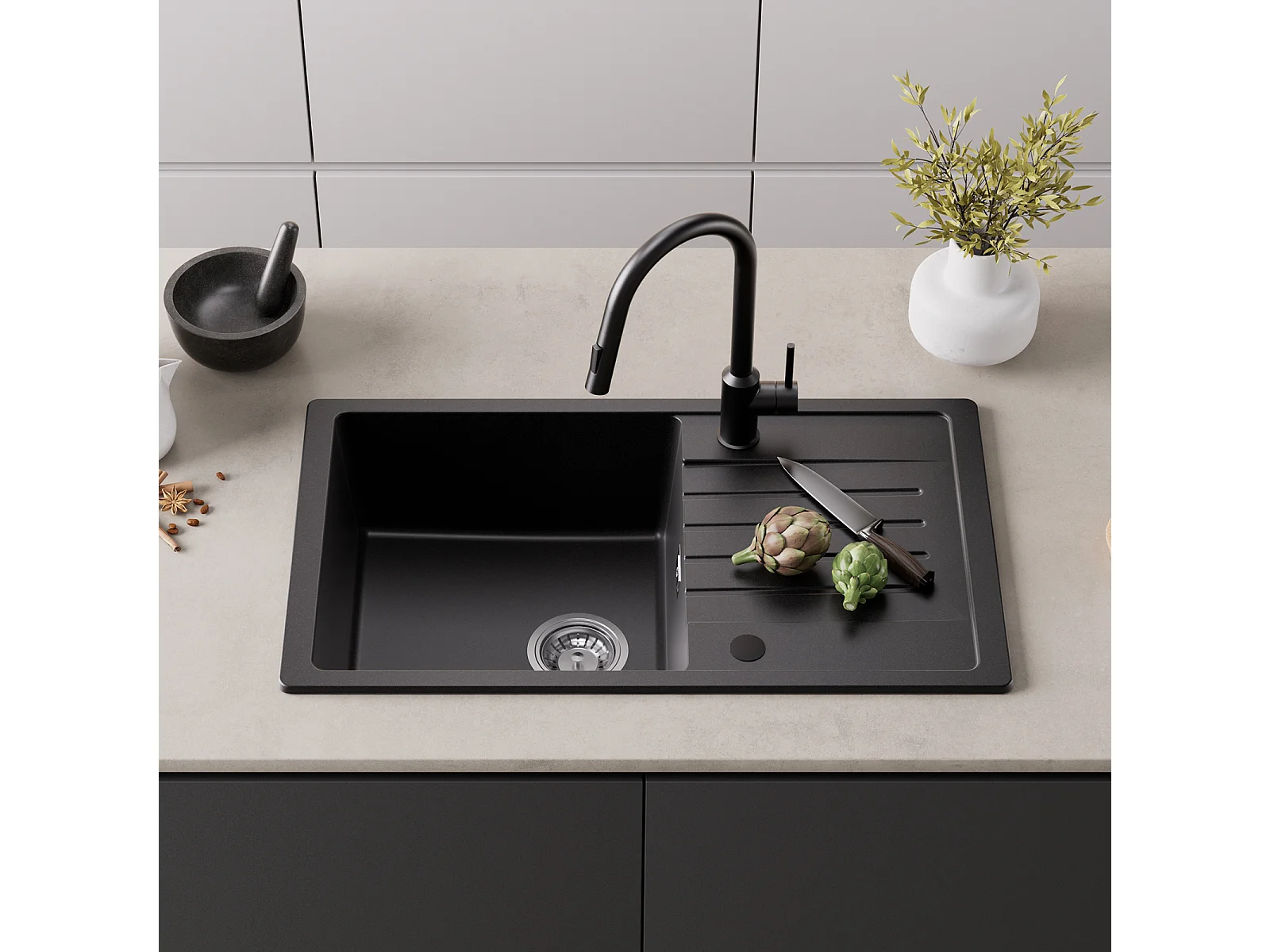 Einzelspüle aus Quarz und Kunstharz – schwarze Spüle mit Abtropffläche 78 x 45 cm + Küchenmischbatterie mit ausziehbarer Brause