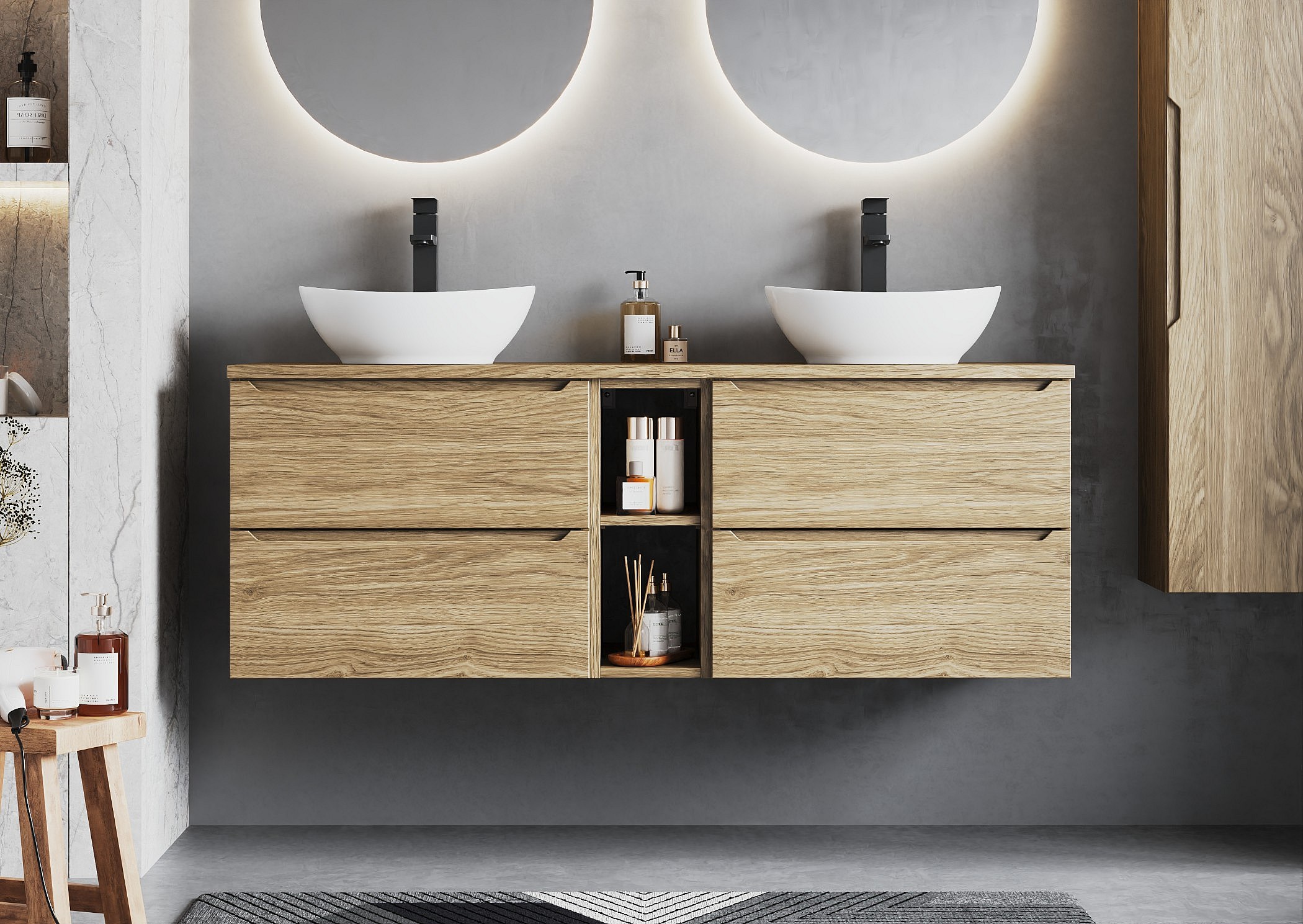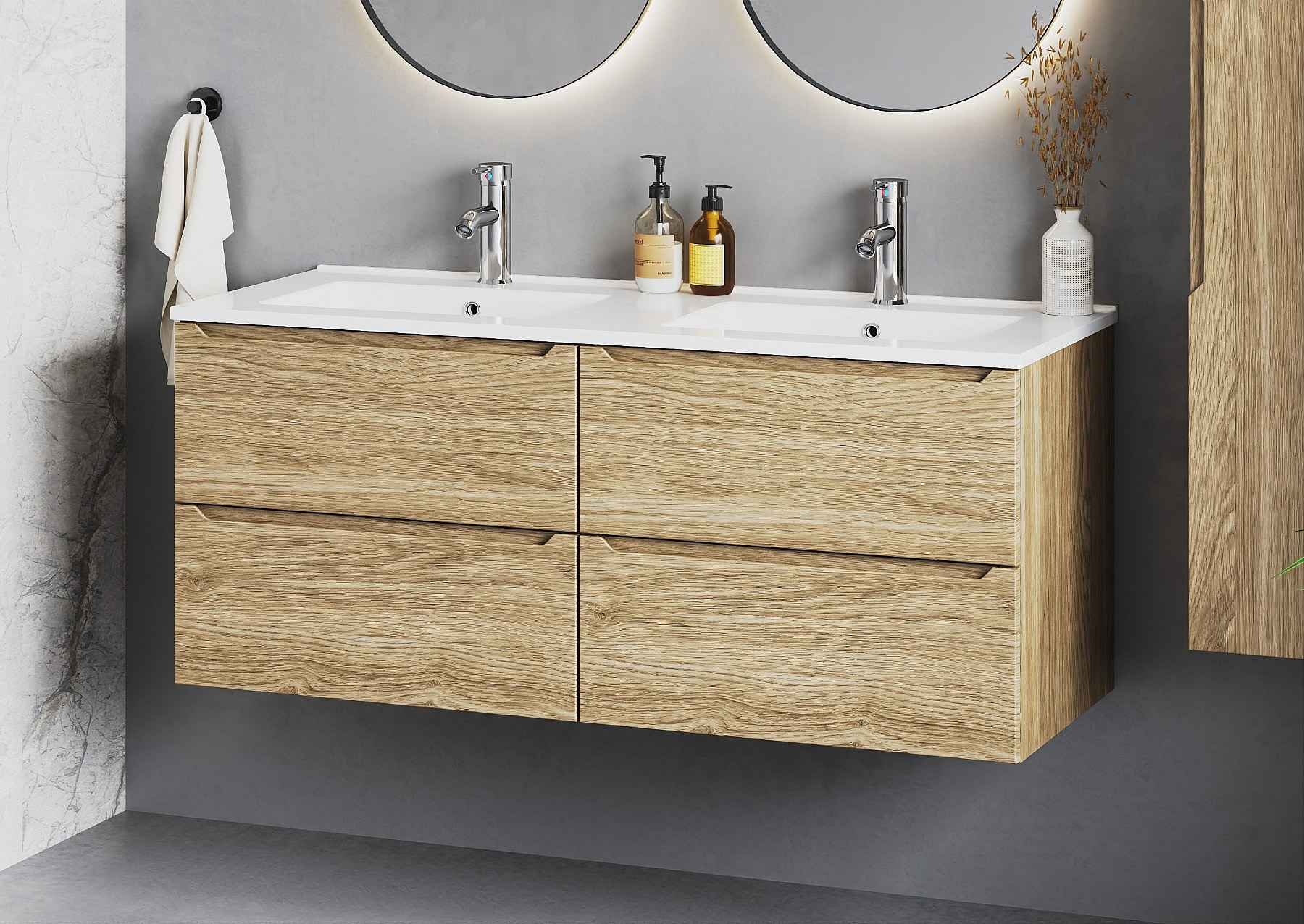 Die Kollektion ist nicht nur eine Kombination aus zeitlosem Design und Funktionalität – sie ist auch eine Garantie für solide Verarbeitung. Die Verwendung langlebiger Materialien gewährleistet Feuchtigkeitsbeständigkeit und Alltagstauglichkeit, was unter den anspruchsvollen Bedingungen im Badezimmer von entscheidender Bedeutung ist.