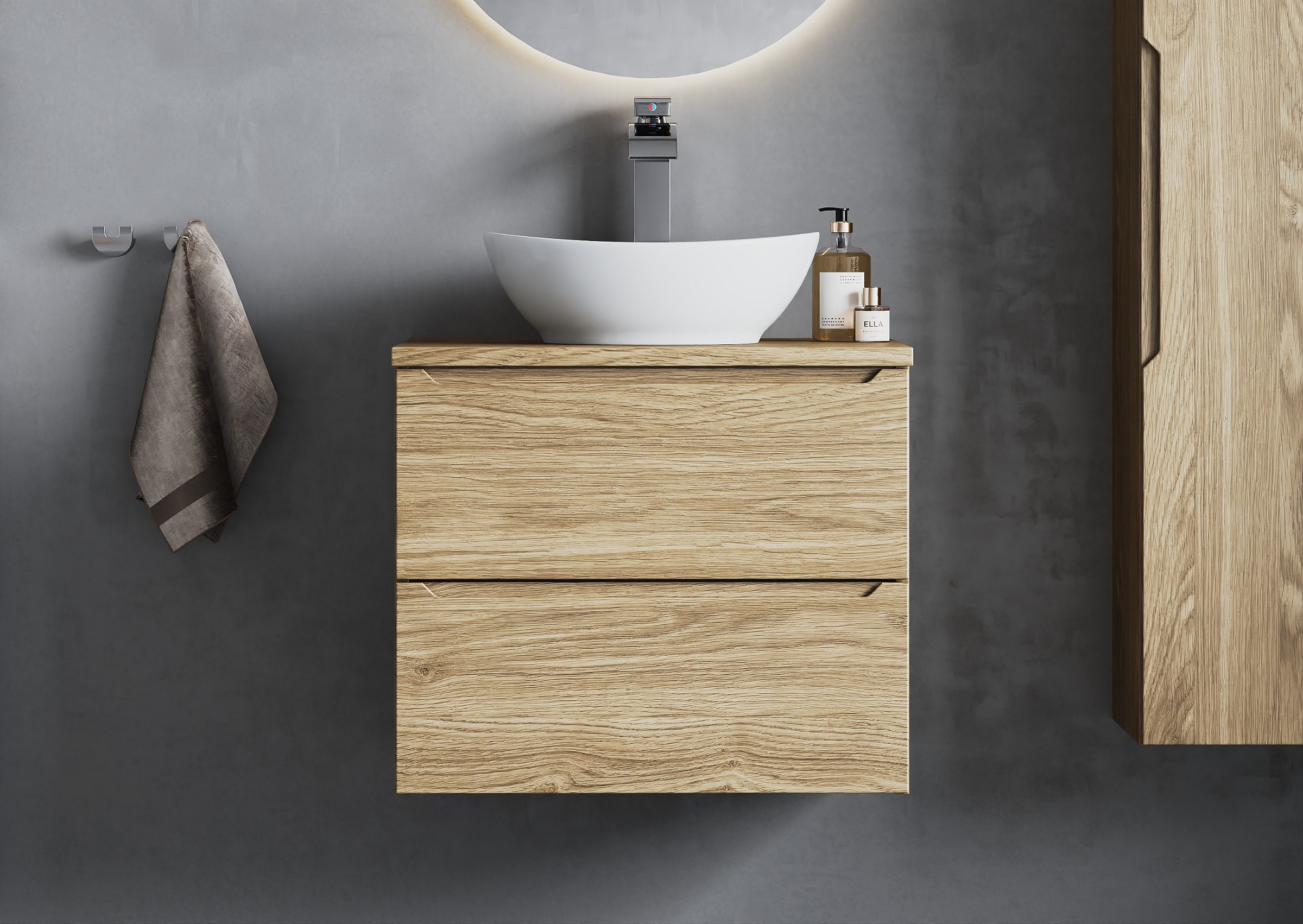 Die Kollektion Etna ist die Essenz minimalistischen Designs und durchdachter Funktionalität, entworfen für moderne Badezimmer, in denen sowohl Ästhetik als auch Komfort im Vordergrund stehen. Die Waschbeckenschränke sind in den Größen 60 und 80 cm erhältlich, ergänzt wird das Ganze durch einen hohen Schrank – alles so konzipiert, dass fertige, einheitliche Sets mit Arbeitsplatten, Regalen und Waschbecken zusammengestellt werden können.