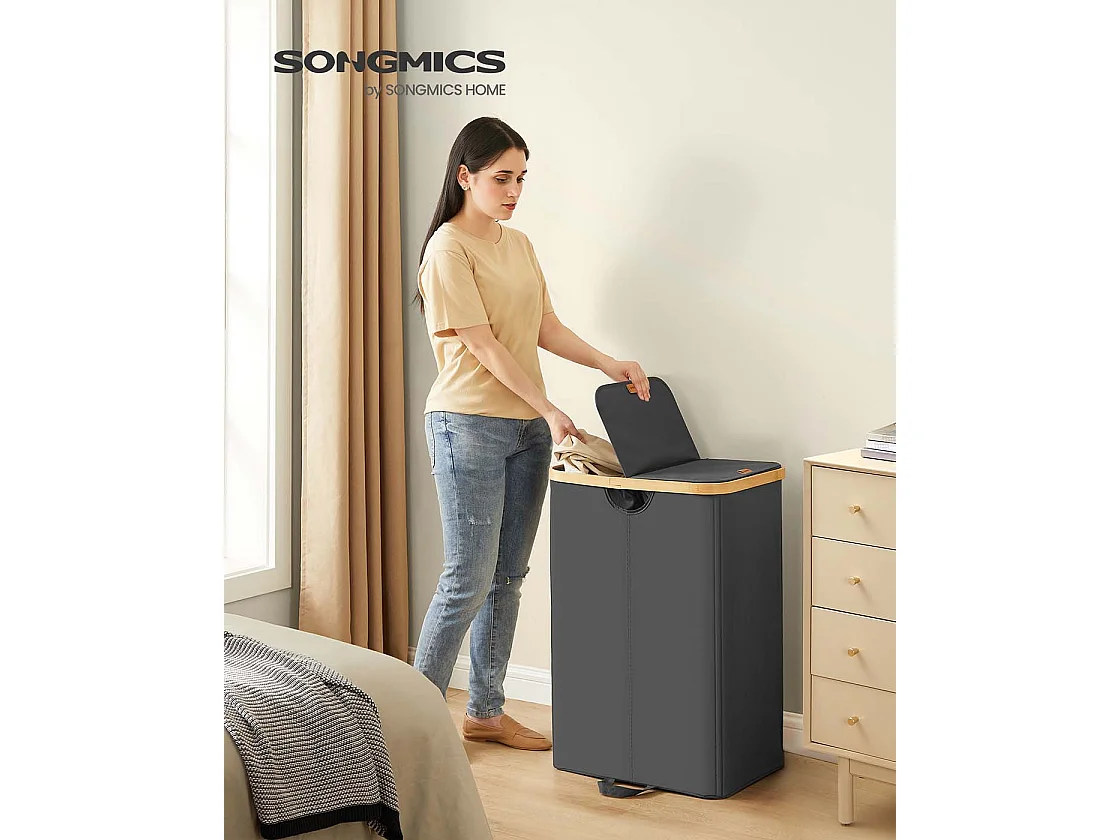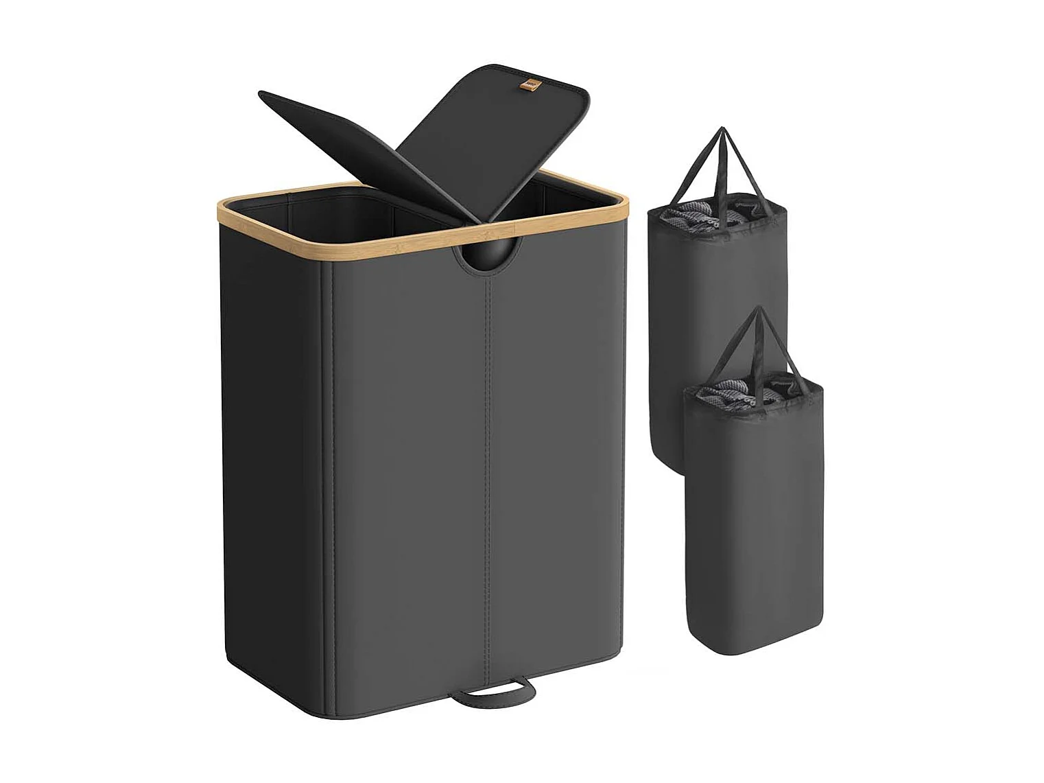 Wäschekorb mit zwei Fächern und Deckel Tintenschwarz und Naturbeige