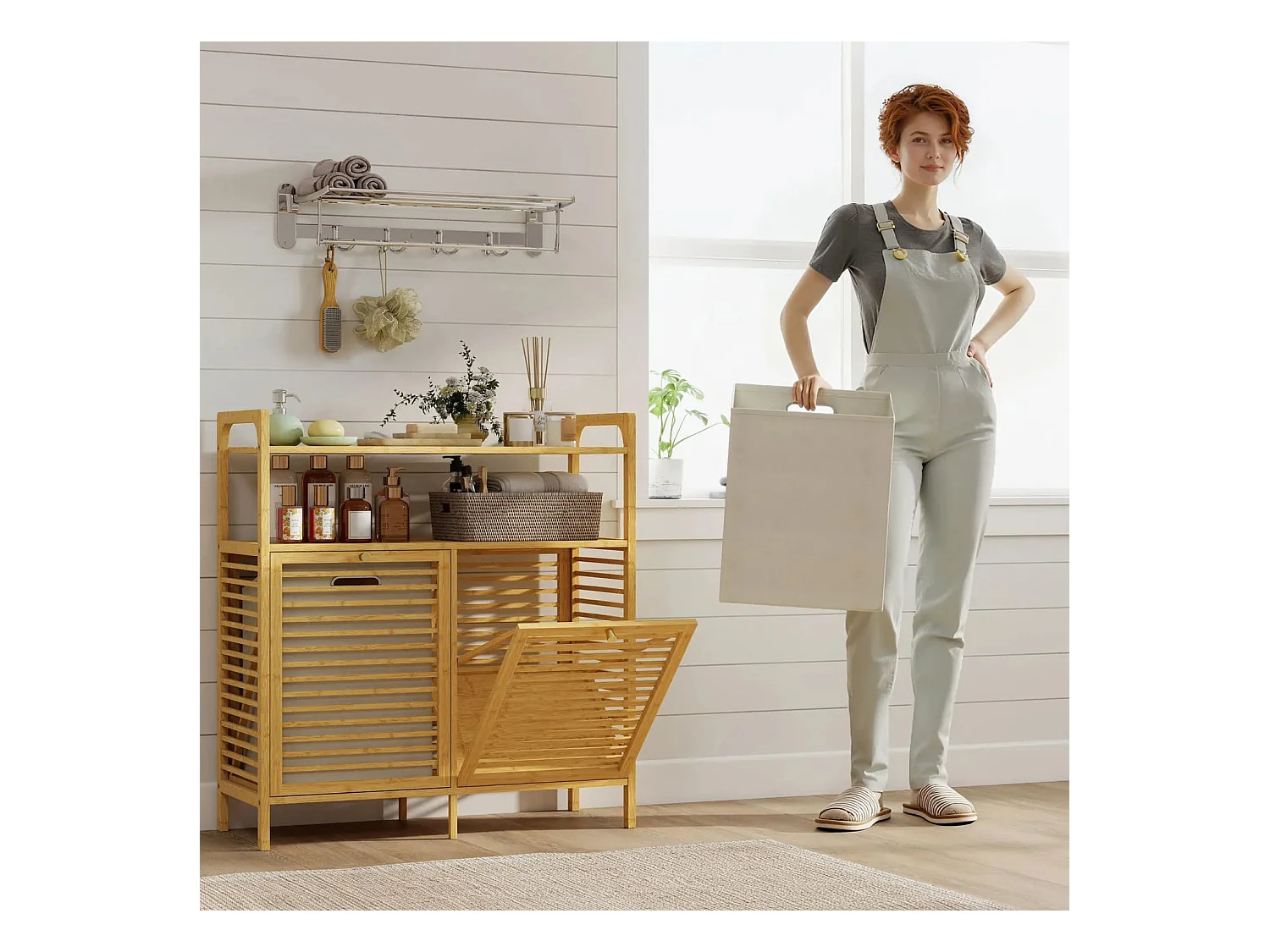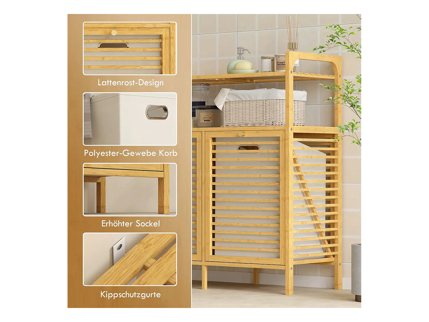 Wäscheregal mit 2 Wäschekörben, freistehendes Bambusregal für Badezimmer, Waschküche, Naturholz+Cremeweiß