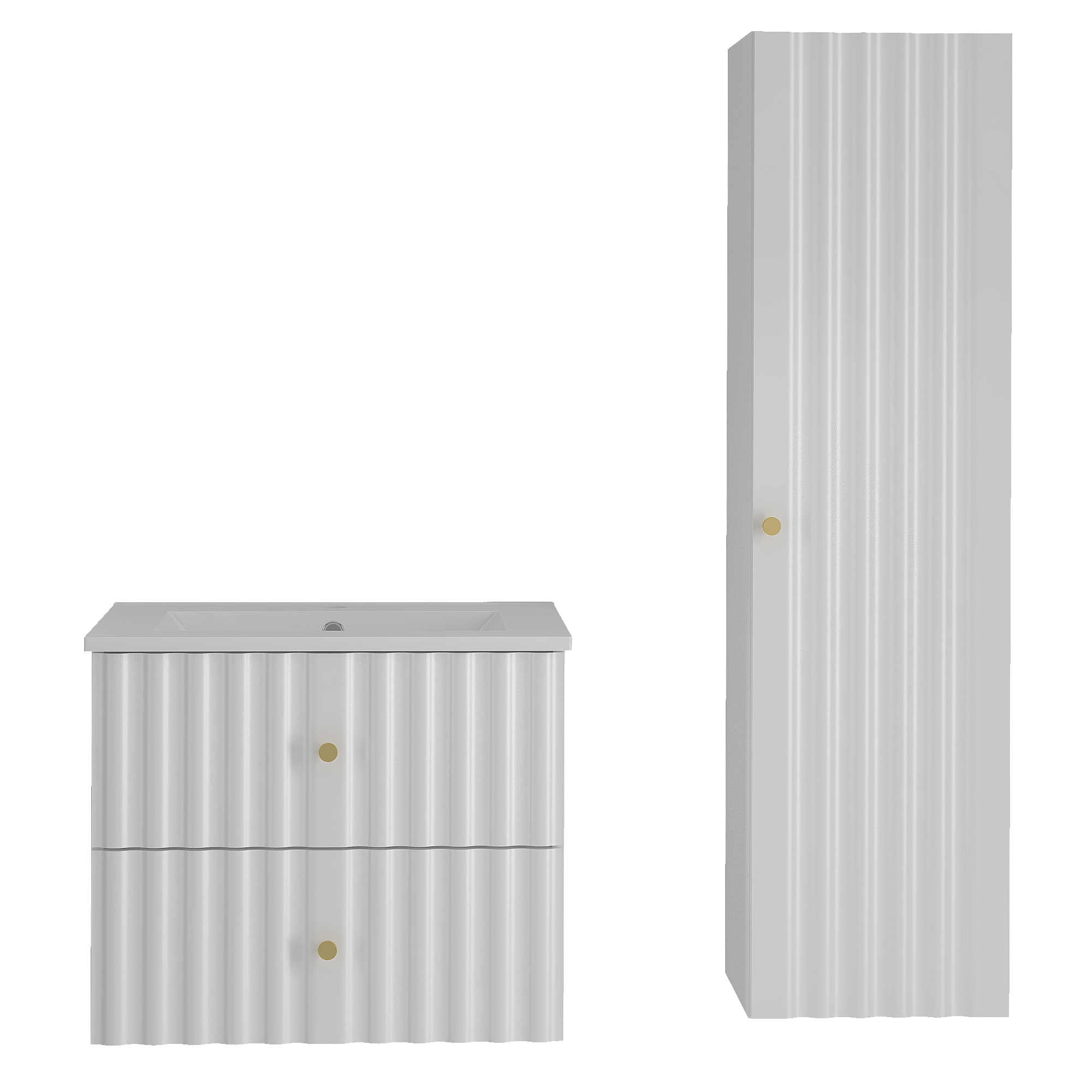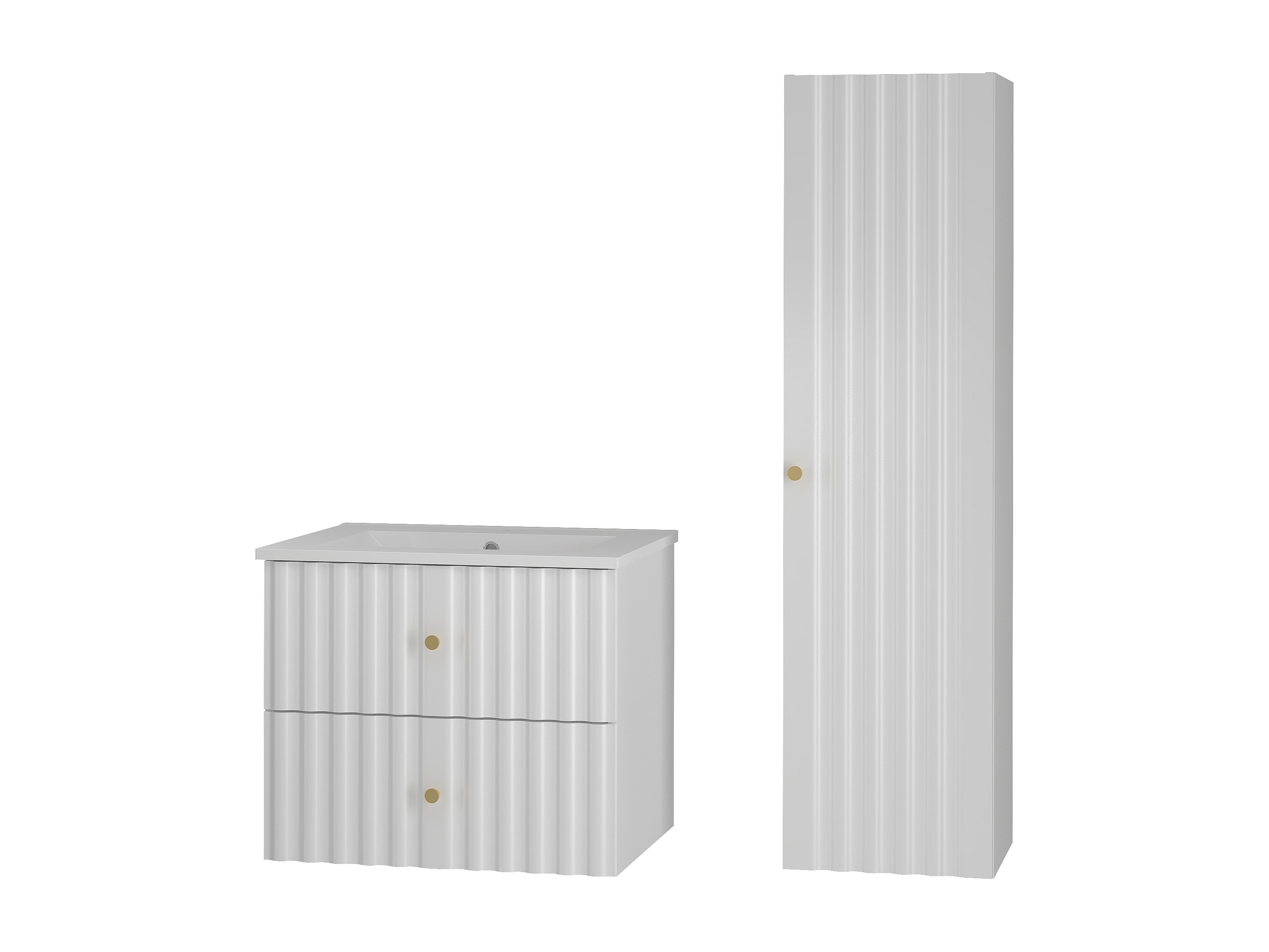 Weiß Badezimmer Set 60cm Badezimmerschrank mit Waschbecken und Hochschrank geriffelte Fronten Aqua