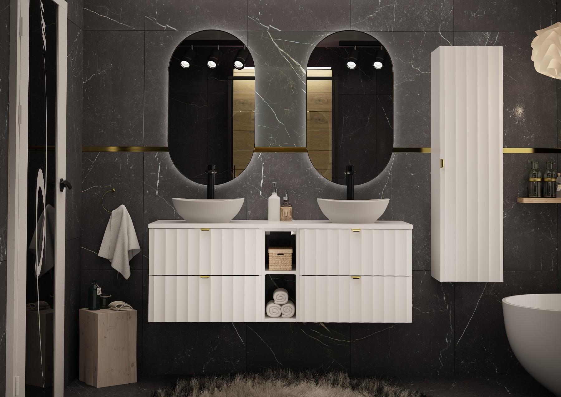 Die Kollektion besteht aus Waschtischunterschränken in den Größen 60 und 80 cm, einer hohen Säule, einem 20 cm hohen Regal und Arbeitsplatten. In Kombination mit den empfohlenen Möbeln oder Aufsatzwaschbecken und Spiegeln oder Spiegelschränken können wir so eine Vielzahl von Sets zusammenstellen, die sich an unterschiedliche Raumgrößen und -einrichtungen anpassen.