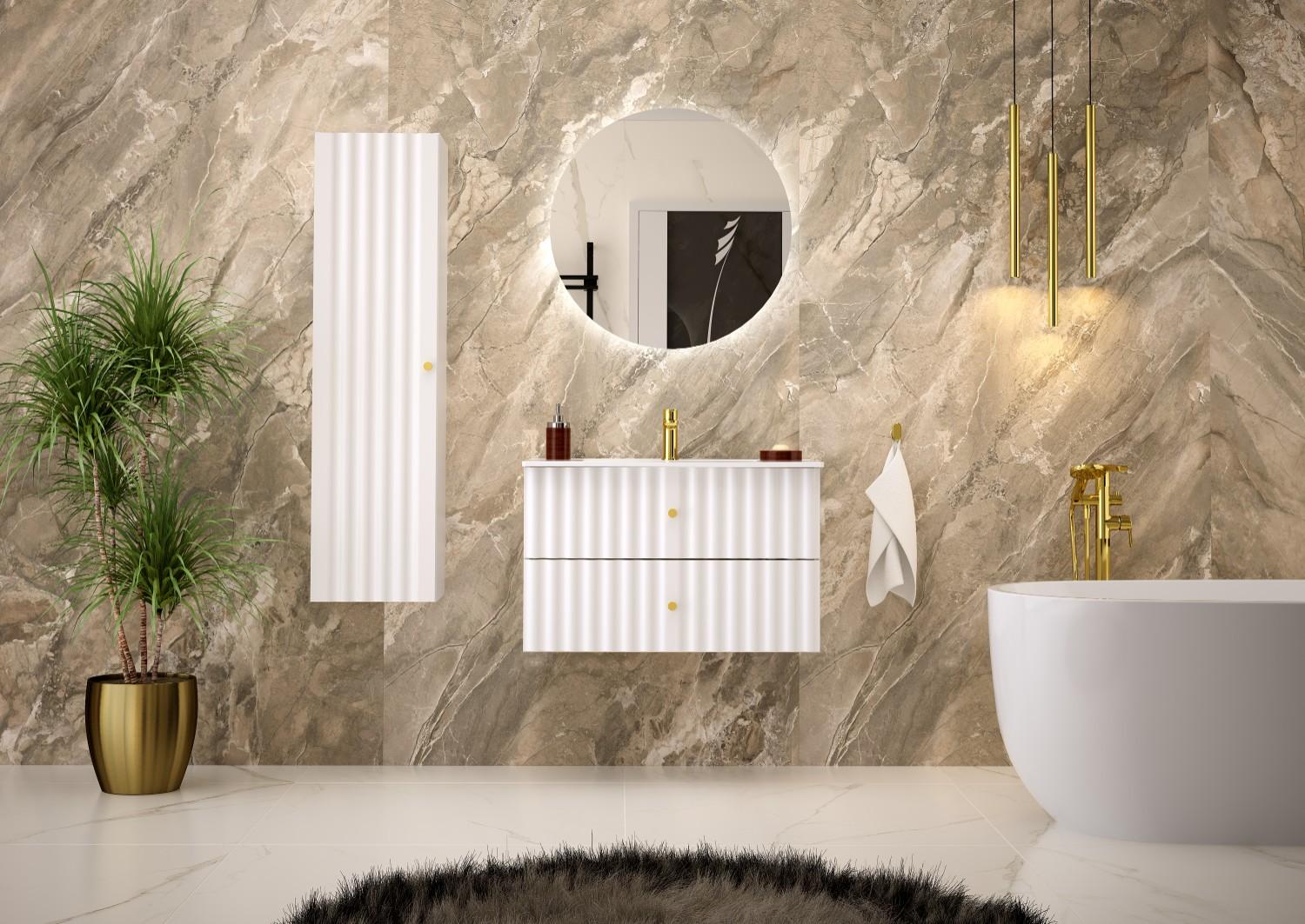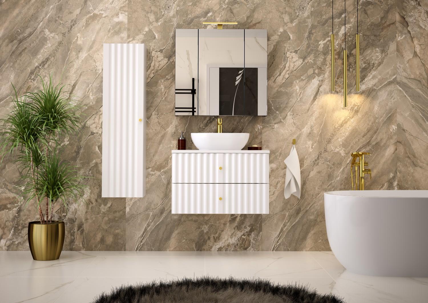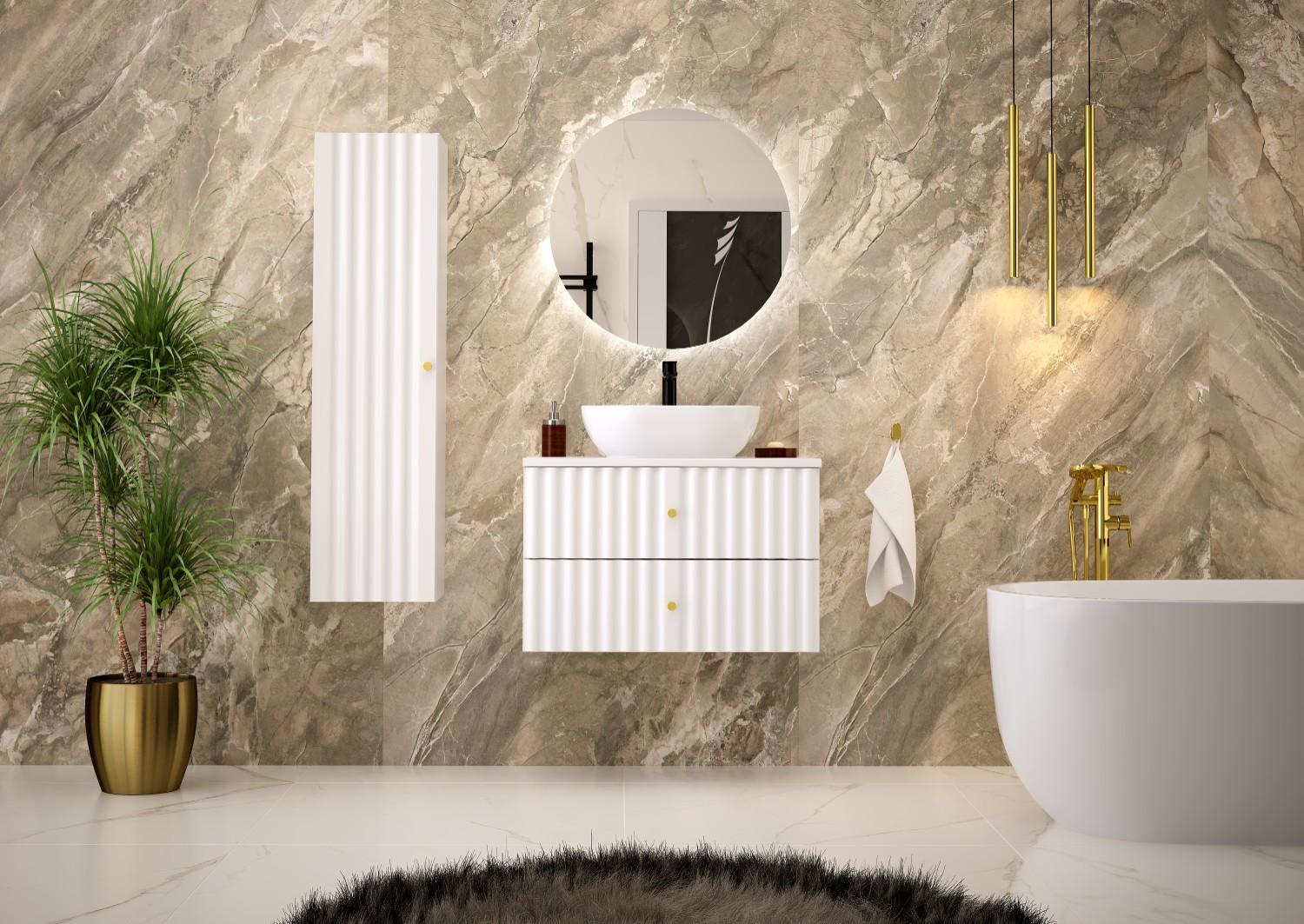 Die Kollektion besteht aus Waschtischunterschränken in den Größen 60 und 80 cm, einer hohen Säule, einem 20 cm hohen Regal und Arbeitsplatten. In Kombination mit den empfohlenen Möbeln oder Aufsatzwaschbecken und Spiegeln oder Spiegelschränken können wir so eine Vielzahl von Sets zusammenstellen, die sich an unterschiedliche Raumgrößen und -einrichtungen anpassen.
