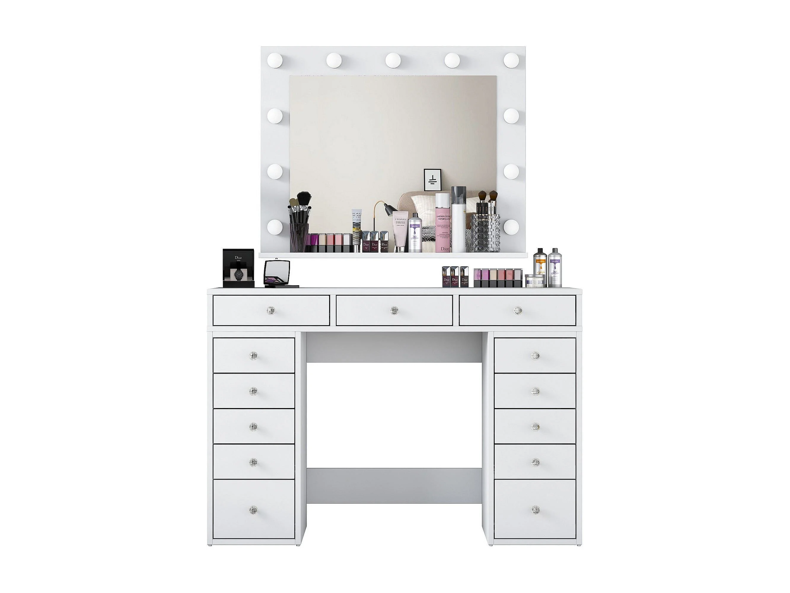 Weiße Holz-Frisiertisch "Sirma" mit beleuchtetem Spiegel, 11 Glühbirnen, 13 Schubladen und Regal – 120x44x82 cm