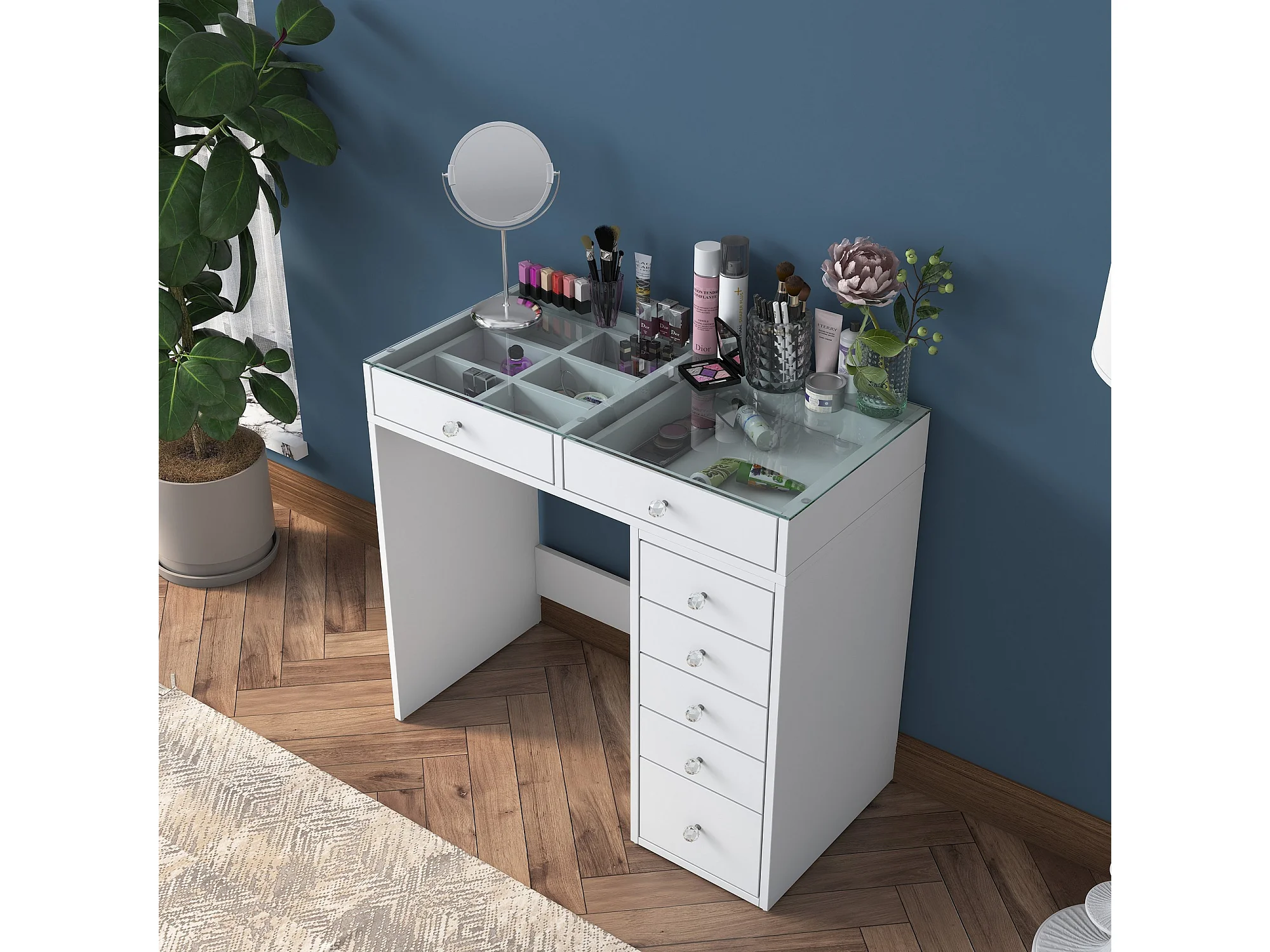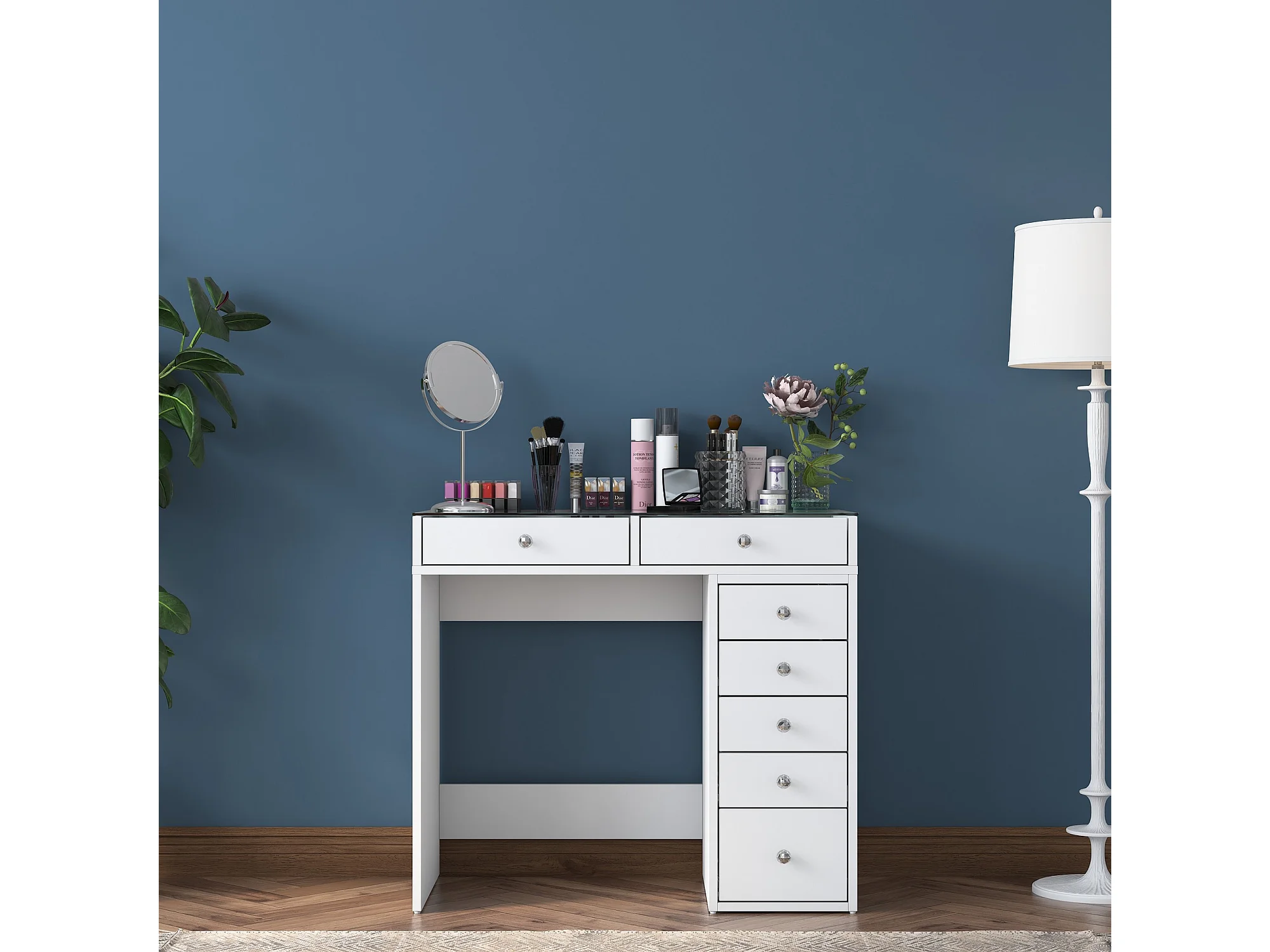 Weiße Holz-Frisiertisch "Soma" 90x44x80 cm mit 7 Schubladen und transparentem Glasplatte