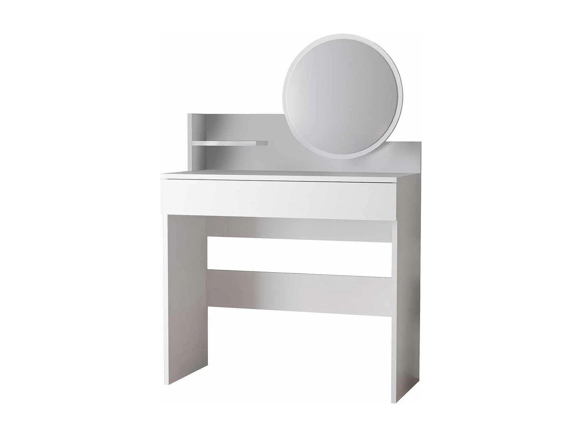 Weiße Holzfrisiertisch "Harmony Mini Round" mit Spiegel, Schublade mit 6 Fächern und Ablage – 90x40x133 cm