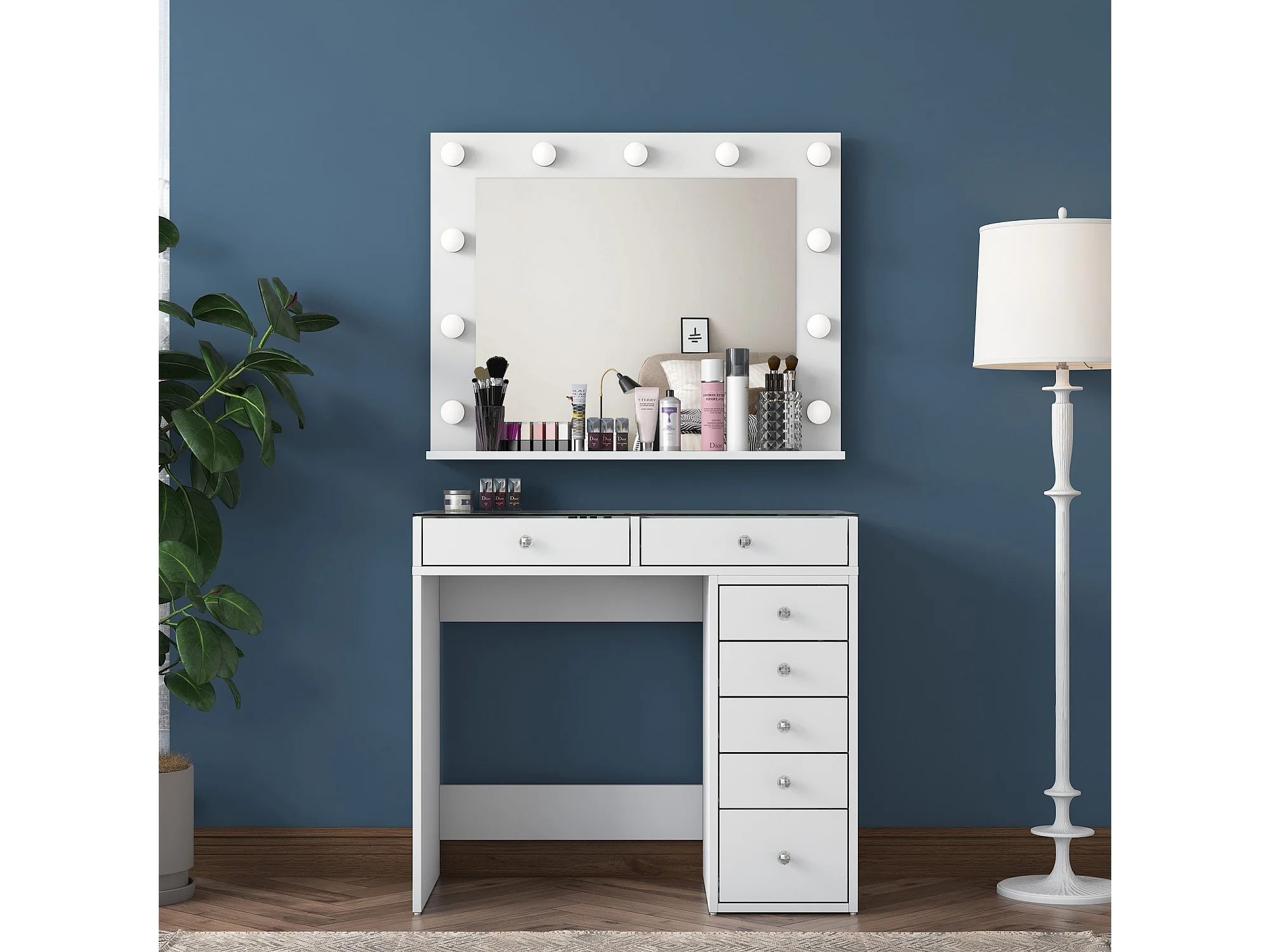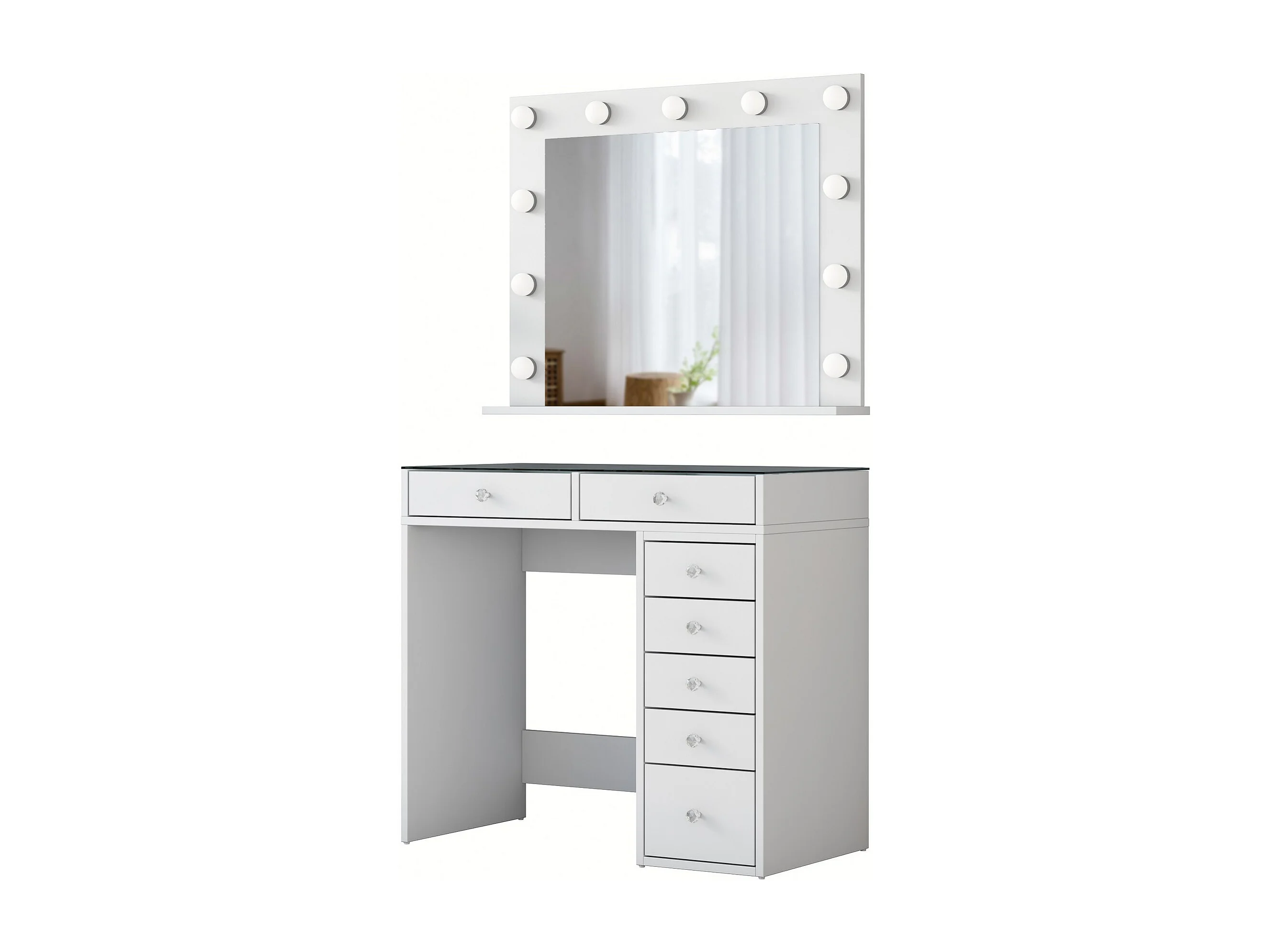 Weiße Holzfrisiertisch "Kona" mit beleuchtetem Spiegel 11 Glühbirnen, 5 Schubladen und Regal - 90x44x80 cm