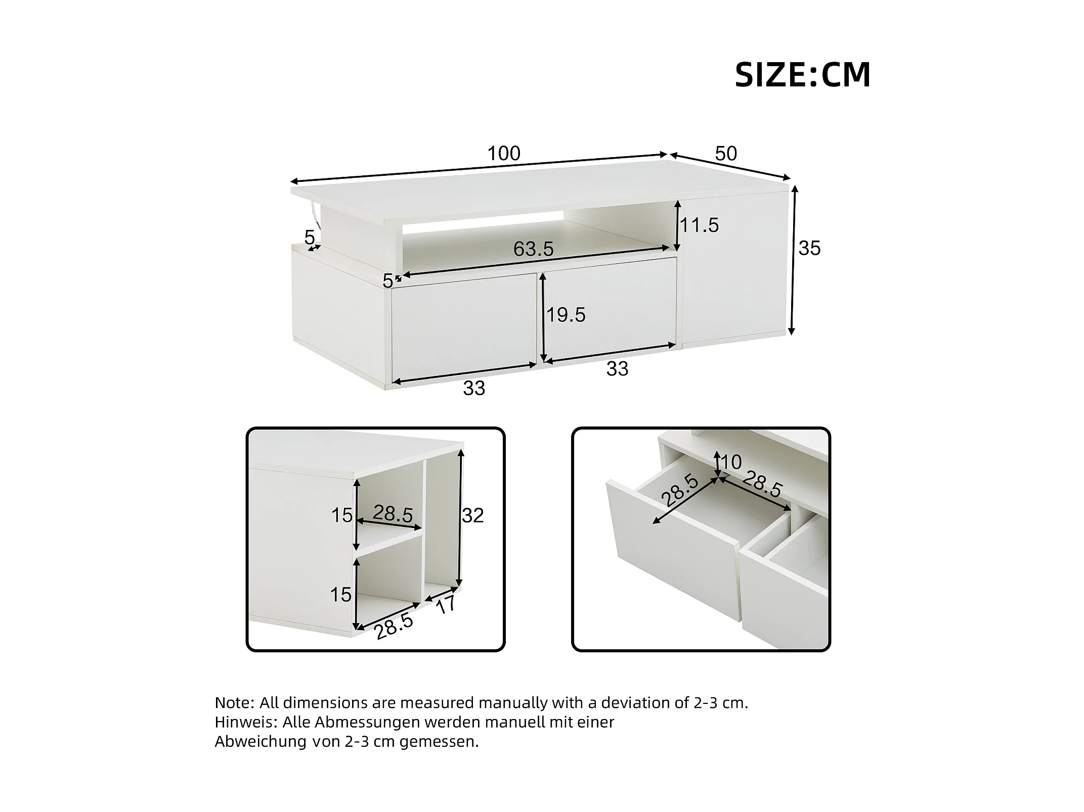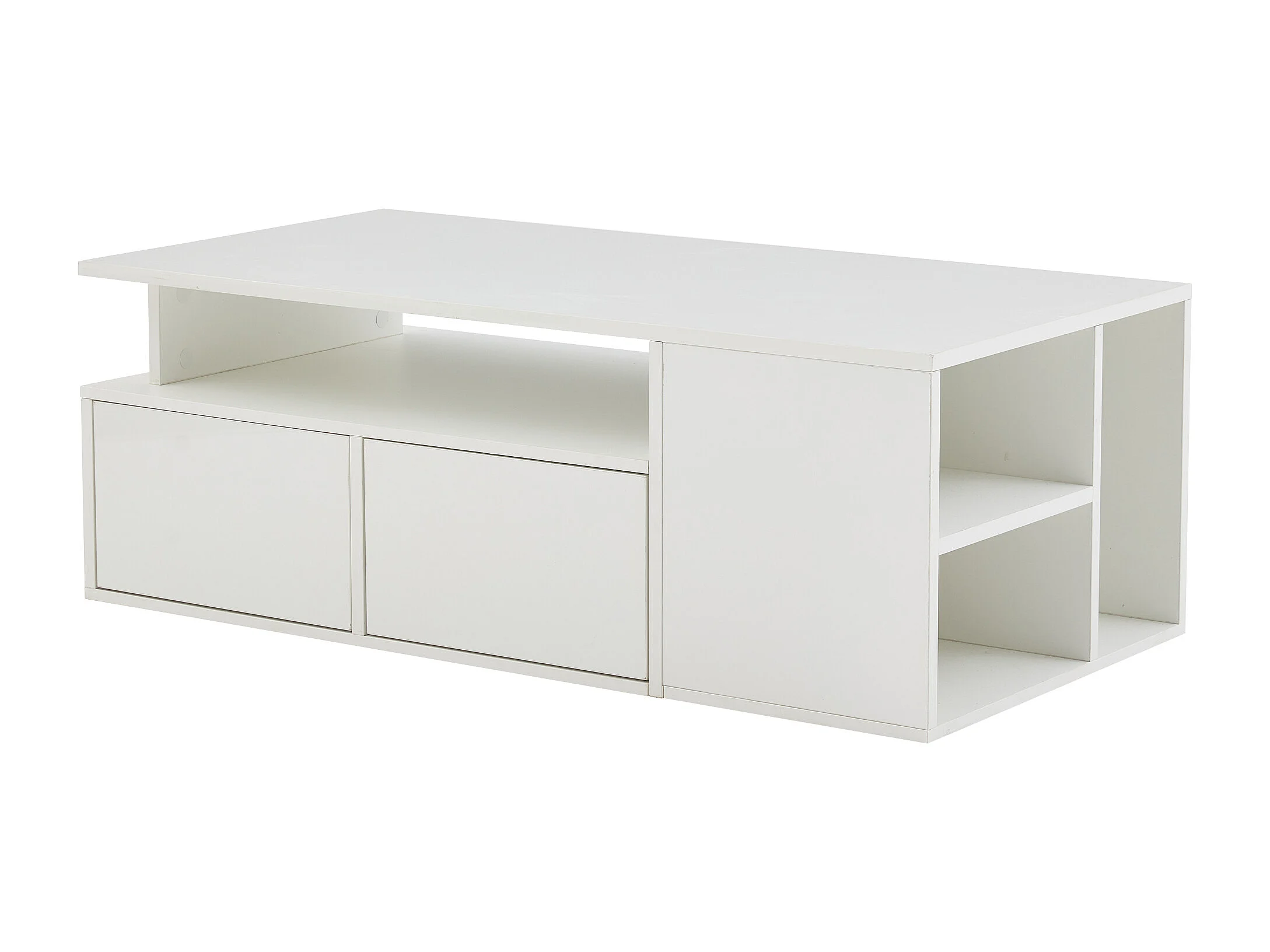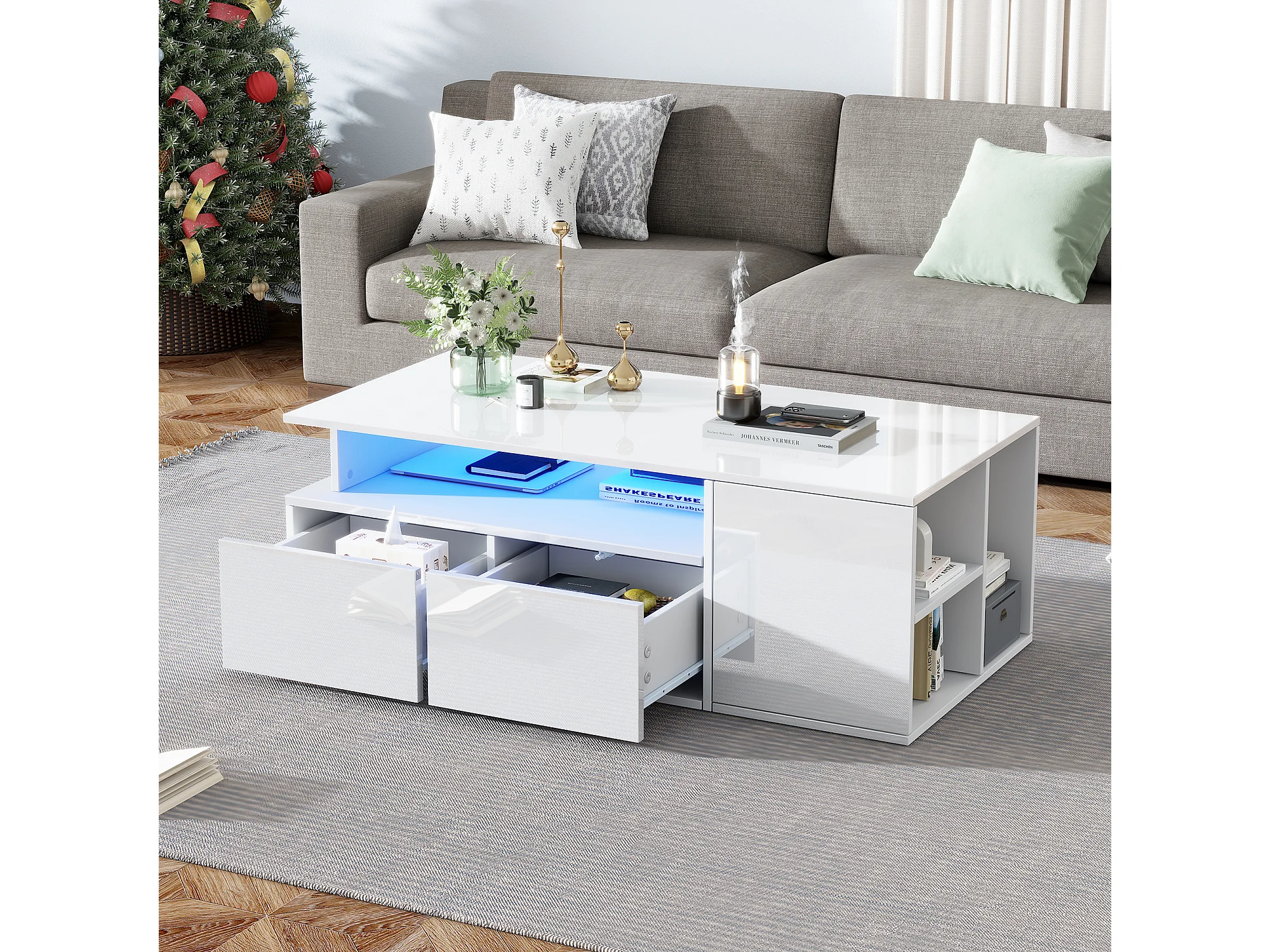 Weißer Couchtisch – Couchtisch mit LED-Beleuchtung und 2 Schubladen – offener Stauraum