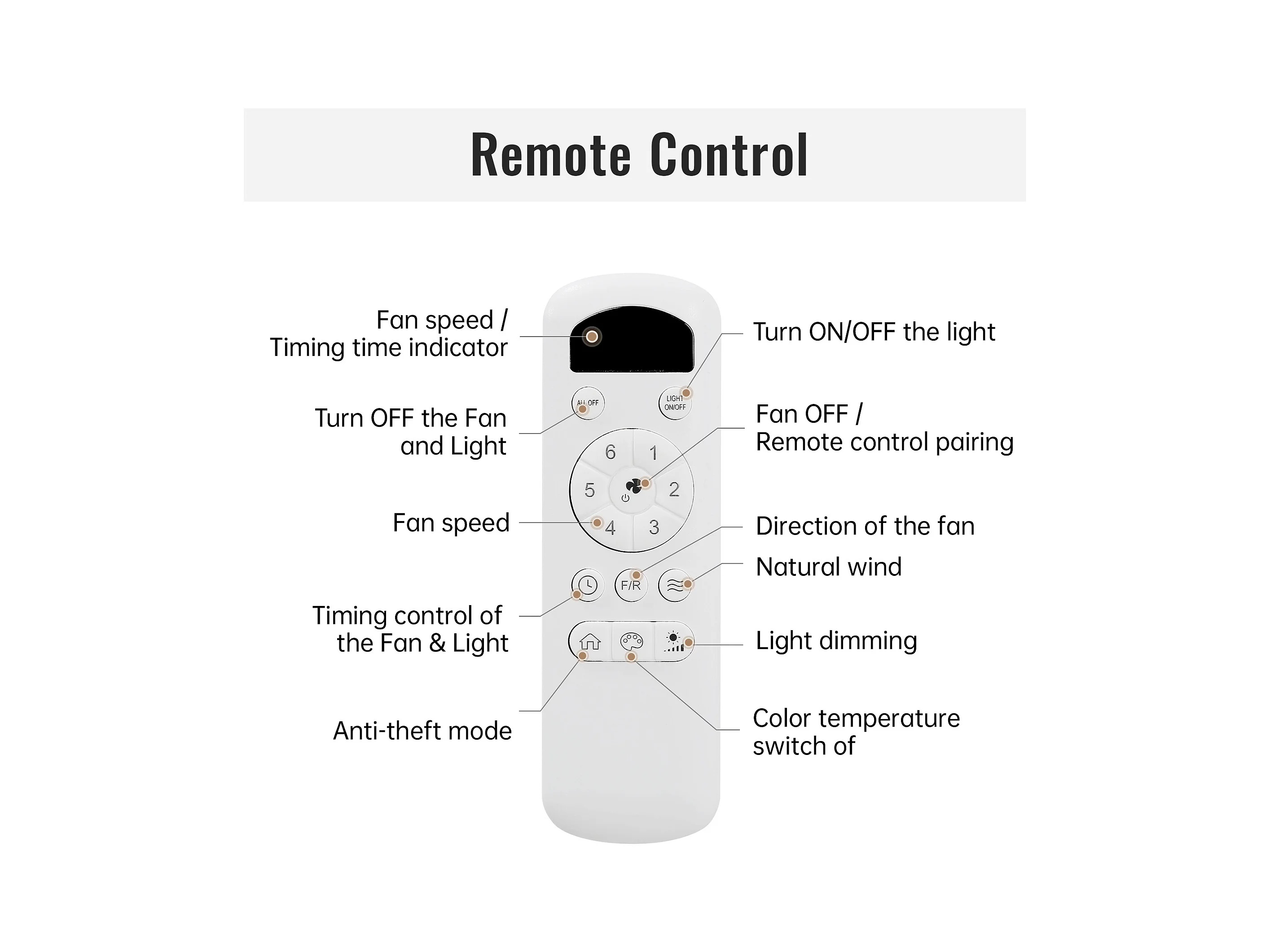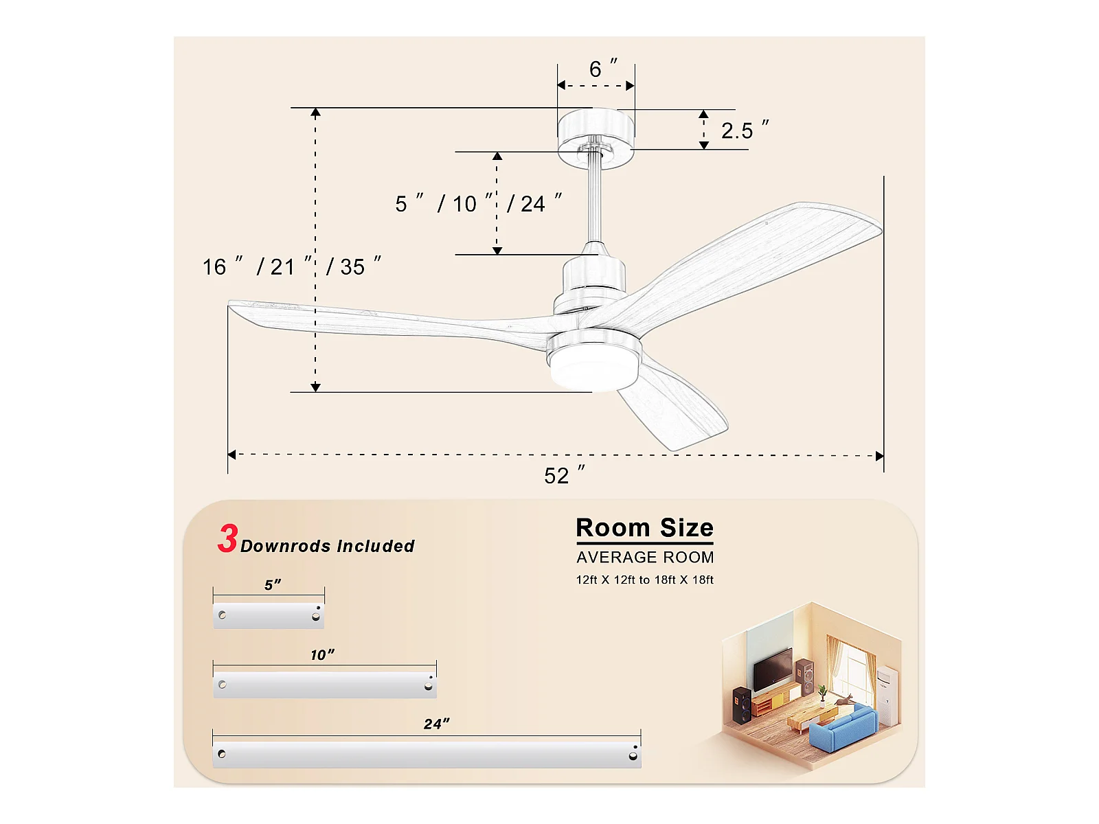 Weißer Deckenventilator - Deckenventilator mit LED-Licht und 6-Gang-Fernbedienung - 3 holzflügel - für wohnzimmer