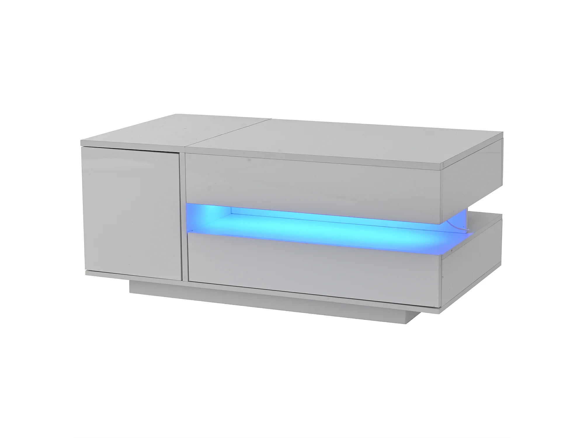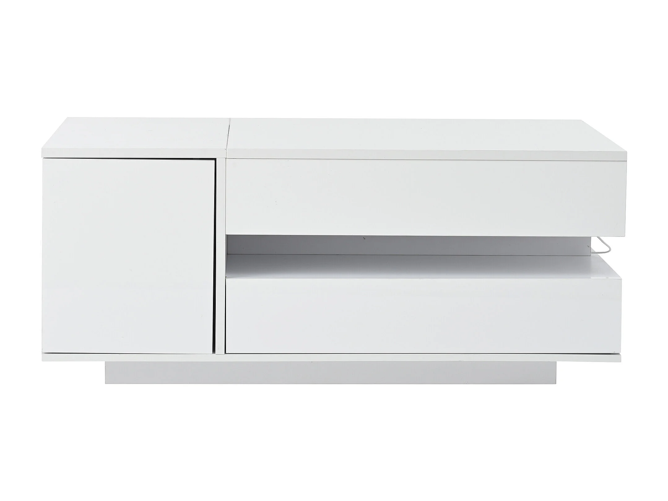 Weißer glänzender Couchtisch mit hochklappbarer Tischplatte, Schubladen und LED-Beleuchtung