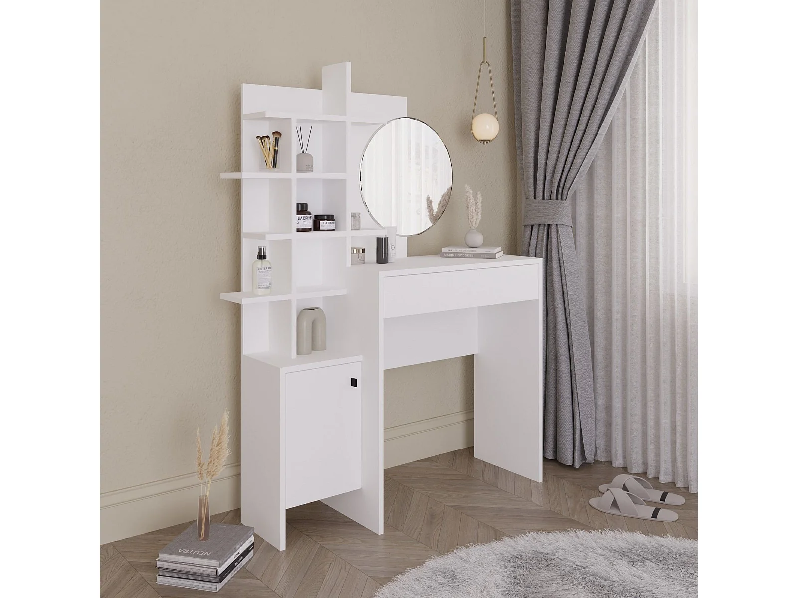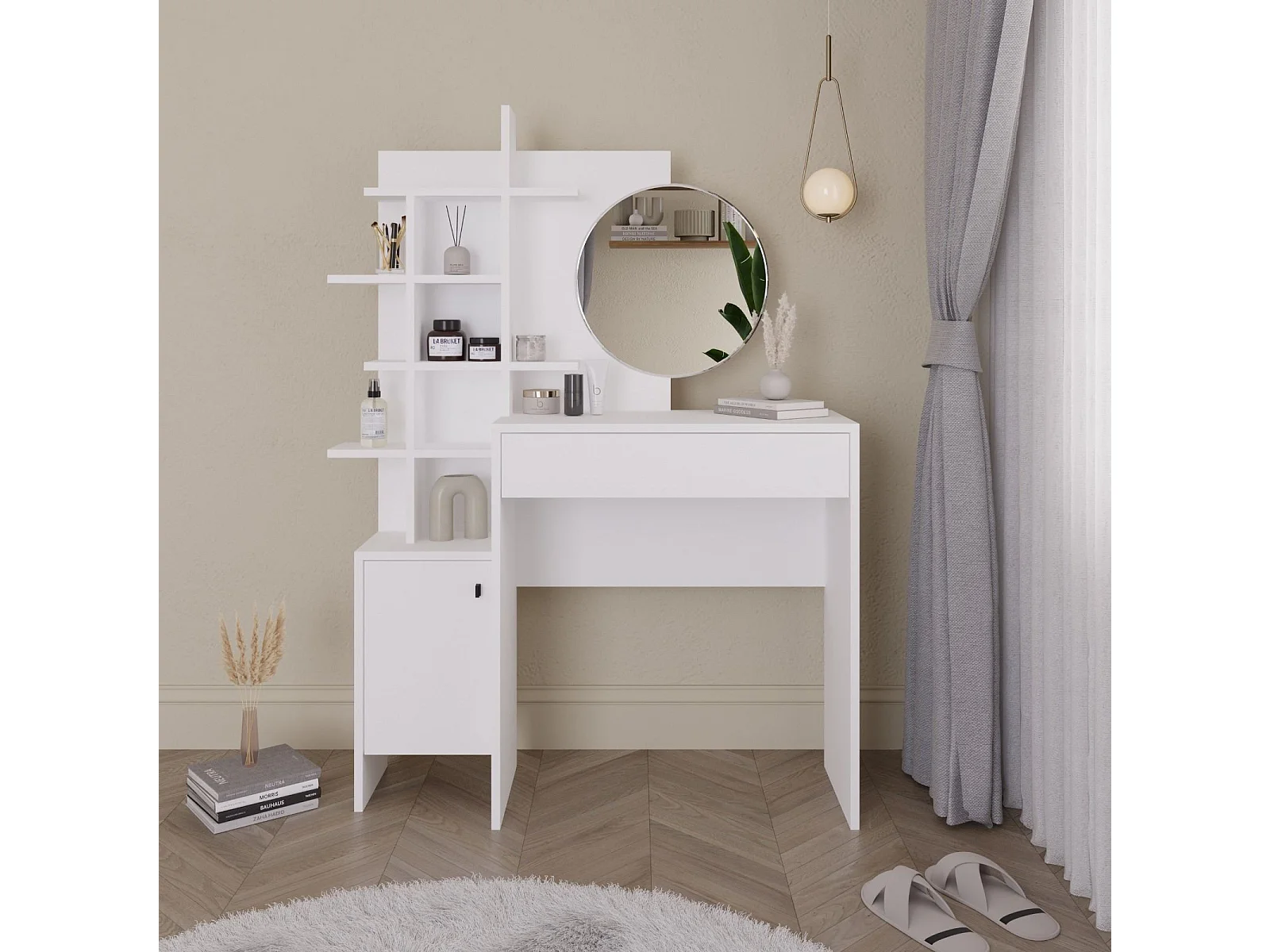 Weißer Schminktisch aus Holz "Mup" 105x35x151 cm mit Spiegel und Stauraum, skandinavisches Design